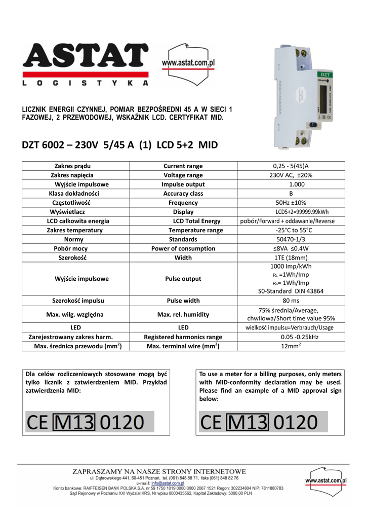 LICZNIK ENERGII CZYNNEJ, POMIAR BEZPOREDNI 45 A W SIECI 1 FAZOWEJ, 2 PRZEWODOWEJ, WSKANIK LCD. CERTYFIKAT MID. DZT 6002 230V 5/45 A (1) LCD 5+2 MID Zakres pr¹du Zakres napiêcia Wyjcie impulsowe Klasa dok³adnoci Czêstotliwoæ Wywietlacz LCD ca³kowita energia Zakres temperatury Normy Pobór mocy Szerokoæ Wyjcie impulsowe Szerokoæ impulsu Current range Voltage range Impulse output Accuracy class Frequency Display LCD Total Energy Temperature range Standards Power of consumption Width Pulse output Pulse width Max. wilg. wzglêdna Max. rel. humidity LED Zarejestrowany zakres harm. Max. rednica przewodu (mm2) LED Registered harmonics range Max. terminal wire (mm2) Dla celów rozliczeniowych stosowane mog¹ byæ tylko licznik z zatwierdzeniem MID. Przyk³ad zatwierdzenia MID: 0,25 5(45)A 230V AC, ±20% 1.000 B 50Hz ±10% LCD5+2=99999.99kWh pobór/Forward + oddawanie/Reverse 25°C to 55°C 504701/3 ≤8VA ≤0.4W 1TE (18mm) 1000 Imp/kWh RL =1Wh/Imp RA= 1Wh/Imp S0Standard DIN 43864 80 ms 75% rednia/Average, chwilowa/Short time value 95% wielkoæ impulsu=Verbrauch/Usage 0.05 0.25kHz 12mm2 To use a meter for a billing purposes, only meters with MIDconformity declaration may be used. Please find an example of a MID approval sign below: Informacja na temat bezpieczeñstwa z wykluczeniem odpowiedzialnoci. Information for your own information and exclusion of liability Niniejsza krótka instrukcja nie zawiera wszystkich stosowanych przepisów bezpieczeñstwa przy u¿ytkowaniu miernika. Równie¿ przez przedsiêbiorstwa, w³adze lokalne, prawo krajowe lub miêdzynarodowe mog¹ byæ wymagane dodatkowe rodki bezpieczeñstwa. Sprawdzilimy zawartoæ tej instrukcji i podjêlimy wszelkie wysi³ki, by zapewniæ jak najbardziej wiarygodny opis urz¹dzenia. Mimo to odchy³ki od opisu nie mog¹ byæ wykluczone, dlatego nie ponosimy odpowiedzialnoci za wszelkiego rodzaju b³êdy i pominiêcia w przedstawionym opisie. This short manual does not contain every applicable safety regulation for using this meter. Also it might be required because of company, local governement regulations or (inter)national laws to take additional measures. We have checked the contents of this manual and every effort has been made to ensure that the descriptions are as accurate as possible. However, deviations from the description cannot be completely ruled out, so that no liability can be accepted for any errors or omissions in the information given. Wykwalifikowany personel Qualified personnel Instalacja i obs³uga opisanego urz¹dzenia w tej instrukcji mo¿e byæ wykonana wy³¹cznie przez wykwalifikowany personel. Tylko osoby, które s¹ upowa¿nione do instalacji, pod³¹czenia i korzystania z tego urz¹dzenia oraz które posiadaj¹ odpowiedni¹ wiedzê o oznaczaniu i uziemieniu urz¹dzeñ elektrycznych i mog¹ zrobiæ to zgodnie z lokalnymi przepisami uwa¿ane s¹ w sensie niniejszej instrukcji za wykwalifikowany personel. Installation and operation of the device described in this manual may only be performed by qualified personnel. Only people that are authorized to install, connect and use this device, who have the proper knowledge about labeling and grounding electrical equipment and circuits and can do so in accordance with local (safety) regulations, are considered qualified personnel in this manual. Wsparcie techniczne. W przypadku pytañ odnonie naszego produktu proszê zwracaæ do lokalnego przedstawiciela. Technical support In case you have any questions about our product, please contact your local supplier. Uwaga: obudowa jest zaplombowana, nie otwieraæ! W przypadku uszkodzenia plomby lub otwarcia obudowy gwarancja wygasa. Attention: Case is sealed, do not open the meter! No warranty if case is opened or warranty seal is removed. 1/3 napiêcie fazowe wej/wyj L 4/6 przewód neutralny wej/wyj N 20/ 21 zaciski wyjcia impulsowego (S0)