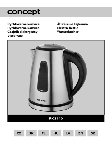 Rychlovarná konvice Rýchlovarná kanvica Czajnik elektryczny Vízforraló Ātrvārāmā tējkanna Electric kettle Wasserkocher RK 3140 CZ SK PL HU LV EN DE CZ PODĚKOVÁNÍ Děkujeme Vám, že jste si zakoupili výrobek značky Concept a přejeme Vám, abyste byli s naším výrobkem spokojeni po celou dobu jeho používání. Před prvním použitím prostudujte pozorně celý návod k obsluze a potom si jej uschovejte. Zajistěte, aby i ostatní osoby, které budou s výrobkem manipulovat, byly seznámeny s tímto návodem. Technické parametry Napětí 220–240 V ~ 50/60 Hz Příkon 1850–2200 W Objem 1,7 l DŮLEŽITÁ BEZPEČNOSTNÍ UPOZORNĚNÍ • Nepoužívejte spotřebič jinak, než je popsáno v tomto návodu. • Před prvním použitím odstraňte ze spotřebiče všechny obaly a marketingové materiály. • Ověřte, zda připojované napětí odpovídá hodnotám na typovém štítku spotřebiče. Používejte pouze zásuvky elektrického napětí s ochranným kolíkem. • Spotřebič je během provozu i určitou dobu po vypnutí horký. Nedotýkejte se proto horkých povrchů. Z důvodu nebezpečí popálení používejte pouze držadlo a tlačítka. • Spotřebič nečistěte, neukládejte ani nezakrývejte, dokud úplně nevychladl. • Nenechávejte spotřebič bez dozoru, pokud je zapnutý, popřípadě zapojený do zásuvky elektrického napětí. • Nikdy nepřenášejte spotřebič během provozu nebo pokud je ještě horký. Nepřenášejte jej za přívodní kabel. • Před připojením nebo vypojením spotřebiče ze zásuvky elektrického napětí se ujistěte, že je vypínač v poloze vypnuto. • Při vypojování spotřebiče ze zásuvky elektrického napětí nikdy netahejte za přívodní kabel, ale uchopte zástrčku a tahem ji vypojte. • Nedovolte dětem a nesvéprávným osobám se spotřebičem manipulovat, používejte ho mimo jejich dosahu. • Osoby se sníženou pohybovou schopností, se sníženým smyslovým vnímáním, s nedostatečnou duševní způsobilostí nebo osoby neseznámené s obsluhou musí používat spotřebič jen pod dozorem zodpovědné a s obsluhou seznámené osoby. • Dbejte zvýšené opatrnosti, pokud je spotřebič používán v blízkosti dětí. • Nedovolte, aby byl spotřebič používán jako hračka. • Nepoužívejte jiné příslušenství, než je doporučeno výrobcem. • Před čištěním a po použití spotřebič vypněte, vypojte ze zásuvky elektrického napětí a nechte vychladnout. • Nenechávejte přívodní kabel viset volně přes hranu stolu. Dbejte na to, aby se nedotýkal horkých povrchů. • Spotřebič umístěte pouze na stabilní a tepelně odolný povrch stranou od jiných zdrojů tepla jako jsou radiátory, trouby apod. Chraňte jej před přímým slunečním zářením a vlhkostí. • Před připojením k síti musí být ve spotřebiči voda. • Nedoplňujte vodu, pokud je spotřebič na podstavci! • Po naplnění spotřebiče vodou se přesvědčte, že je naspodu suchý. Případné kapky před postavením na podstavec otřete! RK 3140 3 CZ • Spotřebič je určen pro ohřev vody dle doporučeného maxima – při větším množství vody, než je doporučené maximum, může dojít k vystřikování vroucí vody – NEBEZPEČÍ OPAŘENÍ! • Před zapnutím spotřebiče se přesvědčte, že je řádně uzavřeno víko. Neotvírejte ho během ohřevu vody, aby nedošlo k opaření. • Spotřebič nedoporučujeme používat k ohřevu jiných kapalin, než je voda. • Nezapínejte spotřebič bez vody. Pokud by přesto došlo k zapnutí prázdného spotřebiče, bezpečnostní pojistka ho automaticky vypne. Poté nechte spotřebič vychladnout, naplňte ho studenou vodou a můžete ho dále používat. • Dbejte zvýšené opatrnosti při otvírání víka, pokud plníte horkou konvici znovu vodou. • Při manipulaci se spotřebičem postupujte tak, aby nedošlo k opaření vařící vodou. Vždy držte spotřebič za držadlo, protože tělo konvice může být horké, a mohlo by dojít k popálení. • Horkou vodu vylévejte pomalu, při nadměrném naklonění se může stát, že voda poteče také víkem – NEBEZPEČÍ OPAŘENÍ! • K čištění spotřebiče nepoužívejte hrubé a chemicky agresivní látky. • Nepoužívejte spotřebič, pokud nepracuje správně, byl-li upuštěn, poškozen nebo namočen do kapaliny. Dejte ho přezkoušet a opravit autorizovaným servisním střediskem. • Nepoužívejte spotřebič s poškozeným přívodním kabelem či zástrčkou, nechte závadu neprodleně odstranit autorizovaným servisním střediskem. • Spotřebič nepoužívejte ve venkovním prostředí. • Spotřebič je vhodný pouze pro použití v domácnosti, není určen pro komerční použití. • Neponořujte přívodní kabel, zástrčku nebo spotřebič do vody ani do jiné kapaliny. • Neopravujte spotřebič sami. Obraťte se na autorizovaný servis. Nedodržíte-li pokyny výrobce, nemůže být případná oprava uznána jako záruční. 4 POPIS VÝROBKU 1. 2. 3. 4. 5. 6. 7. Víko Tělo konvice Vodoznak Tlačítko otevírání víka Držadlo Vypínač s kontrolkou provozu Podstavec s přívodním kabelem 1 6 5 2 3 7 4 RK 3140 CZ UPOZORNĚNÍ: Před prvním použitím doporučujeme minimálně 3× uvařit vodu v maximálním množství a tu vylít. Teprve poté je konvice připravena k použití. Konvice se smí používat pouze s podstavcem, se kterým je dodávána. NÁVOD K OBSLUZE 1. Konvici sejměte z podstavce (7), stiskněte tlačítko (4), otevřete víko (1) a naplňte ji studenou vodou – pouze do povoleného maxima. Pokud by hladina byla nižší než doporučené minimum, konvice by se přehřívala a vypínala by předčasně. Pozn.: Ujistěte se, že je víko (1) správně zavřené, jinak by se konvice automaticky nevypnula. 2. Konvici umístěte na podstavec (7) – dojde k automatickému propojení elektrických ko