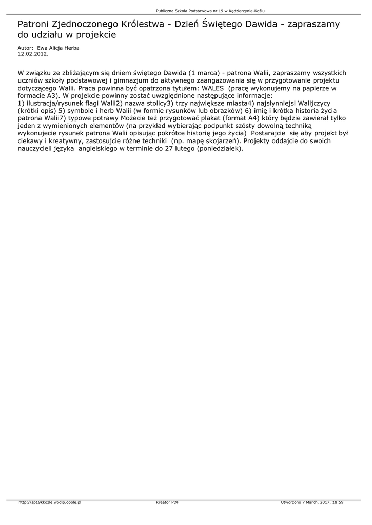 Publiczna Szkoła Podstawowa nr 19 w Kędzierzynie-Koźlu Patroni Zjednoczonego Królestwa - Dzień Świętego Dawida - zapraszamy do udziału w projekcie Autor: Ewa Alicja Herba 12.02.2012. W związku ze zbliżającym się dniem świętego Dawida (1 marca) - patrona Walii, zapraszamy wszystkich uczniów szkoły podstawowej i gimnazjum do aktywnego zaangażowania się w przygotowanie projektu dotyczącego Walii. Praca powinna być opatrzona tytułem: WALES (pracę wykonujemy na papierze w formacie A3). W projekcie powinny zostać uwzględnione następujące informacje: 1) ilustracja/rysunek flagi Walii2) nazwa stolicy3) trzy największe miasta4) najsłynniejsi Walijczycy (krótki opis) 5) symbole i herb Walii (w formie rysunków lub obrazków) 6) imię i krótka historia życia patrona Walii7) typowe potrawy Możecie też przygotować plakat (format A4) który będzie zawierał tylko jeden z wymienionych elementów (na przykład wybierając podpunkt szósty dowolną techniką wykonujecie rysunek patrona Walii opisując pokrótce historię jego życia) Postarajcie się aby projekt był ciekawy i kreatywny, zastosujcie różne techniki (np. mapę skojarzeń). Projekty oddajcie do swoich nauczycieli języka angielskiego w terminie do 27 lutego (poniedziałek). http://sp19kkozle.wodip.opole.pl Kreator PDF Utworzono 7 March, 2017, 18:59