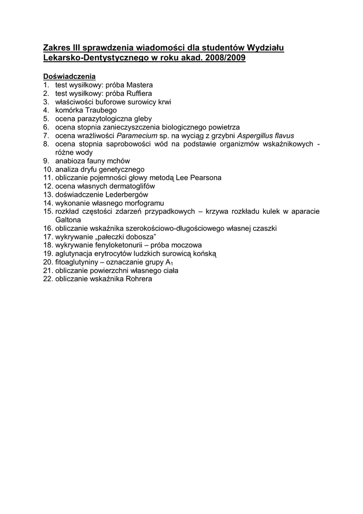 Zakres III sprawdzenia wiadomości dla studentów Wydziału Lekarsko-Dentystycznego w roku akad. 2008/2009 Doświadczenia 1. test wysiłkowy: próba Mastera 2. test wysiłkowy: próba Ruffiera 3. właściwości buforowe surowicy krwi 4. komórka Traubego 5. ocena parazytologiczna gleby 6. ocena stopnia zanieczyszczenia biologicznego powietrza 7. ocena wrażliwości Paramecium sp. na wyciąg z grzybni Aspergillus flavus 8. ocena stopnia saprobowości wód na podstawie organizmów wskaźnikowych różne wody 9. anabioza fauny mchów 10. analiza dryfu genetycznego 11. obliczanie pojemności głowy metodą Lee Pearsona 12. ocena własnych dermatoglifów 13. doświadczenie Lederbergów 14. wykonanie własnego morfogramu 15. rozkład częstości zdarzeń przypadkowych – krzywa rozkładu kulek w aparacie Galtona 16. obliczanie wskaźnika szerokościowo-długościowego własnej czaszki 17. wykrywanie „pałeczki dobosza” 18. wykrywanie fenyloketonurii – próba moczowa 19. aglutynacja erytrocytów ludzkich surowicą końską 20. fitoaglutyniny – oznaczanie grupy A1 21. obliczanie powierzchni własnego ciała 22. obliczanie wskaźnika Rohrera Preparaty makroskopowe 1. Trichophyton sp. 2. płuco człowieka z pylicą węglową 3. płuco człowieka zdrowego 4. Penicillium sp. 5. Aspergillus sp. 6. orzeszki archaidowe Arachis hypogaea z Aspergillus flavus 7. Phytophtora infestans na ziemniaku Solarium tuberosum 8. Cetraria islandica 9. korzeń łubinu z bakteriami Rhizobium sp. 10. Mucor sp. 11. Rhizopus sp. 12. Hirudo medicinalis L. 13. Bufo bufo 14. Atropa belladonna 15. Datura stramonium 16. Secale cornutum 17. Paxillus inovolutus 18. Vespa crabro 19. Apis mellifera 20.Vespula vulgaris 21. Lycoperdon pyriforne 22. Diphyllobothrium latum Preparaty mikroskopowe 1. zarodniki grzybów - różnych 2. Streptomyces sp. 3. Trichuris trichiura - jaja 4. płuco człowieka z pylicą węglową 5. żądło pszczoły 6. żądło osy 7. pyłek Lilium sp. 8. mutanty Drosophila 9. test przynęty włosowej 10. Entomophtora muscae 11. chromosomy metafazowe człowieka 12. chromosomy politeniczne 13. płuco szczura z pylica krzemową 14. Cetraria islandica 15. Anopheles maculipennis – narządy gębowe 16. Trichuris trichiura – osobniki dojrzałe 17. Euglena sp. 18. Microcystis sp. 19. Chlamydomonas sp. 20. Spirogyra sp. 21. Saprolegnia sp. 22. Allium sp.