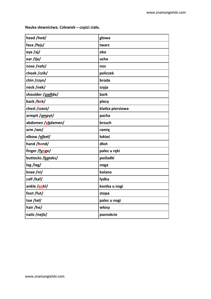 www.znamangielski.com Nauka słownictwa. Człowiek – części ciała. head /hed/ głowa face /fejs/ twarz eye /aj/ oko ear /ije/ ucho nose /nełz/ nos cheek /czik/ policzek chin /czyn/ broda neck /nek/ szyja shoulder /szełlde/ bark back /bek/ plecy chest /czest/ klatka piersiowa armpit /ampyt/ pacha abdomen /ebdemen/ brzuch arm /am/ ramię elbow /elbeł/ łokieć hand /hend/ dłoń finger /fynge/ palec u ręki buttocks /bateks/ pośladki leg /leg/ noga knee /ni/ kolano calf /kaf/ łydka ankle /enkl/ kostka u nogi foot /fut/ stopa toe /teł/ palec u nogi hair /he/ włosy nails /nejlz/ paznokcie www.znamangielski.com