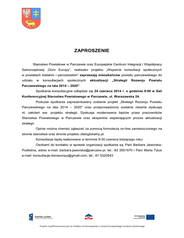 ZAPROSZENIE Starostwo Powiatowe w Parczewie oraz Europejskie Centrum Integracji i Współpracy Samorządowej „Dom Europy”, realizator projektu „Wsparcie konsultacji społecznych w powiatach bialskim i parczewskim” zapraszają mieszkańców powiatu parczewskiego do udziału w konsultacjach społecznych aktualizacji „Strategii Rozwoju Powiatu Parczewskiego na lata 2014 – 2020”. Spotkanie konsultacyjne odbędzie się 24 czerwca 2014 r. o godzinie 9:00 w Sali Konferencyjnej Starostwa Powiatowego w Parczewie, ul. Warszawska 24. Podczas spotkania zaprezentowany zostanie projekt „Strategii Rozwoju Powiatu Parczewskiego na lata 2014 – 2020” oraz przeprowadzona zostanie otwarta dyskusja nt. założeń ww. projektu strategii. Dyskusja moderowana będzie przez pracowników Starostwa Powiatowego w Parczewie oraz ekspertów wspierających proces aktualizacji strategii. Opinie można również zgłaszać za pomocą formularza on-line zamieszczonego na stronie starostwa oraz stronie projektu dialoglokalny.pl. Konsultacje będą realizowane w terminie 9-30 czerwca bieżącego roku. Osobami do kontaktu w sprawie organizacji spotkania są: Pani Barbara JaworskaPodleśna, adres e-mail: [email protected], tel.: 83 3551570 i Pani Marta Tylus e-mail: [email protected], tel.: 81 5320543 PROGRAM KONSULTACJI SPOŁECZNYCH aktualizacji „Strategii Rozwoju Powiatu Parczewskiego na lata 2014 – 2020” 8:45-9:00 Rejestracja uczestników 9:00-9:15 Otwarcie spotkania konsultacyjnego Waldemar Wezgraj – Starosta Parczewski Prof. dr hab. Andrzej Miszczuk – Prezes Stowarzyszenia Europejskie Centrum Integracji i Współpracy Samorządowej „Dom Europy” 9:00-9:15 Prezentacja założeń projektu „Wsparcie konsultacji społecznych w powiatach bialskim i parczewskim” oraz możliwości finansowania projektów w nowej perspektywie finansowej UE 2014-2020 Radosław Dudziński – Wiceprezes Stowarzyszenia Europejskie Centrum Integracji i Współpracy Samorządowej „Dom Europy” 9:15-10:45 Moduł I – Środowisko gospodarcze Prezentacja obszaru, który zostanie poddany konsultacjom Przedstawienie wniosków powstałych w wyniku diagnozy stanu obecnego Analiza SWOT – opis szans i zagrożeń dla powiatu parczewskiego Otwarta dyskusja z mieszkańcami powiatu na temat prezentowanego modułu Moduł koordynuje Pan Krzysztof Robak 11:00 – 12:30 Moduł II – Kultura i nauka Prezentacja obszaru, który zostanie poddany konsultacjom Przedstawienie wniosków powstałych w wyniku diagnozy stanu obecnego Analiza SWOT – opis szans i zagrożeń dla powiatu parczewskiego Otwarta dyskusja z mieszkańcami powiatu na temat prezentowanego modułu Moduł koordynuje Pani Anna Ignatowicz 12:45-14:15 Moduł III – Pomoc społeczna i zdrowie Prezentacja obszaru, który zostanie poddany konsultacjom Przedstawienie wniosków powstałych w wyniku diagnozy stanu obecnego Analiza SWOT – opis szans i zagrożeń dla powiatu parczewskiego Otwarta dyskusja z mieszkańcami powiatu na temat prezentowanego modułu Moduł koordynuje Pani Małgorzata Chilimoniuk 14:15-14:30 Podsumowanie spotkania konsultacyjnego.