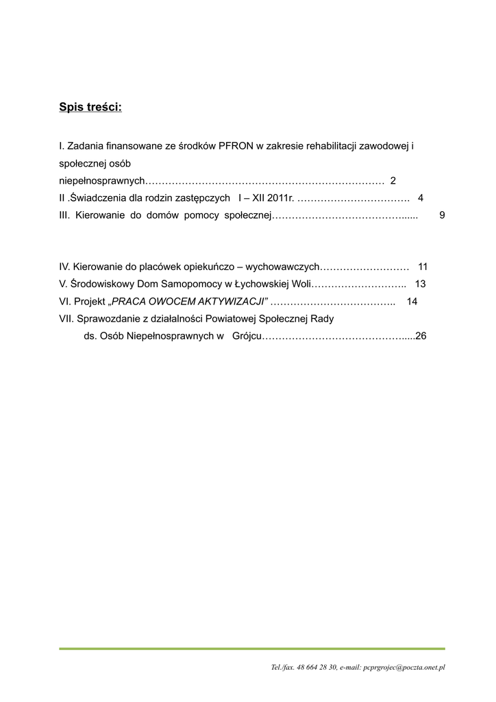 Spis treści: I. Zadania finansowane ze środków PFRON w zakresie rehabilitacji zawodowej i społecznej osób niepełnosprawnych……………………………………………………………… 2 II .Świadczenia dla rodzin zastępczych I – XII 2011r. ……………………………. 4 III. Kierowanie do domów pomocy społecznej…………………………………...... 9 IV. Kierowanie do placówek opiekuńczo – wychowawczych……………………… 11 V. Środowiskowy Dom Samopomocy w Łychowskiej Woli……………………….. 13 VI. Projekt „PRACA OWOCEM AKTYWIZACJI” ……………………………….. 14 VII. Sprawozdanie z działalności Powiatowej Społecznej Rady ds. Osób Niepełnosprawnych w Grójcu…………………………………….....26 Tel./fax. 48 664 28 30, e-mail: [email protected] I. Zadania finansowane ze środków PFRON w zakresie rehabilitacji zawodowej i społecznej osób niepełnosprawnych 1. Stwarzanie możliwości uczestnictwa w turnusach rehabilitacyjnych. O dofinansowanie uczestnictwa w turnusach rehabilitacyjnych w roku 2011r. ubiegało się 319 osób wraz z opiekunami, w tym 107 opiekunów. Przyznano dofinansowanie dla 80 osób na kwotę =62.342,00 zł. Wypłacono dofinansowanie dla 76 osób na łączną kwotę =58.756,00 zł. w tym dla: - dorosłych niepełnosprawnych z zakładów pracy chronionej – 2 dofinansowania na kwotę =1.238,00 zł., - pozostałych dorosłych niepełnosprawnych – 39 dofinansowań na kwotę =33.041,00 zł., - dzieci i młodzieży niepełnosprawnej – 9 dofinansowań na kwotę =8.376,00 zł., -opiekunów dorosłych osób niepełnosprawnych – 18 dofinansowań na kwotę =11.134,00 zł., - opiekunów dzieci i młodzieży niepełnosprawnej – 8 dofinansowań na kwotę =4.967,00 zł. 2. O dofinansowanie likwidacji komunikowaniu się barier architektonicznych, w i technicznych na wnioski indywidualnych osób niepełnosprawnych. O dofinansowanie w 2011r. ubiegało się 20 osób na kwotę 246 128,07zł. Żadne z powyższych barier nie było realizowane. 3. Zaopatrzenie osób niepełnosprawnych w sprzęt rehabilitacyjny, przedmioty ortopedyczne i środki pomocnicze przyznawane na podstawie odrębnych przepisów. Tel./fax. 48 664 28 30, e-mail: [email protected] W 2011 r. do Powiatowego Centrum Pomocy Rodzinie wpłynęło łącznie 299 wniosków na kwotę 391 287,54 zł. W ramach zaopatrzenia w sprzęt rehabilitacyjny zawartych było 13 umów na kwotę 32 377,20 zł. Wypłaconych dofinansowań do zaopatrzenia w sprzęt rehabilitacyjny, przedmioty ortopedyczne i środki pomocnicze było 159 na kwotę 213 434,84 zł w tym: - 40 wniosków dla dzieci i młodzieży niepełnosprawnej na kwotę 62 325,81 zł. - 70 wniosków dla mieszkańców wsi na kwotę 78 600 zł. - 48 wniosków dla kobiet na kwotę 63 020,54 zł. 4. Dofinansowanie kosztów działalności warsztatów terapii zajęciowej. Na terenie powiatu grójeckiego funkcjonują dwa Warsztaty Terapii Zajęciowej dla osób niepełnosprawnych – w Grójcu i w Warce. Są to placówki pobytu dziennego, otwarte od poniedziałku do piątku. Głównym założeniem działania tych jednostek jest rehabilitacja zawodowa uczestników. Efektem pracy wszystkich pracowników WTZ w 2011 r. jest zauważona u wielu uczestników poprawa w zakresie usprawnienia społecznego wyrażającą się w stale wzrastającą integrację w grupach, a także wzrost zaradności i sprawności osobistej uczestników ich samodzielności i umiejętności podejmowania decyzji W 2011 r. dla dwóch Warsztatów Terapii Zajęciowej (40 dorosłych osób niepełnosprawnych intelektualnie i z zaburzeniami psychicznymi) działających na terenie powiatu w Grójcu i w Warce ze środków PFRON wydatkowano na działalność kwotę 591.840,00 zł ., ze środków własnych powiatu grójeckiego– 280.000,00 zł, natomiast z powiatów ościennych których mieszkańcy są uczestnikami naszych Warsztatów dodatkowo wydatkowano 13.152,00 zł. Tel./fax. 48 664 28 30, e-mail: [email protected] II .Świadczenia dla rodzin zastępczych I – XII 2011r W okresie sprawozdawczym na terenie powiatu grójeckiego funkcjonowało 90 rodzin zastępczych. Dla 121 dzieci umieszczonych w tych rodzinach wypłacona została w ciągu 2011 roku pomoc pieniężna w łącznej kwocie 809.974,53zł. W powyższej kwocie zawarte są świadczenia miesięczne na częściowe pokrycie kosztów utrzymania dziecka /1230 świadczeń/, jak również świadczenia losowe oraz jednorazowa pomoc pieniężna na nowo przyjęte dziecko do rodziny zastępczej /13 świadczeń/. W zawodowej niespokrewnionej rodzinie zastępczej o charakterze pogotowia rodzinnego umieszczono 4 dzieci. W 2011r. rodziny zastępcze opuściło 12 pełnoletnich wychowanków, z czego naukę kontynuuje 9 osób. W 2011r.w 9 nowo powstałych spokrewnionych rodzinach zastępczych umieszczono 13 dzieci, a w niespokrewnionych 2 dzieci. Wykres 1. Podział rodzin zastępczych ze względu na rodzaj Tab. 1 Liczba rodzin zastępczych oraz umieszczonych w nich dzieci w poszczególnych gminach na dzień 31.XII.2011r. LP. GMINA LICZBA RODZIN 1. Grójec 22 2. Warka 10 LICZBA DZIECI 29 13 KWOTA wypłaconych świadczeń 234.065,79 101.811,04 3. Chynów 12 15 106.040,41 4. Belsk Duży 2 3 16.950,78 5. Mogielnica 4 5 41.187,44 6. Nowe Miasto 7 9 82.721,52 7. Jasieniec 5 8. Pniewy 6 9. Błędów 4 6 55.307,76 10. Goszczyn 4 4 28.116,23 6 52.417,52 9 91.356,04 Wykres 2. Przyczyny umieszczenia dziecka w Rodzinie Zastępczej Wykres 3. Wiek dzieci umieszczonych w Rodzinach Zastępczych. W 2011 roku PCPR przy współpracy z Poradnią Psychologiczno- Pedagogiczną w Warce zorganizowało cykl spotkań mających na celu stworzenie grupy wsparcia dla rodzin zastępczych powiatu grójeckiego. W okresie od maja do sierpnia odbyło się 5 spotkań, w których za każdym razem uczestniczyło ok. 20 rodzin zastępczych. Spotkania te były prowadzone przez psychologa pracującego w Poradni. Omawiane zaś