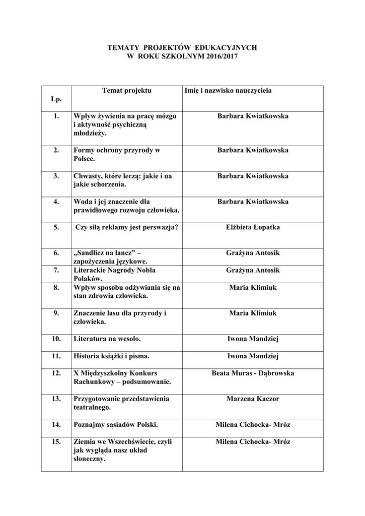 TEMATY PROJEKTÓW EDUKACYJNYCH W ROKU SZKOLNYM 2016/2017 Temat projektu Imię i nazwisko nauczyciela Lp. 1. Wpływ żywienia na pracę mózgu i aktywność psychiczną młodzieży. Barbara Kwiatkowska 2. Formy ochrony przyrody w Polsce. Barbara Kwiatkowska 3. Chwasty, które leczą: jakie i na jakie schorzenia. Barbara Kwiatkowska 4. Woda i jej znaczenie dla prawidłowego rozwoju człowieka. Barbara Kwiatkowska 5. Czy siłą reklamy jest perswazja? Elżbieta Łopatka 6. „Sandłicz na lancz” – zapożyczenia językowe. Literackie Nagrody Nobla Polaków. Wpływ sposobu odżywiania się na stan zdrowia człowieka. Grażyna Antosik 7. 8. Grażyna Antosik Maria Klimiuk 9. Znaczenie lasu dla przyrody i człowieka. Maria Klimiuk 10. Literatura na wesoło. Iwona Mandziej 11. Historia książki i pisma. Iwona Mandziej 12. X Międzyszkolny Konkurs Rachunkowy – podsumowanie. Beata Muras - Dąbrowska 13. Przygotowanie przedstawienia teatralnego. Marzena Kaczor 14. Poznajmy sąsiadów Polski. Milena Cichocka- Mróz 15. Ziemia we Wszechświecie, czyli jak wygląda nasz układ słoneczny. Milena Cichocka- Mróz 16. Jak propagować turystykę rowerową w mojej okolicy? 17. Praktyczna chemia wokół nas. 18. Gotujemy po niemiecku. 19. Znajdę prawa fizyki w moim domu. Dorota Orłowska 20. Historia i funkcjonowanie Sejmu R.P. Marzena Kurzec 21. Zróżnicowanie wybranych państw pod względem środowiska geograficznego i społecznokulturowego. Beata Zawadzka 22. Kampania wrześniowa i działalność partyzancka Polaków. Marzena Kurzec 23. Rosja znana i nieznana. 24. Urząd od podszewki Agnieszka Jelonek- Krupińska 25. Dlaczego herbata jest najpopularniejszym napojem w Wielkiej Brytanii? Najpopularniejsze ciasta w Polsce, USA, Anglii, Walii, Szkocji, Irlandii. Agnieszka Jelonek- Krupińska 26. Milena Cichocka- Mróz Ilona Koziarska Maria Pluta Violetta Kutkowska Agnieszka Jelonek- Krupińska 27. Demokracja- co to takiego? Anna Anwajler 28. Polska walcząca. Anna Anwajler 29. Co ciekawego można zobaczyć w Nowym Jorku? Danuta Ambroziak 30. Wykorzystujemy język angielski w życiu codziennym- scenki rodzajowe. Ortoreksja, anoreksja, bulimia. Danuta Ambroziak 31. Katarzyna Janusz 32. Techniki relaksacyjne. Dobrosława Woźniak 33. Pielęgnacja twarzy nastolatki. Elżbieta Zbudniewek 34. Przeboje muzyki poważnej. 35. Daleko czy blisko ? – różne sposoby pomiaru długości od czasów najdawniejszych po współczesne. Ewa Adamka 36. Symetrie w architekturze. Ewa Adamka 37. Z prawem Archimedesa na Ty. Justyna Podkoń Dariusz Kłosiński Koordynator Barbara Kwiatkowska