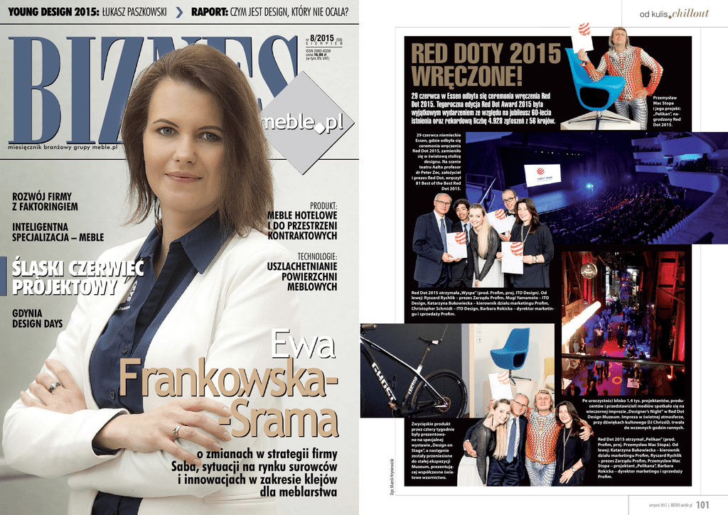Young Design 2015: Łukasz Paszkowski RapoRt: Czym jest design, który nie oCala? od kulis chill chillout 8/2015 RED DOTY 2015 WR�CZONE! nr (58) s i e r p i e ń ISSN 2082-6338 cena:16,90 zł (w tym 8% VAT) 29 czerwca w�Essen odby�a si� ceremonia wr�czenia Red Dot 2015. Tegoroczna edycja Red Dot Award 2015 by�aa wyj�tkowym wydarzeniem ze wzgl�du na jubileusz 60-lecia lecia rajów. istnienia oraz rekordow� liczb� 4.928 zg�osze� z�56 krajów. 29 czerwca niemieckie Essen, gdzie odbyła się ceremonia wręczenia Red Dot 2015, zamieniło się w światową stolicę designu. Na scenie teatru Aalto profesor dr Peter Zec, założyciel i prezes Red Dot, wręczył 81 Best of the Best Red Dot 2015. miesięcznik branżowy grupy meble.pl Rozwój fiRmy z faktoringiem Produkt: meble hotelowe i do przeStrzeni kontraktowych inteligentna Specjalizacja – meble Śląski CzerwieC Projektowy teChnologie: uSzlachetnianie powierzchni meblowych Red Dot 2015 otrzymała „Wyspa” (prod. Profim, proj. ITO Design). Od lewej: Ryszard Rychlik – prezes Zarządu Profim, Mugi Yamamoto – ITO Design, Katarzyna Bukowiecka – kierownik działu marketingu Profim, Christopher Schmidt – ITO Design, Barbara Rokicka – dyrektor marketingu i sprzedaży Profim. Ewa Frankowska-Śrama o zmianach w strategii firmy Saba, sytuacji na rynku surowców i innowacjach w zakresie klejów dla meblarstwa Opr. Marek Hryniewicki gdynia deSign dayS Przemysław Mac Stopa i jego projekt: „Pelikan”, nagrodzony Red Dot 2015. Zwycięskie produkt przez cztery tygodnie były prezentowane na specjalnej wystawie „Design on Stage”, a następnie zostały przeniesione do stałej ekspozycji Muzeum, prezentującej współczesne światowe wzornictwo. Po uroczystości blisko 1,4 tys. projektantów, producentów i przedstawicieli mediów spotkało się na wieczornej imprezie „Designer’s Night” w Red Dot Design Muzeum. Impreza w świetnej atmosferze, przy dźwiękach kultowego DJ ChrissiD, trwała do wczesnych godzin rannych. Red Dot 2015 otrzymał „Pelikan” (prod. Profim, proj. Przemysław Mac Stopa). Od lewej: Katarzyna Bukowiecka – kierownik działu marketingu Profim, Ryszard Rychlik – prezes Zarządu Profim, Przemysław Mac Stopa – projektant „Pelikana”, Barbara Rokicka – dyrektor marketingu i sprzedaży Profim. sierpie� 2015 BIZNES meble.pl 101