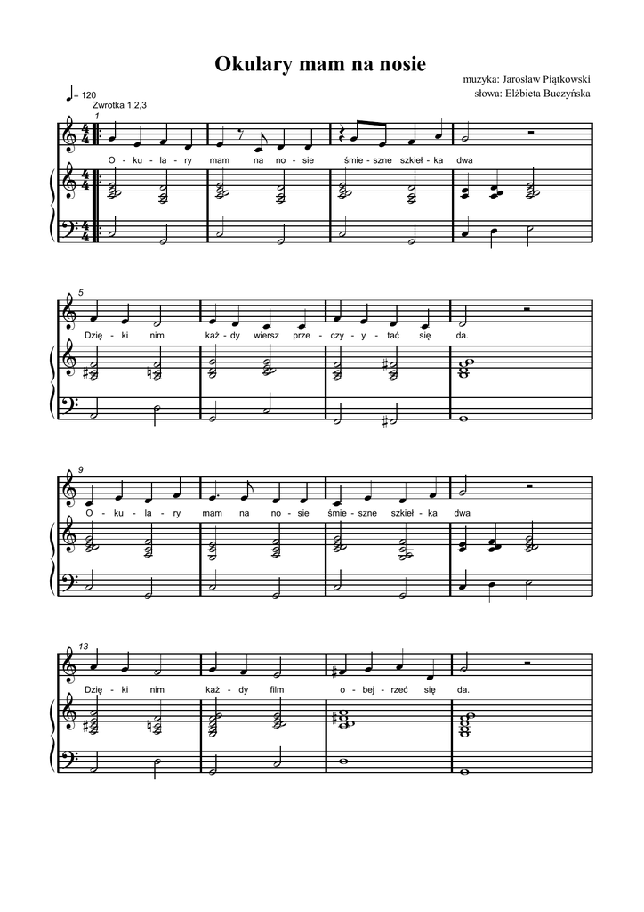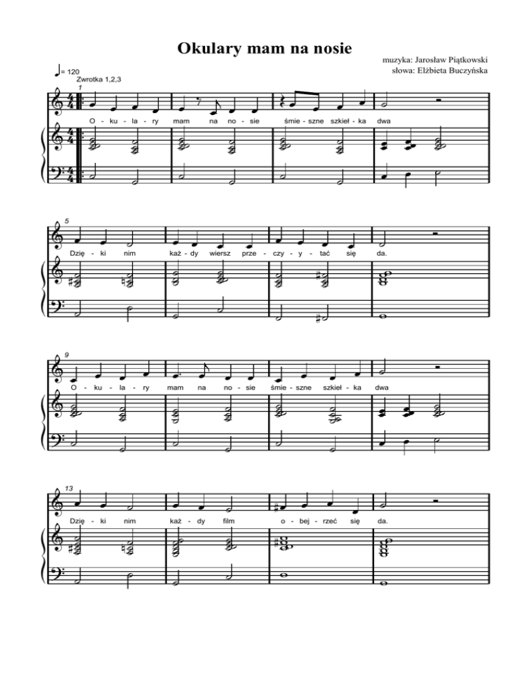 í ⁄ @@ i ) ⁄ @@ i ((( ¤@@ i ( Okulary mam na nosie = 120 Zwrotka 1,2,3 1 ) ) ) (( ( O - ku - la - ry 5 ⁄) ) ( ⁄ $((( &((( ¤( ( Dzię - ki muzyka: Jarosław Piątkowski słowa: Elżbieta Buczyńska ) - )2 ) ) , ) ) ) ) ( ((( (( ((( (( ) )) ((( ( ( ( ( ) ) ( mam na no - sie śmie - szne szkieł - ka dwa )) ) ) ) ) ) ) ( (( ((( (( $(( ''' ( ( ( $( ' nim każ - dy wiersz prze - czy - y - tać się da. 9 ⁄ ) ) ) ) ) ! )2 ) ) ) ) ) ) ( ⁄ ((( (( (( (( ((( ((( ) )) ((( ¤( ( ( ( ( ( ) ) ( O - ku - la ⁄) ) ( ⁄ $((( &((( ¤( ( - 13 Dzię - ki nim ry mam na no - sie ) ) ( ((( ((( ( ( każ - dy film śmie - szne szkieł - ka dwa $) ) ) ) ( $'''' ''' ' ' o - bej - rzeć się da. , ) $) ) ) ) ) ) - )2 - )2 - )2 - )2 ) ) )) )) ))) ) ⁄( , )) ) ) ) ) ) ⁄ -)))2 -))2) -))2) - ))2) - $))2 - ))2 - ))2 - ))2 ¤ ) ) ) ) ) $) ) ) ⁄( ⁄ ((!! ¤) )) 17 ⁄ ⁄ ¤ Refren Zło - te słon - ko I słon - kiem jest w mo - ich 21 ma. ze tym przy - ja ) ) , ) $) - ))2 - ))2 - ))2 - ))2 ) ) ) ) ) ) ) ) ) ) ) )) - )2 - )2 - 2 ) ) ) $) ) ) ) ) ( szkieł - kach -źni - my Z nich się o - ku ) ) ) )! )2 - )2 - )2 - )2 - )2 ) ) )) )) )) ) ) ) ! )2 ) ! )2 (( (( ( ( lu - ster - ka wspa - niałe la 25 ja. ) ) , , - ry nos i i i i
