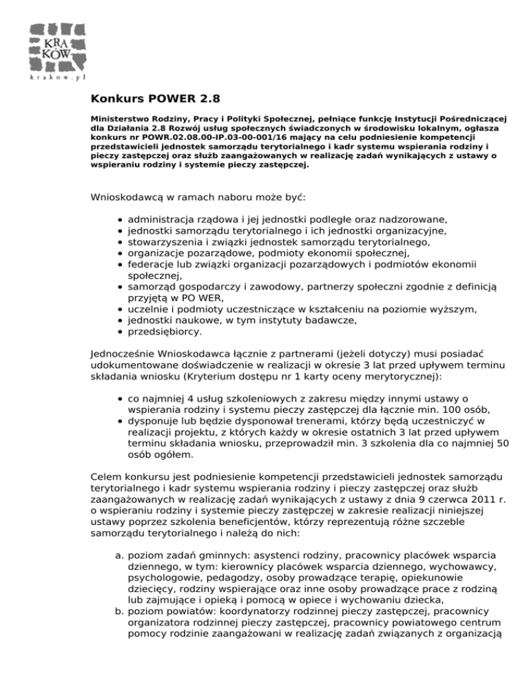 Konkurs POWER 2.8 Ministerstwo Rodziny, Pracy i Polityki Społecznej, pełniące funkcję Instytucji Pośredniczącej dla Działania 2.8 Rozwój usług społecznych świadczonych w środowisku lokalnym, ogłasza konkurs nr POWR.02.08.00-IP.03-00-001/16 mający na celu podniesienie kompetencji przedstawicieli jednostek samorządu terytorialnego i kadr systemu wspierania rodziny i pieczy zastępczej oraz służb zaangażowanych w realizację zadań wynikających z ustawy o wspieraniu rodziny i systemie pieczy zastępczej. Wnioskodawcą w ramach naboru może być: administracja rządowa i jej jednostki podległe oraz nadzorowane, jednostki samorządu terytorialnego i ich jednostki organizacyjne, stowarzyszenia i związki jednostek samorządu terytorialnego, organizacje pozarządowe, podmioty ekonomii społecznej, federacje lub związki organizacji pozarządowych i podmiotów ekonomii społecznej, samorząd gospodarczy i zawodowy, partnerzy społeczni zgodnie z definicją przyjętą w PO WER, uczelnie i podmioty uczestniczące w kształceniu na poziomie wyższym, jednostki naukowe, w tym instytuty badawcze, przedsiębiorcy. Jednocześnie Wnioskodawca łącznie z partnerami (jeżeli dotyczy) musi posiadać udokumentowane doświadczenie w realizacji w okresie 3 lat przed upływem terminu składania wniosku (Kryterium dostępu nr 1 karty oceny merytorycznej): co najmniej 4 usług szkoleniowych z zakresu między innymi ustawy o wspierania rodziny i systemu pieczy zastępczej dla łącznie min. 100 osób, dysponuje lub będzie dysponował trenerami, którzy będą uczestniczyć w realizacji projektu, z których każdy w okresie ostatnich 3 lat przed upływem terminu składania wniosku, przeprowadził min. 3 szkolenia dla co najmniej 50 osób ogółem. Celem konkursu jest podniesienie kompetencji przedstawicieli jednostek samorządu terytorialnego i kadr systemu wspierania rodziny i pieczy zastępczej oraz służb zaangażowanych w realizację zadań wynikających z ustawy z dnia 9 czerwca 2011 r. o wspieraniu rodziny i systemie pieczy zastępczej w zakresie realizacji niniejszej ustawy poprzez szkolenia beneficjentów, którzy reprezentują różne szczeble samorządu terytorialnego i należą do nich: a. poziom zadań gminnych: asystenci rodziny, pracownicy placówek wsparcia dziennego, w tym: kierownicy placówek wsparcia dziennego, wychowawcy, psychologowie, pedagodzy, osoby prowadzące terapię, opiekunowie dziecięcy, rodziny wspierające oraz inne osoby prowadzące prace z rodziną lub zajmujące i opieką i pomocą w opiece i wychowaniu dziecka, b. poziom powiatów: koordynatorzy rodzinnej pieczy zastępczej, pracownicy organizatora rodzinnej pieczy zastępczej, pracownicy powiatowego centrum pomocy rodzinie zaangażowani w realizację zadań związanych z organizacją pieczy zastępczej, pracownicy placówek opiekuńczo – wychowawczych, w tym: dyrektor placówek opiekuńczo-wychowawczych (lub centrum), w tym również placówek typu rodzinnego, pedagog, psycholog, osoba prowadzącą terapię, opiekun dziecięcy, pracownik socjalny w placówce, rodziny zastępcze oraz prowadzący rodzinne domy dziecka, c. poziom województwa (marszałek): pracownicy regionalnych placówek opiekuńczo-terapeutycznych, interwencyjnych ośrodków preadopcyjnych oraz ośrodków adopcyjnych, d. poziom wojewody: pracownicy wojewody realizujący zadania z zakresu wspierania rodziny i systemu pieczy zastępczej. Szkolenia obejmują uzupełniająco również następujące grupy osób, tj.: a. przedstawicieli wymiaru sprawiedliwości (sędziów, kuratorów,) i/lub; b. przedstawicieli oświaty (m.in. pedagogów i psychologów szkolnych, wychowawców) i/lub; c. przedstawicieli systemu zdrowia (lekarze, pielęgniarki) i/lub; d. inne służby pracujące z dziećmi i rodzinami biologicznymi, osobami sprawującymi pieczę zastępczą i rodzinami adopcyjnymi. Osoby te mogą stanowić nie więcej niż 30% uczestników projektu. Ogólna pula środków przeznaczona na dofinansowanie projektów wynosi 21 654 000 PLN. Maksymalny dopuszczalny poziom dofinansowania projektu uzależniony jest od makroregionu (makroregion południowy - województwa: małopolskie, śląskie, dolnośląskie, opolskie – szkolenia dla co najmniej 2 597 osób, maksymalna wartość projektu wynosi 5 194 000 PLN). Wnioski można składać w terminie od 01.09.2016 r. do 30.09.2016 r. Więcej informacji o naborze znajduje się na stronie: https://www.power.gov.pl/nabory/28-rozwoj-uslug-spolecznych-swiadczonych-w-srodo wisku-lokalnym-1/ Powered by TCPDF (www.tcpdf.org)
