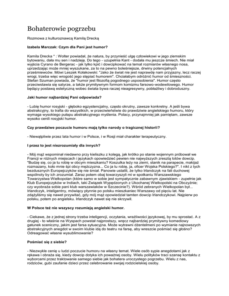 Bohaterowie pogrzebu Rozmowa z kulturoznawcą Kamilą Drecką Izabela Marczak: Czym dla Pani jest humor? Kamila Drecka * : Wolter powiadał, że natura, by przynieść ulgę człowiekowi w jego ziemskim bytowaniu, dała mu sen i nadzieję. Do tego - uzupełnia Kant - dodała mu jeszcze śmiech. Nie miał wyjścia Cyrano de Bergerac - jak tylko kpić i dowcipkować na temat rozmiarów własnego nosa, uprzedzając może mniej wyszukane, za to na pewno boleśniejsze, drwiny potencjalnych prześmiewców. Mówi Leszek Kołakowski: "Jako że świat nie jest naprawdę nam przyjazny, lecz raczej wrogi, trzeba więc wrogość jego stępiać humorem". Chciałabym odróżnić humor od śmieszności. Stefan Szuman powiada, że "humor jest filozofią pogodnego usposobienia". Humor często przeciwstawia się satyrze, a także prymitywnym formom komizmu farsowo-wodewilowego. Humor będący postawą estetyczną wobec świata bywa raczej nieagresywny, pobłażliwy i dobroduszny. Jaki humor najbardziej Pani odpowiada? - Lubię humor rosyjski - głęboko egzystencjalny, często okrutny, zawsze konkretny. A jeśli bywa abstrakcyjny, to trafia do wszystkich, w przeciwieństwie do prawdziwie angielskiego humoru, który wymaga wysokiego pułapu abstrakcyjnego myślenia. Polacy, przynajmniej jak pamiętam, zawsze wysoko cenili rosyjski humor. Czy prawdziwe poczucie humoru mają tylko narody o tragicznej historii? - Niewątpliwie przez lata humor i w Polsce, i w Rosji miał charakter terapeutyczny. I przez to jest niezrozumiały dla innych? - Mój mąż wspominał niedawno przy kieliszku z kolegą, jak krótko po stanie wojennym próbował we Francji w różnych miejscach i językach opowiedzieć pewien nie najwyższych zresztą lotów dowcip. "Budzę się, co ja tu robię w obcym mieszkaniu? Koszulka leży na ziemi, stanik na parapecie, makijaż rozmazany, koło mnie śpi obcy mężczyzna... Co ja tu robię, ja, oficer Wojska Polskiego?". I nikt z tych bezdusznych Europejczyków się nie śmiał. Panowie ustalili, że tylko Irlandczyk na fali duchowej wspólnoty by ich zrozumiał. Zaraz potem obaj towarzyszyli mi w spotkaniu Warszawskiego Towarzystwa Wielkopolan (które samo w sobie jest sympatycznie zabawnym zjawiskiem - zupełnie jak Klub Europejczyków w Indiach, taki Związek Wypędzonych z Ukochanej Wielkopolski na Obczyźnie; czy wyobraża sobie pani klub warszawiaków w Szczecinie?). Wśród zebranych Wielkopolan był... Irlandczyk, inteligentny, mówiący płynnie po polsku mieszkaniec Warszawy od pięciu lat. Nie zdążyliśmy się nawet przywitać, gdy mój mąż opowiedział tamten dowcip Irlandczykowi. Najpierw po polsku, potem po angielsku. Irlandczyk nawet się nie skrzywił. W Polsce też nie wszyscy rozumieją angielski humor. - Ciekawe, że z jednej strony trzeba inteligencji, oczytania, wrażliwości językowej, by mu sprostać. A z drugiej - to właśnie na Wyspach powstał najprostszy, wręcz najbardziej prymitywny komediowy gatunek sceniczny, jakim jest farsa sytuacyjna. Może wytrawni dżentelmeni po wymianie najnowszych abstrakcyjnych anegdot w swoim klubie idą do teatru na farsę, aby wreszcie pośmiać się głośno? Odreagować własne wysublimowanie? Pośmiać się z siebie? - Niezwykle cenię u ludzi poczucie humoru na własny temat. Wiele osób sypie anegdotami jak z rękawa i obraża się, kiedy dowcip dotyka ich poważnej osoby. Wielu polityków traci szansę kontaktu z wyborcami przez traktowanie samego siebie jak bohatera uroczystego pogrzebu. Wielu z nas, rodziców, gubi zaufanie dzieci przez celebrowanie swojej rodzicielskiej osoby. Czy człowiek z poczuciem humoru jest szczęśliwszy? - Szczęście jest o wiele poważniejszym słowem niż humor. Rozumiem pani pytanie tak: czy szczęśliwy może być człowiek bez poczucia humoru? Pewnie tak, szczególnie że o tym nie wie. Proszę zwrócić uwagę, że ludzie przyznają się do najgorszych rzeczy - ale nigdy do tego, że brak im poczucia humoru. * Kamila Drecka jest kulturoznawcą, autorką programu TV "Ogród sztuk" Żarty przed skokiem Rozmowa z psychologiem prof. Mieczysławem Koftą Izabela Marczak: Czy poczucie humoru zależy od inteligencji? Mieczysław Kofta * : Choć w staropolszczyźnie "dowcip" oznaczał bystrość, zalety umysłu, to myślę, że związek między poziomem inteligencji ogólnej a poczuciem humoru jest bardzo pośredni. Zdarzają się przecież ponure typy bardzo sprawne umysłowo i osiągające sukcesy zawodowe. Inteligencja może przejawiać się w różny sposób. Zaś poczucie humoru to przede wszystkim umiejętność niesztampowego spojrzenia na sytuację, dostrzeżenia jej komicznego aspektu, a zarazem spontanicznego, emocjonalnego na nią reagowania. Wydaje mi się ono bliższa inteligencji emocjonalnej i społecznej oraz uzdolnieniom twórczym człowieka niż inteligencji ogólnej (poznawczej) mierzonej sławnym IQ. Nie przypadkiem więc Abraham Maslow (współtwórca psychologii humanistycznej) uznawał poczucie humoru za składnik dojrzałej, zdrowej osobowości. Jakie rodzaje humoru wyróżnia psychologia? - Wszelka próba sklasyfikowania rodzajów i odmian humoru wydaje mi się nie tylko z góry skazana na niepowodzenie, ale, co gorsza, śmieszna! Humor jest po prostu aspektem naszego życia. Przenika kulturę popularną (np. sitcomy, komiksy, dowcipy rysunkowe) i kulturę wysoką (np. literaturę piękną). Zabarwia nasze codzienne doświadczenia: żartujemy z nieznanymi osobami w kolejce, śmieszy nas pompatyczne zachowanie przełożonego, czujemy, że sami się przed chwilą ośmieszyliśmy itp. Humor jest przeciwieństwem powagi, bycia serio - dlatego też tak często śmieszą nas oficjalne ceremoniały. Po co nam poczucie humoru? - Oczywiste, że kiedy jesteśmy w dobrym nastroju, chętnie żartujemy i śmiejemy się, bawią nas dowcipy. A kiedy jesteśmy podenerwowani, zalęknieni, przygnębieni - nasze poczucie humoru gwałtownie słabnie. Z drugiej strony, żartowanie może być