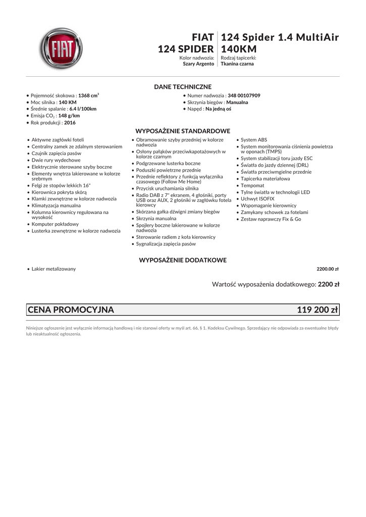 FIAT 124 Spider 1.4 MultiAir 124 SPIDER 140KM Kolor nadwozia: Szary Argento Rodzaj tapicerki: Tkanina czarna DANE TECHNICZNE • Pojemność skokowa : 1368 cm3 • Moc silnika : 140 KM • Średnie spalanie : 6.4 l/100km • Emisja CO2 : 148 g/km • Rok produkcji : 2016 • Numer nadwozia : 348 00107909 • Skrzynia biegów : Manualna • Napęd : Na jedną oś WYPOSAŻENIE STANDARDOWE • • • • • • • • • • • • • Aktywne zagłówki foteli Centralny zamek ze zdalnym sterowaniem Czujnik zapięcia pasów Dwie rury wydechowe Elektrycznie sterowane szyby boczne Elementy wnętrza lakierowane w kolorze srebrnym Felgi ze stopów lekkich 16" Kierownica pokryta skórą Klamki zewnętrzne w kolorze nadwozia Klimatyzacja manualna Kolumna kierownicy regulowana na wysokość Komputer pokładowy Lusterka zewnętrzne w kolorze nadwozia • Obramowanie szyby przedniej w kolorze nadwozia • Osłony pałąków przeciwkapotażowych w kolorze czarnym • Podgrzewane lusterka boczne • Poduszki powietrzne przednie • Przednie reflektory z funkcją wyłącznika czasowego (Follow Me Home) • Przycisk uruchamiania silnika • Radio DAB z 7" ekranem, 4 głośniki, porty USB oraz AUX, 2 głośniki w zagłówku fotela kierowcy • Skórzana gałka dźwigni zmiany biegów • Skrzynia manualna • Spojlery boczne lakierowane w kolorze nadwozia • Sterowanie radiem z koła kierownicy • Sygnalizacja zapięcia pasów • System ABS • System monitorowania ciśnienia powietrza w oponach (TMPS) • System stabilizacji toru jazdy ESC • Światła do jazdy dziennej (DRL) • Światła przeciwmgielne przednie • Tapicerka materiałowa • Tempomat • Tylne światła w technologii LED • Uchwyt ISOFIX • Wspomaganie kierownicy • Zamykany schowek za fotelami • Zestaw naprawczy Fix & Go WYPOSAŻENIE DODATKOWE • Lakier metalizowany 2200.00 zł Wartość wyposażenia dodatkowego: 2200 zł CENA PROMOCYJNA 119 200 zł Niniejsze ogłoszenie jest wyłącznie informacją handlową i nie stanowi oferty w myśl art. 66, § 1. Kodeksu Cywilnego. Sprzedający nie odpowiada za ewentualne błędy lub nieaktualność ogłoszenia.