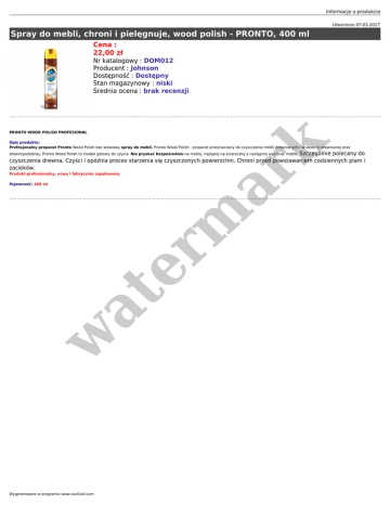 Informacje o produkcie Utworzono 07-03-2017 Spray do mebli, chroni i pielęgnuje, wood polish - PRONTO, 400 ml Cena : 22,00 zł Nr katalogowy : DOM012 Producent : Johnson Dostępność : Dostępny Stan magazynowy : niski Średnia ocena : brak recenzji PRONTO WOOD POLISH PROFESIONAL er m ar k Opis produktu: Profesjonalny preparat Pronto Wood Polish bez woskowy spray do mebli. Pronto Wood Polish - preparat przeznaczony do czyszczenia mebli drewnianych i w okleinie drewnianej oraz drewnopodobnej. Pronto Wood Polish to środek gotowy do użycia. Nie pryskać bezpośrednio na meble, najlepiej na ściereczkę a następnie wycierać meble. Szczególnie polecany do czyszczenia drewna. Czyści i opóźnia proces starzenia się czyszczonych powierzchni. Chroni przed powstawaniem codziennych plam i zacieków. Produkt profesjonalny, nowy i fabrycznie zapakowany w at Pojemność: 400 ml Wygenerowano w programie www.oscGold.com