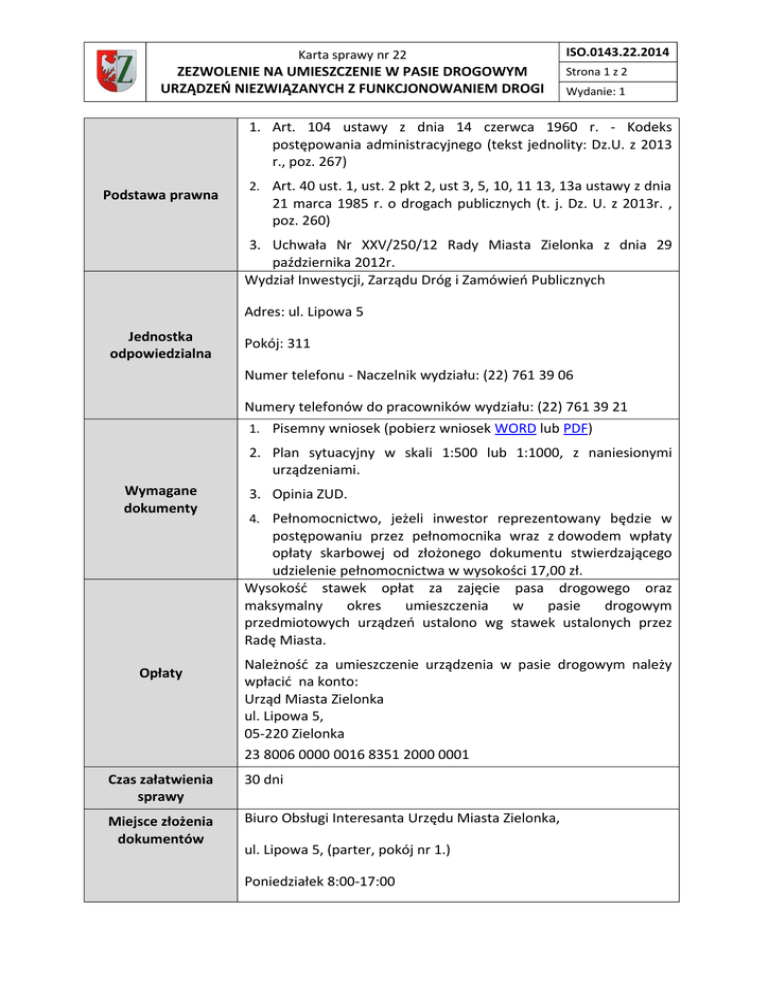 Karta sprawy nr 22 ZEZWOLENIE NA UMIESZCZENIE W PASIE DROGOWYM URZĄDZEŃ NIEZWIĄZANYCH Z FUNKCJONOWANIEM DROGI ISO.0143.22.2014 Strona 1 z 2 Wydanie: 1 1. Art. 104 ustawy z dnia 14 czerwca 1960 r. - Kodeks postępowania administracyjnego (tekst jednolity: Dz.U. z 2013 r., poz. 267) Podstawa prawna 2. Art. 40 ust. 1, ust. 2 pkt 2, ust 3, 5, 10, 11 13, 13a ustawy z dnia 21 marca 1985 r. o drogach publicznych (t. j. Dz. U. z 2013r. , poz. 260) 3. Uchwała Nr XXV/250/12 Rady Miasta Zielonka z dnia 29 października 2012r. Wydział Inwestycji, Zarządu Dróg i Zamówień Publicznych Adres: ul. Lipowa 5 Jednostka odpowiedzialna Pokój: 311 Numer telefonu - Naczelnik wydziału: (22) 761 39 06 Numery telefonów do pracowników wydziału: (22) 761 39 21 1. Pisemny wniosek (pobierz wniosek WORD lub PDF) 2. Plan sytuacyjny w skali 1:500 lub 1:1000, z naniesionymi urządzeniami. Wymagane dokumenty 3. Opinia ZUD. 4. Pełnomocnictwo, jeżeli inwestor reprezentowany będzie w postępowaniu przez pełnomocnika wraz z dowodem wpłaty opłaty skarbowej od złożonego dokumentu stwierdzającego udzielenie pełnomocnictwa w wysokości 17,00 zł. Wysokość stawek opłat za zajęcie pasa drogowego oraz maksymalny okres umieszczenia w pasie drogowym przedmiotowych urządzeń ustalono wg stawek ustalonych przez Radę Miasta. Opłaty Należność za umieszczenie urządzenia w pasie drogowym należy wpłacić na konto: Urząd Miasta Zielonka ul. Lipowa 5, 05-220 Zielonka 23 8006 0000 0016 8351 2000 0001 Czas załatwienia sprawy 30 dni Miejsce złożenia dokumentów Biuro Obsługi Interesanta Urzędu Miasta Zielonka, ul. Lipowa 5, (parter, pokój nr 1.) Poniedziałek 8:00-17:00 ISO.0143.22.2014 Karta sprawy nr 22 ZEZWOLENIE NA UMIESZCZENIE W PASIE DROGOWYM URZĄDZEŃ NIEZWIĄZANYCH Z FUNKCJONOWANIEM DROGI Strona 2 z 2 Wydanie: 1 Wtorek – Czwartek 8:00-16:00 Piątek 8:00-15:00 Miejsce i sposób odbioru dokumentów Powiadomienie o odbiorze decyzji nastąpi w formie e-maila lub telefonicznie. Decyzje wysyłane są pocztą lub odbiór osobisty w pok. 311 Tryb odwoławczy Samorządowe Kolegium Odwoławcze za pośrednictwem organu, który wydał decyzję w terminie 14 dni od dnia doręczenia decyzji. Uwagi Urządzenia mogą być umieszczone w pasie drogi po uprzednim otrzymaniu decyzji zezwalającej na zajęcie pasa drogowego oraz wyliczonej wysokości opłat . Wykonanie robót bez uzyskania zezwolenia na zajęcie pasa drogowego podlega wysokim karom pieniężnym. Liczba załączników Opracował: Sylwia Kołbuk 1 ……………………………… data i podpis Zatwierdził: Beata Dziuk ……………………………… data i podpis