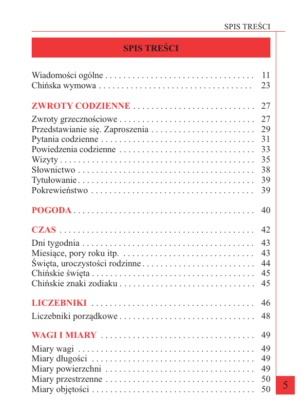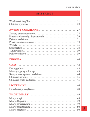 SPIS TREŚCI SPIS TREŚCI Wiadomości ogólne . . . . . . . . . . . . . . . . . . . . . . . . . . . . . . . . . 11 Chińska wymowa . . . . . . . . . . . . . . . . . . . . . . . . . . . . . . . . . . 23 ZWROTY CODZIENNE . . . . . . . . . . . . . . . . . . . . . . . . . . . Zwroty grzecznościowe . . . . . . . . . . . . . . . . . . . . . . . . . . . . . . Przedstawianie się. Zaproszenia . . . . . . . . . . . . . . . . . . . . . . . Pytania codzienne . . . . . . . . . . . . . . . . . . . . . . . . . . . . . . . . . . Powiedzenia codzienne . . . . . . . . . . . . . . . . . . . . . . . . . . . . . . Wizyty . . . . . . . . . . . . . . . . . . . . . . . . . . . . . . . . . . . . . . . . . . . Słownictwo . . . . . . . . . . . . . . . . . . . . . . . . . . . . . . . . . . . . . . . Tytułowanie . . . . . . . . . . . . . . . . . . . . . . . . . . . . . . . . . . . . . . . Pokrewieństwo . . . . . . . . . . . . . . . . . . . . . . . . . . . . . . . . . . . . 27 27 29 31 33 35 38 39 39 CZAS . . . . . . . . . . . . . . . . . . . . . . . . . . . . . . . . . . . . . . . . . . . Dni tygodnia . . . . . . . . . . . . . . . . . . . . . . . . . . . . . . . . . . . . . . Miesiące, pory roku itp. . . . . . . . . . . . . . . . . . . . . . . . . . . . . . Święta, uroczystości rodzinne . . . . . . . . . . . . . . . . . . . . . . . . . Chińskie święta . . . . . . . . . . . . . . . . . . . . . . . . . . . . . . . . . . . . Chińskie znaki zodiaku . . . . . . . . . . . . . . . . . . . . . . . . . . . . . . 42 43 43 44 45 45 WAGI I MIARY . . . . . . . . . . . . . . . . . . . . . . . . . . . . . . . . . . Miary wagi . . . . . . . . . . . . . . . . . . . . . . . . . . . . . . . . . . . . . . . Miary długości . . . . . . . . . . . . . . . . . . . . . . . . . . . . . . . . . . . . Miary powierzchni . . . . . . . . . . . . . . . . . . . . . . . . . . . . . . . . . Miary przestrzenne . . . . . . . . . . . . . . . . . . . . . . . . . . . . . . . . . Miary objętości . . . . . . . . . . . . . . . . . . . . . . . . . . . . . . . . . . . . 49 49 49 49 50 50 POGODA . . . . . . . . . . . . . . . . . . . . . . . . . . . . . . . . . . . . . . . . 40 LICZEBNIKI . . . . . . . . . . . . . . . . . . . . . . . . . . . . . . . . . . . . 46 Liczebniki porządkowe . . . . . . . . . . . . . . . . . . . . . . . . . . . . . . 48 5 SPIS TREŚCI NAJCZĘŚCIEJ UŻYWANE ZWROTY I WYRAZY . . . . 50 Na poczcie . . . . . . . . . . . . . . . . . . . . . . . . . . . . . . . . . . . . . . . . Na plaży . . . . . . . . . . . . . . . . . . . . . . . . . . . . . . . . . . . . . . . . . W tramwaju, autobusie . . . . . . . . . . . . . . . . . . . . . . . . . . . . . . Szyldy i wywieszki . . . . . . . . . . . . . . . . . . . . . . . . . . . . . . . . . Napisy w miejscach publicznych . . . . . . . . . . . . . . . . . . . . . . Zwroty grzecznościowe . . . . . . . . . . . . . . . . . . . . . . . . . . . . . Pytania codzienne . . . . . . . . . . . . . . . . . . . . . . . . . . . . . . . . . . Powiedzenia codzienne . . . . . . . . . . . . . . . . . . . . . . . . . . . . . . Dane osobiste . . . . . . . . . . . . . . . . . . . . . . . . . . . . . . . . . . . . . Opis i charakterystyka . . . . . . . . . . . . . . . . . . . . . . . . . . . . . . . 50 51 51 51 52 53 54 55 56 57 W PODRÓŻY. BIURO PODRÓŻY . . . . . . . . . . . . . . . . . . 59 W biurze podróży . . . . . . . . . . . . . . . . . . . . . . . . . . . . . . . . . . 59 Słownictwo . . . . . . . . . . . . . . . . . . . . . . . . . . . . . . . . . . . . . . . 62 PODRÓŻ ZA GRANICĘ . . . . . . . . . . . . . . . . . . . . . . . . . . . 63 PODRÓŻOWANIE SAMOCHODEM . . . . . . . . . . . . . . . . 65 Na stacji benzynowej . . . . . . . . . . . . . . . . . . . . . . . . . . . . . . . Typy pojazdów . . . . . . . . . . . . . . . . . . . . . . . . . . . . . . . . . . . . Części i wyposażenie . . . . . . . . . . . . . . . . . . . . . . . . . . . . . . . Terminologia. Narzędzia . . . . . . . . . . . . . . . . . . . . . . . . . . . . Droga . . . . . . . . . . . . . . . . . . . . . . . . . . . . . . . . . . . . . . . . . . . 66 69 70 74 75 PODRÓŻOWANIE KOLEJĄ . . . . . . . . . . . . . . . . . . . . . . . 76 Przy kasie biletowej . . . . . . . . . . . . . . . . . . . . . . . . . . . . . . . . 76 Podróż koleją . . . . . . . . . . . . . . . . . . . . . . . . . . . . . . . . . . . . . . 77 Słownictwo . . . . . . . . . . . . . . . . . . . . . . . . . . . . . . . . . . . . . . . 80 6 PODRÓŻ SAMOLOTEM . . . . . . . . . . . . . . . . . . . . . . . . . . 82 Słownictwo . . . . . . . . . . . . . . . . . . . . . . . . . . . . . . . . . . . . . . . 84 SPIS TREŚCI PODRÓŻ STATKIEM . . . . . . . . . . . . . . . . . . . . . . . . . . . . . 86 Przy kasie biletowej . . . . . . . . . . . . . . . . . . . . . . . . . . . . . . . . 86 Na statku . . . . . . . . . . . . . . . . . . . . . . . . . . . . . . . . . . . . . . . . . 88 Słownictwo . . . . . . . . . . . . . . . . . . . . . . . . . . . . . . . . . . . . . . . 90 BAGAŻ . . . . . . . . . . . . . . . . . . . . . . . . . . . . . . . . . . . . . . . . . 92 Bagaże . . . . . . . . . . . . . . . . . . . . . . . . . . . . . . . . . . . . . . . . . . 95 W urzędzie celnym . . . . . . . . . . . . . . . . . . . . . . . . . . . . . . . . . 96 W HOTELU . . . . . . . . . . . . . . . . . . . . . . . . . . . . . . . . . . . . . 98 Wybór hotelu . . . . . . . . . . . . . . . . . . . . . . . . . . . . . . . . . . . . . Przyjazd do hotelu . . . . . . . . . . . . . . . . . . . . . . . . . . . . . . . . . Opuszczając hotel . . . . . . . . . . . . . . . . . . . . . . . . . . . . . . . . . . Słownictwo . . . . . . . . . . . . . . . . . . . . . . . . . . . . . . . . . . . . . . . 100 103 106 107 JEDZENIE I PICIE . . . . . . . . . . . . . . . . . . . . . . . . . . . . . . . 109 Restauracje . . . . . . . . . . . . . . . . . . . . . . . . . . . . . . . . . . . . . . . 109 Co powiedzieć? . . . . . . . . . . . . . . . . . . . . . . . . . . . . . . . . . . . . 110 Skargi. Rekla