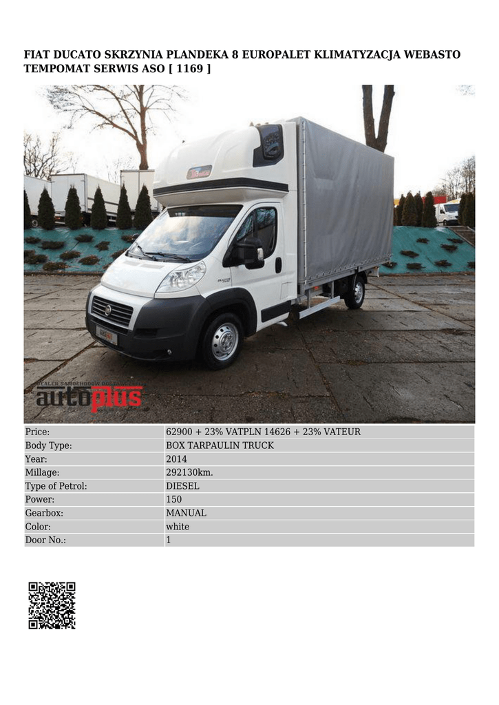 FIAT DUCATO SKRZYNIA PLANDEKA 8 EUROPALET KLIMATYZACJA WEBASTO TEMPOMAT SERWIS ASO [ 1169 ] Price: Body Type: Year: Millage: Type of Petrol: Power: Gearbox: Color: Door No.: 62900 + 23% VATPLN 14626 + 23% VATEUR BOX TARPAULIN TRUCK 2014 292130km. DIESEL 150 MANUAL white 1 ADDITIONAL INFORMATION ● ● ● ● ● accident-free serwisowany w ASO zarejestrowany w polsce stan bardzo dobry Kupiony w salonie w Polsce OPTIONAL EXTRAS ● ● ● ● ● ● ● ● ● ● ABS centralny zamek elektryczne lusterka immobiliser klimatyzacja komputer radio / cd tempomat wspomaganie kierownicy elektryczne szyby DESCRIPTION OFFER NUMBER- 1169 Serviced and Bought in Poland Fiat Ducato tarpaulin with a sleeper cab 8 europalets. First registration 2014 year. Car looks and drives very good. Paint in greate condition. The interior is clean and well maintained. The suspension and transmission work ideal. Dynamic 2.3 MultiJet engine has power 150 hp. Runs smooth and quiet. Car with aircondition, webasto and cruise control. Heigh tarpaulin can be: 235-255 cm. fiat has aircondition, cruise control and webasto. Equipment: - ABS - Driver airbag - Air Conditioning - Webasto - Cruise control - Power steering - Central locking - Immobilizer - Adjustable steering wheel - 6 speed - 3 seats - Electric windows and mirrors - Armrest - sleeper cab - 8 europalets - Radio CD - Servicebook - Dimensions of the cargo area: length / 420 cm / width / 220 cm / Height / 235-255 cm /