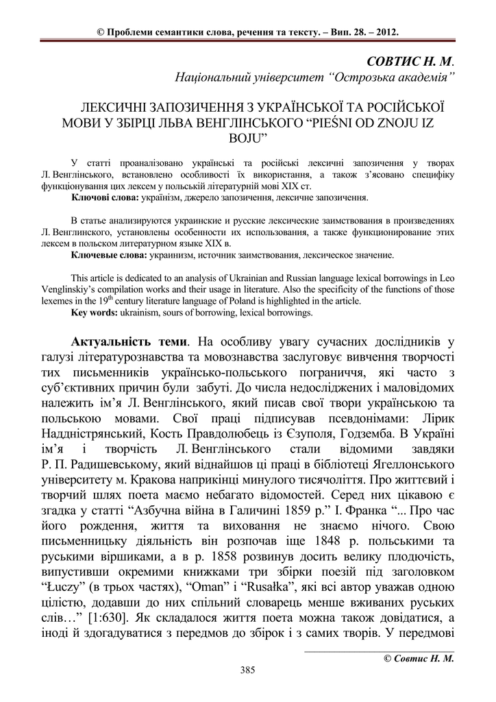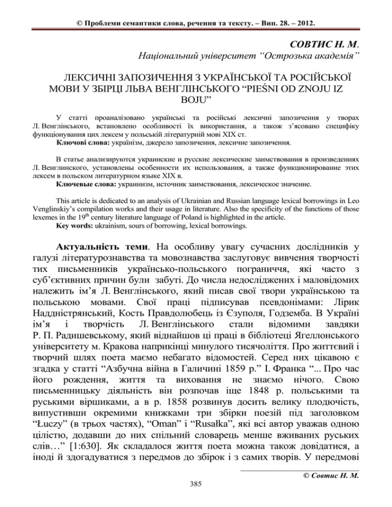 © Проблеми семантики слова, речення та тексту. – Вип. 28. – 2012. СОВТИС Н. М. Національний університет “Острозька академія” ЛЕКСИЧНІ ЗАПОЗИЧЕННЯ З УКРАЇНСЬКОЇ ТА РОСІЙСЬКОЇ МОВИ У ЗБІРЦІ ЛЬВА ВЕНГЛІНСЬКОГО “PIEŚNI OD ZNOJU IZ BOJU” У статті проаналізовано українські та російські лексичні запозичення у творах Л. Венглінського, встановлено особливості їх використання, а також з’ясовано специфіку функціонування цих лексем у польській літературній мові XIX ст. Ключові слова: українізм, джерело запозичення, лексичне запозичення. В статье анализируются украинские и русские лексические заимствования в произведениях Л. Венглинского, установлены особенности их использования, а также функционирование этих лексем в польском литературном языке XIX в. Ключевые слова: украинизм, источник заимствования, лексическое значение. This article is dedicated to an analysis of Ukrainian and Russian language lexical borrowings in Leo Venglinskiy’s compilation works and their usage in literature. Also the specificity of the functions of those lexemes in the 19th century literature language of Poland is highlighted in the article. Key words: ukrainism, sours of borrowing, lexical borrowings. Актуальність теми. На особливу увагу сучасних дослідників у галузі літературознавства та мовознавства заслуговує вивчення творчості тих письменників українсько-польського пограниччя, які часто з суб’єктивних причин були забуті. До числа недосліджених і маловідомих належить ім’я Л. Венглінського, який писав свої твори українською та польською мовами. Свої праці підписував псевдонімами: Лірик Наддністрянський, Кость Правдолюбець із Єзуполя, Годземба. В Україні ім’я і творчість Л. Венглінського стали відомими завдяки Р. П. Радишевському, який віднайшов ці праці в бібліотеці Ягеллонського університету м. Кракова наприкінці минулого тисячоліття. Про життєвий і творчий шлях поета маємо небагато відомостей. Серед них цікавою є згадка у статті “Азбучна війна в Галичині 1859 р.” І. Франка “... Про час його рождення, життя та виховання не знаємо нічого. Свою письменницьку діяльність він розпочав іще 1848 р. польськими та руськими віршиками, а в р. 1858 розвинув досить велику плодючість, випустивши окремими книжками три збірки поезій під заголовком “Łuczy” (в трьох частях), “Oman” і “Rusałka”, які всі автор уважав одною цілістю, додавши до них спільний словарець менше вживаних руських слів…” [1:630]. Як складалося життя поета можна також довідатися, а іноді й здогадуватися з передмов до збірок і з самих творів. У передмові ______________________________ © Совтис Н. М. 385 © Проблеми семантики слова, речення та тексту. – Вип. 28. – 2012. до збірки “Snopek z niw sławiańskich i obcych” Л. Венглінський пише, що народився і виховувався на прекрасному березі Дністра, а руське село від дитинства стало для нього ідеалом краси. Далі вказує, що довелося прожити кілька років у “чужій стороні” (як свідчить україномовна творчість, такою стороною, очевидно, була Волинь), а згодом доля його закинула до “підгорян”, де він познайомився із місцевими звичаями, обрядами, віруваннями та фольклором [цит. за 2 ]. Окрім збірок, написаних українською мовою, автор видав польськомовні твори: “Pieśni od znoju i z boju”, “Echo z-za Tatr i Karpat”, “Snopek z niw sławiańskich i obcych, “Echo z ziemi łez i krwi i parallela historyczna”, “Migotki”, “Plewa i ziarno”, “Dźwięki z polskich siół i pól”. Оскільки автор писав свої твори українською та польською мовами, на особливе зацікавлення заслуговує аналіз творів Л. Венглінського з погляду на взаємопроникнення та взаємовплив двох мов, 