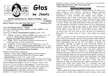 Głos św. Józefa Gazetka Sanktuarium św. Józefa w Prudniku – Lesie 11.12.16.2016 r. Msze św. niedzielne u nas o godz.: 8.00 10.00 11.30 OGŁOSZENIA Nr 50/2016 W Dębowcu: 8.45 Dzisiaj III Niedziela Adwentu – Gaudete. Są do nabycia kartki świąteczne, opłatki oraz świece wigilijne w cenie: 5 zł – małe i 12 zł – duże. Zapraszamy na Roraty od poniedziałku do piątku na godz. 17.00. 13.12. - Wtorek – Po Mszy św. Wieczór z Biblią. Rozpoczynamy nowy cykl spotkań pt.: Historia Piotra i Pawła oraz uczniów Chrystusa w Dziejach Apostolskich i listach Pawłowych. 14.12. - Środa – Msza w intencji próśb i podziękowań zanoszonych za wstawiennictwem św. Józefa i nabożeństwo. 15.12. - Czwartek – Po Mszy spotkanie Grupy Modlitewnej św. Ojca Pio. 16.12. - Piątek – Po Mszy św. Franciszkańska Szkoła Wiary: Życie św. Klary. 18.12. - Niedziela – O 15.00 nabożeństwo do Miłosierdzia Bożego, następnie spotkanie Franciszkańskiego Zakonu Świeckich Prudnicki Ośrodek Kultury zaprasza na: - Spotkanie z twórcą wystawy Szlak do wolności Julianem Golakiem połączone z recitalem Bartosza Mikluszki w repertuarze Jacka Kaczmarskiego we wtorek 13.12. o godz. 17.00. - Świąteczne wydanie programu artystyczno-publicystycznego prowadzonego przez Marka Karpa pt. Dzień dobry. Co słychać? w czwartek 15.12. o 18.00. Spotkanie Bractwa św. Józefa w Kościele św. Michała w środę o 18.00. Adwentowe Czuwanie Modlitewne dla młodzieży w Parafii Miłosierdzia Bożego w piątek o 17.00. Temat czuwania: Modlitwa jako szkoła rozmowy. Biskup Opolski Andrzej Czaja zaprasza osoby żyjące w związkach niesakramentalnych na nabożeństwo adwentowe, które odbędzie się w niedzielę 18.12 o godz. 14.00 w katedrze opolskiej. Dziękujemy wszystkim za modlitwę, ofiary, kwiaty i wszelkie prace na rzecz Sanktuarium. Każda minuta życia nosi w sobie własną rangę cudu i oblicze młodości wiekuistej. Albert Camus ROZWAŻANIE NA NIEDZIELĘ Otóż można coś wiedzieć o Bogu w sposób podobny, jak wiemy coś o świecie. Byłaby to wiara otrzymana i przyjęta na podstawie autorytetu ludzkiego. Należało by ją nazwać raczej wiedzą o Panu Bogu, czy przekonaniem o Bogu. Pomiędzy taką religijną wiarą naturalną, a nadprzyrodzoną wiarą w Boga, o jakiej mówi nasze wyznanie wiary, jest pewna przestrzeń, żeby nie powiedzieć – przepaść. Przejście od wiedzy o Bogu do wiary nadprzyrodzonej jest procesem. Można więc w tym wypadku mówić o rozwoju. Trzeba, żeby uległa przekształceniu motywacja naszej wiary: od wiary nauczającemu człowiekowi winniśmy przejść do wiary objawiającemu się Bogu. Trzeba nam dojść do tego, byśmy w jakiś sposób Pana Boga dotknęli, żebyśmy się w jakiś sposób z Panem Bogiem spotkali i mogli Mu wyznać: Wierzę w Ciebie, Boże żywy, w Trójcy jedyny prawdziwy. Wierzę, w coś objawił, Boże. Twe słowo mylić nie może. Nie może się to dokonać bez Bożej łaski, ale z drugiej strony nie może to mieć miejsca bez naszego wysiłku. Bywa, że przejście od wiary człowiekowi, który nam o Bogu mówił, do wiary w Boga, jest harmonijne. Są święci, którzy pozostawili nam świadectwo takiego harmonijnego rozwoju. Ma to najczęściej miejsce wtedy, gdy wiara osoby, przekazującej wiarę, jest tak żywa, tak głęboka, że dziecko, czy wychowanek, wspierając się niejako na wierze nauczyciela dochodzi do spotkania z Bogiem. Tak było Np. z niektórymi uczniami Jana Chrzciciela. Usłyszawszy jego świadectwo o Jezusie, poszli za znalezionym Mesjaszem. Myślę, że coś takiego przeżywało chyba wielu z tych, którzy spotkali się z Janem Pawłem II. Według ich świadectwa to spotkanie prowadziło do spotkania duchowego z Panem Jezusem. Św. Teresa od Dzieciątka Jezus pisze w swoim pamiętniku duchowym, że jej rodzice byli tak głęboko wierzący, że przekazali jej niejako doświadczenie dobroci Ojca Niebieskiego. Toteż, będąc małym dzieckiem, pokazywała gwiazdy na niebie układające się w kształt litery T i mówiła: Pan Bóg wypisał moje imię na niebie. Takie żywe odniesienie do Boga nie ustrzegło jej przed wielkim, ciemnościami wiary, o których jeszcze będzie mowa. Papież Paweł VI w Wyznaniu wiary Ludu Bożego mówi, że wiara jest ciemnością: w ciemności wiary. Bywa, ze trzeba nam przejść przez pewna ciemność, aby dojść do tego spotkania duchowego z Bogiem. Częściej jednak obserwujemy nieharmonijny rozwój wiary, czy nawet brak rozwoju wiary. Człowiek, który deklaruje się jako wierzący, wierzy mniej więcej tak, jak wtedy, gdy przygotowywał się w dzieciństwie do pierwszej Komunii świętej, czyli uczył się katechizmu. Nieraz przychodzący do nas świadek Jehowy słyszy takie np. zdanie: Proszę mi dać spokój. Jak wierzę tak, jak mój ojciec, jak moja matka, jak dziadek i babka. Niech pan idzie swoją drogą. Ja chcę w tej mojej wierze spokojnie żyć. Czy jednak mogę wierzyć na rachunek ojca i matki, dziadka czy babci? Przecież to ja sam mówię: wierzę. Co to jednak znaczy? Jakże często spotykamy się ze szczerym wyznaniem: Ja wierzę, ale… ja wierzę, ale jestem niepraktykujący. Papież Benedykt XVI mówił o takiej postawie w czasie spotkania z biskupami niemieckimi w Kolonii. Wyraził zdanie, że to jest problem dzisiejszego człowieka. Przyjmującego prawdy wiary wybiórczo, wybiera tylko niektóre. Dla przykładu: są ludzie przeświadczeni, że wierzą, ale nie wierzą w diabła, a w takim razie właściwie nie wierzą w życie wieczne. Gdyby tym ludziom powiedzieć: Słuchajcie, coś z waszą wiarą jest nie w porządku, to by się czuli bardzo dotknięci. Nie – mówią – ja jestem naprawdę wierzący; ja chodzę do kościoła, nawet czasem poszczę w piątek, od czasu do czasu idę do Spowiedzi św. o tych ludziach Benedykt XVI mówił, że nie znają Boga i nie znają Chrystusa. Miał na myśli właśnie to, że pewno coś wiedzą o Chrystusie ale 