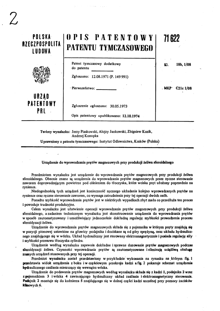 POLSKA RZECZPOSPOLITA LUDOWA OPIS PATENTOWY 71622 PATENTU TYMCZASOWEGO Patent tymczasowy dodatkowy do patentu KI. 18b, 1/08 MKP aicl/08 Zgłoszono: 12.08.1971 (P. 149 991) Pierwszeństwo: URZĄO PATENTOWY PRL Zgłoszenie ogłoszono: 30.05.1973 Opis patentowy opublikowano: 12.10.1974 Twórcywynalazku: Jerzy Piaskowski, Alojzy Jankowski, Zbigniew Kozik, Andrzej Konopka Uprawniony z patentu tymczasowego: Instytut Odlewnictwa, Kraków (Polska) Urządzenie do wprowadzania prętów magnezowych przy produkcji żeliwa sferoidalnęgo Przedmiotem wynalazku jest urządzenie do wprowadzania prętów magnezowych przy produkcji żeliwa sferoidalnęgo. Obecnie znane są urządzenia do wprowadzania prętów magnezowych przez ręczne sterowanie zaworem doprowadzającym powietrze pod ciśnieniem do tłoczyska, które wciska pręt ułożony poprzednio na rynience. Niedogodnością tych urządzeń jest konieczność ręcznego układania kolejno wprowadzanych prętóyr na rynience oraz ręczne sterowanie zaworem, co wymaga zatrudnienia przy tej operacji dwóch osób. Ponadto szybkość wprowadzania prętów jest w niektórych wypadkach zbyt mała co przedłuża ten proces i powoduje trudności produkcyjne. Celem wynalazku jest ułatwienie operacji wprowadzania prętów magnezowych przy produkcji żeliwa sferoidalnęgo, a zadaniem technicznym wynalazku jest skonstruowanie urządzenia do wprowadzania prętów w sposób zautomatyzowany i umożliwiający jednocześnie dokładną regulację szybkości prowadzenia procesu sferoidyzacji żeliwa. Urządzenie do wprowadzania prętów magnezowych składa się z pojemnika w którym pręty znajdują się w pozycji pionowej ustawione na głowicy podajnika i dociskane są od góry sprężyną, oraz układu hydraulicz¬ nego znajdującego się w wózku. Układ hydrauliczny jest sterowany elektromagnetycznie i posiada regulację siły i szybkości przesuwu tłoczyska cylindra. Urządzenie według wynalazku zapewnia dokładne i sprawne dozowanie prętów magnezowych podczas sf«oidyzaqi żeliwa. Czynności wprowadzania prętów są zautomatyzowane i eliminują uciążliwą obsługę znanych urządzeń stosowanych przy tej operacji. Przedmiot wynalazku został przedstawiony w przykładzie wykonania na rysunku na którym fig. 1 pnedstawia widok urządzenia z boku iw częściowym przekroju kadzi a fig. 2 pokazuje schemat urządzenia hydraulicznego zasilania mieszczący się wewnątrz wózka. Urządzenie do podawania prętów magnezowych według wynalazku składa się z kadzi 1, podajnika 2 wraz z pojemnikiem 3 i wózka 4 zawierającego hydrauliczny układ zasilania i elektromagnetyczny sterowania. Podajnik 2 montuje się do kołnierza 5 znajdującego się w dolnej części kadzi szczelnej przy pomocy zacisków Urnowych 6. 2 71622 Pręty magnezowe i pręt stalowy zamykający otwór umieszczone są w pojemniku 3 i dociskane od góry sprężyną 7. W tylnej części podajnika znajduje się cylinder hydrauliczny 8 zasilany przez przewody rurowe 9. Zasilane olejem cylindra hydraulicznego 8 przez przewody rurowe 9 odbywa się z pompy zębatej 10 napędzanej silnikiem elektrycznym 11 oraz układem hydraulicznym 12 sterowanym elektromagnetycznie i mieszczących się wewnątrz wózka 4. Siła na tłoczysku w cylindrze 8 regulowana jest przez nastawianie zaworu przelewowego 13. Na pokrywie wózka 4 znajdują się dźwignie i przyciski służące do obsługi urządzenia. Przycisk 14 uruchamia silnik elektryczny 11 napędzający pompę zębatą olejową 10 co sygnalizuje zapalenie lampki kontrolnej 15 i wskazanie ciśnienia na manometrze 16. Przełącznik dźwigienkowy 17 uruchamia prostownik prądu stałego 24V 18 układu sterowania cylindrem hydraulicznym 8 co sygnalizuje lampka kontrolna 19, Przełącznik dźwigienkowy 20 włącza cykl podawania prętów magnezowych do kadzi 1 z podajnika 2. Do sygnalizowania cyklu pracy podawania prętów służy lampka kontrolna 21, a ruch jałowy (powrotu) tłoczyska w cylindrze 8 sygnalizuje lampka kontrolna 22. Prędkość podawania prętów reguluje się przy pomocy pokrętła 23, zaś prędkość ruchu jałowego (powrotnego) tłoczyska pokrętłem 24. Pokrętła 23 i 24 są połączone zaworami dławiącymi jednostronnego działania. Pozostałe dwie dźwignie 25 i 26 umożliwiają wprowadzenie prętów w przypadku uszkodzenia części sterowania automatycznego. Dźwignia 25 służy do zamknięcia zaworu odcinającego 27, a dźwignia 26 jest używana do ręcznego sterowania dodatkowym rozdzielaczem hydraulicznym trójpozycyjnym 26, podającym olej do cylindra 8 w przypadku awarii urządzeń sterujących. Do połączenia urządzenia z siecią elektryczną służy przewód 29 a przewód 30 łączy wyłączniki krańcowe miniaturowe 31 z rozdzielaczem hydraulicznym sterowanym elektromagnetycznie 32 znajdującym się wewnątrz wózka 4. Zawory dławiące 33 i 34 służą do regulacji prędkości poruszania się tłoczyska w cylindrze 8. Przystępując do wprowadzania magnezu do żeliwa pizy pomocy urządzenia, będącego przedmiotem wynalazku, napełnia się pojemnik 3 prętami magnezowymi w odpowiedniej ilości (przewiduje się zwykle około 0,18% ciężaru magnezu w stosunku do ilości żeliwa w kadzi), przymocowuje się podajnik 2 do kadzi lprzy pomocy klinów 6, a przewód 29 załącza się do sieci elektrycznej. Następnie przyciskiem 14 uruchamia się silnik elektryczny 11 napędzający pompę olejową zębatą 10, przy czym dźwignia 25 zaworu odcinającego 27 znajduje się w położeniu „sterowanie automatyczne", a dźwignia 26 w położeniu zerowym. Zapala się wówczas lampką sygnalizująca 15 i manometr 16 wskazuje ciśnienie w sieci hydraulicznej. W początkowym okresie podawania należy zmniejszyć nieco szybkość ruchu tłoczyska przykręcając pokrętło 23 zaworu dławiącego 33 w kierunku „wolniej", a dla przyspieszenia ruchu jałowego (powrotnego) tłoczyska, pokrętło 24 zaworu dławiącego 34 przekręca się w kierunku poło