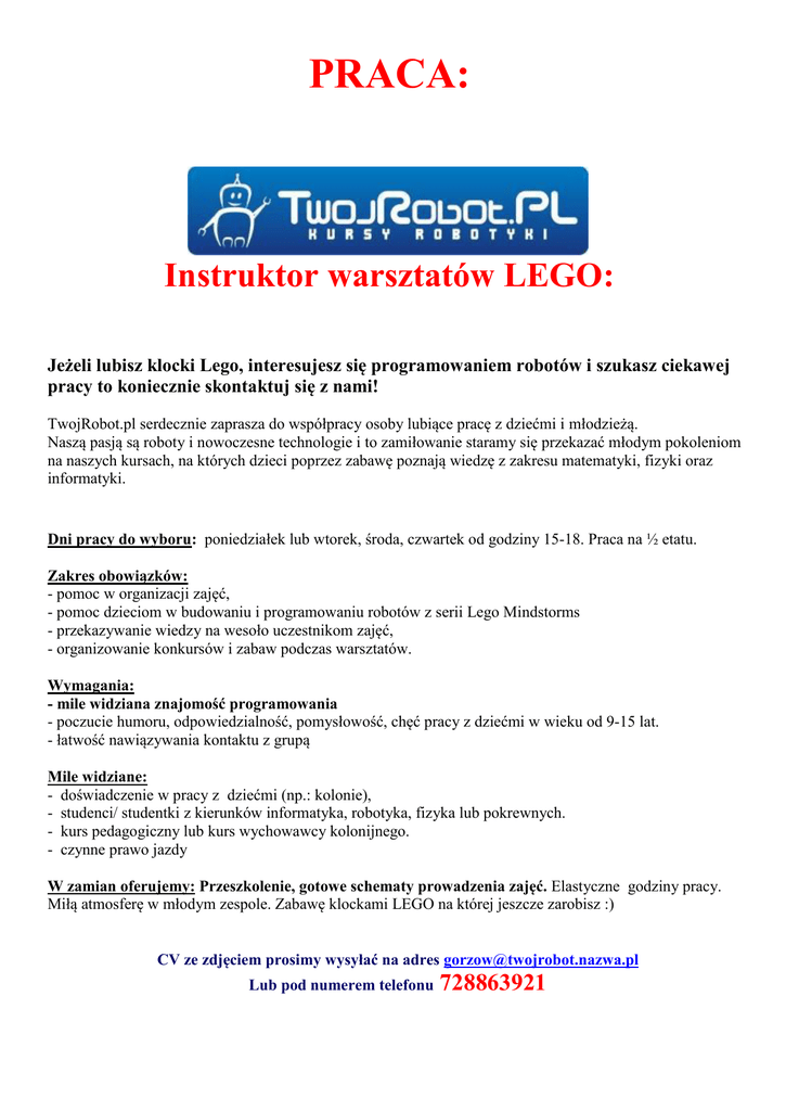 PRACA: Instruktor warsztatów LEGO: Jeżeli lubisz klocki Lego, interesujesz się programowaniem robotów i szukasz ciekawej pracy to koniecznie skontaktuj się z nami! TwojRobot.pl serdecznie zaprasza do współpracy osoby lubiące pracę z dziećmi i młodzieżą. Naszą pasją są roboty i nowoczesne technologie i to zamiłowanie staramy się przekazać młodym pokoleniom na naszych kursach, na których dzieci poprzez zabawę poznają wiedzę z zakresu matematyki, fizyki oraz informatyki. Dni pracy do wyboru: poniedziałek lub wtorek, środa, czwartek od godziny 15-18. Praca na ½ etatu. Zakres obowiązków: - pomoc w organizacji zajęć, - pomoc dzieciom w budowaniu i programowaniu robotów z serii Lego Mindstorms - przekazywanie wiedzy na wesoło uczestnikom zajęć, - organizowanie konkursów i zabaw podczas warsztatów. Wymagania: - mile widziana znajomość programowania - poczucie humoru, odpowiedzialność, pomysłowość, chęć pracy z dziećmi w wieku od 9-15 lat. - łatwość nawiązywania kontaktu z grupą Mile widziane: - doświadczenie w pracy z dziećmi (np.: kolonie), - studenci/ studentki z kierunków informatyka, robotyka, fizyka lub pokrewnych. - kurs pedagogiczny lub kurs wychowawcy kolonijnego. - czynne prawo jazdy W zamian oferujemy: Przeszkolenie, gotowe schematy prowadzenia zajęć. Elastyczne godziny pracy. Miłą atmosferę w młodym zespole. Zabawę klockami LEGO na której jeszcze zarobisz :) CV ze zdjęciem prosimy wysyłać na adres [email protected] Lub pod numerem telefonu 728863921