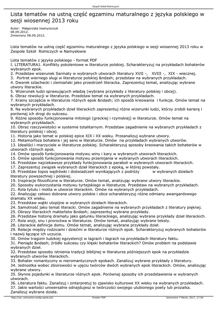 Zespół Szkół Rolniczych Lista tematów na ustną część egzaminu maturalnego z języka polskiego w sesji wiosennej 2013 roku Autor: Małgorzata Iwanyszczuk 08.09.2012. Zmieniony 08.09.2012. Lista tematów na ustną część egzaminu maturalnego z języka polskiego w sesji wiosennej 2013 roku w Zespole Szkół Rolniczych w Namysłowie Lista tematów z języka polskiego - format PDF I. LITERATURA1. Konflikty pokoleniowe w literaturze polskiej. Scharakteryzuj na przykładach bohaterów wybranych epok. 2. Przedstaw wizerunek Sarmaty w wybranych utworach literatury XVII -, XVIII -, XIX - wiecznej. 3. Portret wiernego sługi w literaturze polskiej – przedstaw na wybranych przykładach. 4. Dworek szlachecki i ziemiański jako przestrzeń literacka. Zaprezentuj temat, analizując wybrane utwory literackie. 5. Wizerunek ludzi sprawujących władzę (wybrane przykłady z literatury polskiej i obcej). 6. Obraz rewolucji w literaturze. Przedstaw temat na wybranych przykładach. 7. Krainy szczęścia w literaturze różnych epok – ich sposób kreowania i funkcje. Omów temat na wybranych przykładach. 8. Na wybranych przykładach dzieł literackich zaprezentuj różne wizerunki ludzi, którzy zrobili karierę i porównaj ich drogi do sukcesu. 9. Różne sposoby funkcjonowania mitologii (greckiej i rzymskiej) w literaturze. Omów temat na wybranych przykładach. 10. Obraz rzeczywistości w systemie totalitarnym. Przedstaw zagadnienie na wybranych przykładach z literatury polskiej i obcej. 11. Historia jako temat w polskiej epice XIX i XX wieku. Przeanalizuj wybrane utwory. 12. Metamorfoza bohatera i jej sens w literaturze. Omów na przykładach wybranych utworów. 13. Idealiści i marzyciele w literaturze polskiej. Scharakteryzuj sposoby kreowania takich bohaterów w utworach różnych epok. 14. Omów sposób funkcjonowania motywu winy i kary w wybranych utworach literackich. 15. Omów sposób funkcjonowania motywu przemijania w wybranych utworach literackich. 16. Przedstaw najciekawsze przykłady funkcjonowania paraboli w wybranych utworach literackich. 17. Zaprezentuj związek wybranych dzieł literackich z epoką, w której powstały. 18. Przedstaw topos wędrówki i doświadczeń wynikających z podróży w wybranych dziełach literatury powszechnej i polskiej. 19. Inspiracje filozoficzne w literaturze. Omów temat, analizując wybrane utwory literackie. 20. Sposoby wykorzystania motywu tyrtejskiego w literaturze. Przedstaw na wybranych przykładach. 21. Rola tytułu i motta w utworze literackim. Omów na wybranych przykładach. 22. Analizując celowo dobrane utwory polskie i obce scharakteryzuj różne odmiany awangardowego dramatu XX wieku. 23. Przedstaw wątki utopijne w wybranych dziełach literackich. 24. Samotność jako temat literacki. Omów zagadnienie na wybranych przykładach z literatury pięknej. 25. Obrazy literackich małżeństw – zaprezentuj wybrane przykłady. 26. Przedstaw historię dramatu jako gatunku literackiego, analizując wybrane przykłady dzieł literackich. 27. Rola wizji, snu i proroctwa w literaturze. Omów temat, analizując wybrane teksty. 28. Literackie definicje domu. Omów temat, analizując wybrane przykłady dzieł. 29. Relacje między rodzicami i dziećmi w literaturze różnych epok. Scharakteryzuj wybranych bohaterów i nazwij łączące ich uczucia. 30. Omów tragizm ludzkiej egzystencji w lagrach i łagrach na przykładach literatury faktu. 31. Pieniądz – źródło sukcesu czy klęski bohaterów literackich? Omów problem na podstawie wybranych dzieł. 32. Przedstaw sposoby istnienia tradycji biblijnej w literaturze późniejszych epok na przykładzie wybranych utworów literackich. 33. Bohater romantyczny w nieromantycznych epokach. Zanalizuj wybrane przykłady z literatury. 34. Jednostka wobec zbiorowości w ujęciu twórców dwóch wybranych epok literackich. Omów, analizując wybrane utwory. 35. Słynne pojedynki w literaturze różnych epok. Porównaj sposoby ich przedstawienia w wybranych utworach. 36. Literatura faktu. Zanalizuj i zinterpretuj to zjawisko kulturowe XX wieku na wybranych przykładach. 37. Jakie wartości uniwersalne odnajdujesz w twórczości swojego ulubionego poety lub prozaika. Zanalizuj wybrane dzieła. http://zsr_namyslow.wodip.opole.pl/j Kreator PDF Utworzono 7 March, 2017, 17:59 Zespół Szkół Rolniczych 38. Literatura współczesna odbiciem różnorodnych postaw człowieka w sytuacji zagrożenia. Przedstaw na wybranych przykładach. 39. Konflikt jednostki ze społeczeństwem i ze sobą w twórczości Stefana Żeromskiego na podstawie wybranych utworów. 40. Współczesna poezja polska jako wyraz doświadczeń, przeżyć i niepokojów pokolenia powojennego. Omów zagadnienie, analizując wybrane wiersze. 41. Powroty do kraju lat dziecinnych. Omów temat, analizując wybrane przykłady z literatury. 42. Niepokorni w literaturze. Zrealizuj temat, analizując wybrane utwory R. Wojaczka, E. Stachury, M. Hłaski. 43. Symbolika drzewa w literaturze polskiej i obcej. Przedstaw temat na wybranych przykładach. 44. Motyw rozstania w literaturze. Przedstaw na wybranych przykładach z różnych epok. 45. „Inny świat” obłąkanych w literaturze. Omów motyw szaleństwa na wybranych przykładach literackich. 46. Jaki obraz młodego pokolenia kreuje polska literatura różnych epok? Omów na wybranych przykładach dzieł. 47. Artysta jako bohater dzieł literackich – omów na wybranych przykładach. 48. Motyw tańca w literaturze. Omów, analizując wybrane dzieła literackie. 49. Państwo jako najwyższa wartość narodowa w widzeniu bohaterów literackich różnych epok. Omów zagadnienie, analizując postawy wybranych postaci. 50. Motyw wędrówki w czasie i przestrzeni w wybranych utworach literackich, jego dosłowny i przenośny sens. Omów zagadnienie, analizując odpowiednie przykłady z literatury. 51. Narrator w epice i jego różne funkcje. Zanalizuj temat na wybranych przykładach literackich. 52. Róż