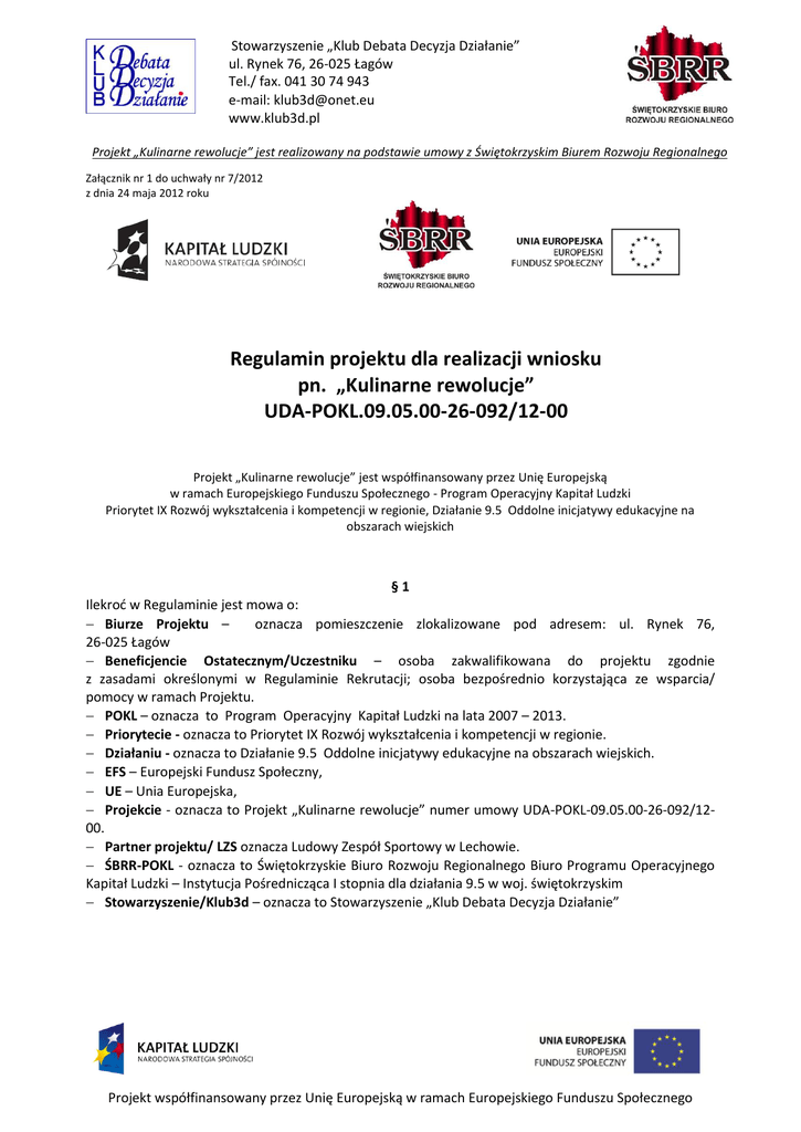 Stowarzyszenie „Klub Debata Decyzja Działanie” ul. Rynek 76, 26-025 Łagów Tel./ fax. 041 30 74 943 e-mail: [email protected] www.klub3d.pl Projekt „Kulinarne rewolucje” jest realizowany na podstawie umowy z Świętokrzyskim Biurem Rozwoju Regionalnego Załącznik nr 1 do uchwały nr 7/2012 z dnia 24 maja 2012 roku Regulamin projektu dla realizacji wniosku pn. „Kulinarne rewolucje” UDA-POKL.09.05.00-26-092/12-00 Projekt „Kulinarne rewolucje” jest współfinansowany przez Unię Europejską w ramach Europejskiego Funduszu Społecznego - Program Operacyjny Kapitał Ludzki Priorytet IX Rozwój wykształcenia i kompetencji w regionie, Działanie 9.5 Oddolne inicjatywy edukacyjne na obszarach wiejskich §1 Ilekroć w Regulaminie jest mowa o: Biurze Projektu – oznacza pomieszczenie zlokalizowane pod adresem: ul. Rynek 76, 26-025 Łagów Beneficjencie Ostatecznym/Uczestniku – osoba zakwalifikowana do projektu zgodnie z zasadami określonymi w Regulaminie Rekrutacji; osoba bezpośrednio korzystająca ze wsparcia/ pomocy w ramach Projektu. POKL – oznacza to Program Operacyjny Kapitał Ludzki na lata 2007 – 2013. Priorytecie - oznacza to Priorytet IX Rozwój wykształcenia i kompetencji w regionie. Działaniu - oznacza to Działanie 9.5 Oddolne inicjatywy edukacyjne na obszarach wiejskich. EFS – Europejski Fundusz Społeczny, UE – Unia Europejska, Projekcie - oznacza to Projekt „Kulinarne rewolucje” numer umowy UDA-POKL-09.05.00-26-092/1200. Partner projektu/ LZS oznacza Ludowy Zespół Sportowy w Lechowie. ŚBRR-POKL - oznacza to Świętokrzyskie Biuro Rozwoju Regionalnego Biuro Programu Operacyjnego Kapitał Ludzki – Instytucja Pośrednicząca I stopnia dla działania 9.5 w woj. świętokrzyskim Stowarzyszenie/Klub3d – oznacza to Stowarzyszenie „Klub Debata Decyzja Działanie” Projekt współfinansowany przez Unię Europejską w ramach Europejskiego Funduszu Społecznego Stowarzyszenie „Klub Debata Decyzja Działanie” ul. Rynek 76, 26-025 Łagów Tel./ fax. 041 30 74 943 e-mail: [email protected] www.klub3d.pl Projekt „Kulinarne rewolucje” jest realizowany na podstawie umowy z Świętokrzyskim Biurem Rozwoju Regionalnego 1. 2. 3. 4. POSTANOWIENIA OGÓLNE §2 Stowarzyszenie „Klub Debata Decyzja Działanie” realizuje Projekt „Kulinarne rewolucje” w ramach Europejskiego Funduszu Społecznego w ramach Programu Operacyjnego Kapitał Ludzki Priorytet IX „Rozwój wykształcenia i kompetencji w regionie”, Działanie 9.5 „Oddolne inicjatywy edukacyjne na obszarach wiejskich”, na podstawie umowy nr UDA-POKL.09.05.00-26-092/12-00 zawartej z Samorządem Województwa Świętokrzyskiego/ Świętokrzyskim Biurem Rozwoju Regionalnego (ul Jagiellońska 70, 25 – 956 Kielce) pełniącym rolę Instytucji Pośredniczącej I stopnia dla Działania 9.5. Projekt jest realizowany w partnerstwie z Partnerem Projektu Ludowym Zespołem Sportowym w Lechowie. Dla potrzeb realizacji Projektu powołuje się Zespół Sterujący Projektem składającą się z 6 osób (3K, 3M) po 3 przedstawicieli Klubu 3d i Partnera. Zespół Sterujący będzie spotykał się minimum raz w miesiącu i będzie podejmował wiążące decyzje związane z realizacją działań, w tym w szczególności rekrutacji uczestników. §3 Regulamin Projektu określa w szczególności: 1. zasady organizacji projektu, 2. cele projektu, 3. zakres wsparcia dla Beneficjentów Ostatecznych, 4. warunki uczestnictwa w projekcie, 5. kwalifikowalność uczestników. §4 Wszystkie decyzje podejmowane w oparciu o Regulamin muszą być zgodne z: 1. Programem Operacyjnym Kapitał Ludzki 2007-2013. 2. Szczegółowym Opisem Priorytetów PO KL. 3. Umową nr UDA-POKL.09.05.00-26-092/12-00 o dofinansowanie Projektu pn. „Kulinarne rewolucje” zawartą pomiędzy Stowarzyszeniem a ŚBRR-POKL. §5 Ogólny nadzór nad realizacją Projektu, a także rozstrzyganie spraw, które nie są uregulowane niniejszym Regulaminem, należy do Zarządu Stowarzyszenia, chyba, że niniejszy Regulamin określa inaczej. CELE PROJEKTU §6 1. Celem głównym Projektu jest Zwiększenie wiedzy o 60% na temat zdrowego trybu życia, ekologii oraz praktyczne wdrożenie zdobytej wiedzy przez 16 kobiet z terenu gmin: Bieliny, Łagów, Raków w okresie 10.12r. – 03.13r. 2. Cel główny projektu będzie zrealizowany poprzez przeprowadzenie: - warsztatów „Wiem co jem” - warsztatów Edukacja kulinarna „Smaki świata” - warsztaty aerobik „Forma Twoja norma” - seminarium na temat ekologii - rajdu edukacyjnego „Świętokrzyskie jakie cudne” Projekt współfinansowany przez Unię Europejską w ramach Europejskiego Funduszu Społecznego Stowarzyszenie „Klub Debata Decyzja Działanie” ul. Rynek 76, 26-025 Łagów Tel./ fax. 041 30 74 943 e-mail: [email protected] www.klub3d.pl Projekt „Kulinarne rewolucje” jest realizowany na podstawie umowy z Świętokrzyskim Biurem Rozwoju Regionalnego - wyjazdu edukacyjnego „Aktywni cały rok” zaproponowane wsparcie ma na celu m.in.: 2.1. Zwiększenie wiedzy o 60% na temat zdrowego, racjonalnego odżywiania się u 16K z gmin objętych wsparciem w okresie od 10.12r-03.13r 2.2. Nabycie umiejętności przygotowywania 10 zdrowych, smacznych potraw u 16K z gmin objętych wsparciem w okresie 10.12-03.13r 2.3. Nabycie 1 umiejętności prawidłowego wykonywania ćwiczeń fizycznych oraz poprawa o 40% samopoczucia u 16K z gmin objętych wsparciem w okresie od 10.12r-03.13r 2.4. Zwiększenie wiedzy o 60% na temat ekologii i środowiska naturalnego oraz wpływu na niego pojedynczego człowieka u 16K z terenu gmin objętych wsparciem w okresie od 10.12r-03.13r §7 1. Wsparciem w ramach Projektu zostanie objętych 16 osób (2 osoby bezrobotne i 12 nieaktywnych zawodowo, 2 pracujące) 2. Istnieje możliwość zmiany proporcji pomiędzy statusem osób, tzn. przyjęcie większej liczby bezrobotnych bądź pracujących, pod warunkiem, że ŚBRR-POKL wyrazi na to zgodę. 3. Realizatorzy Projektu prag