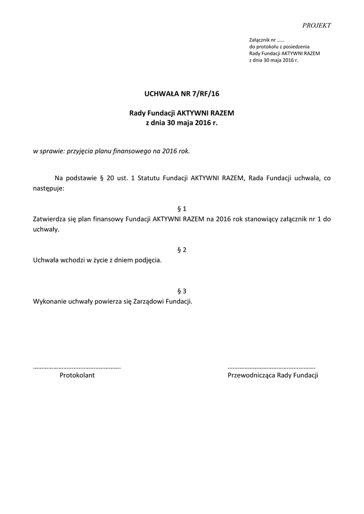 PROJEKT Załącznik nr …… do protokołu z posiedzenia Rady Fundacji AKTYWNI RAZEM z dnia 30 maja 2016 r. UCHWAŁA NR 7/RF/16 Rady Fundacji AKTYWNI RAZEM z dnia 30 maja 2016 r. w sprawie: przyjęcia planu finansowego na 2016 rok. Na podstawie § 20 ust. 1 Statutu Fundacji AKTYWNI RAZEM, Rada Fundacji uchwala, co następuje: §1 Zatwierdza się plan finansowy Fundacji AKTYWNI RAZEM na 2016 rok stanowiący załącznik nr 1 do uchwały. §2 Uchwała wchodzi w życie z dniem podjęcia. §3 Wykonanie uchwały powierza się Zarządowi Fundacji. ……………………………………………. Protokolant ……………………………………………. Przewodnicząca Rady Fundacji