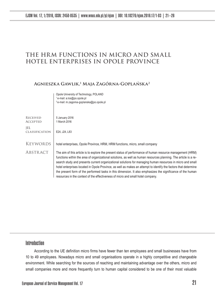 EJSM Vol. 17, 1/2016, ISSN: 2450-8535 | www.wnus.edu.pl/pl/ejsm | DOI: 10.18276/ejsm.2016.17/1-03 | 21–26 The HRM functions in micro and sm all hotel enterprises in Opole Province Agnieszk a Gawlik,1 Maja Zagórna-Goplańsk a 2 Opole University of Technology, POLAND 1 e-mail: [email protected] 2 e-mail: [email protected] Received Accepted 5 January 2016 1 March 2016 JEL classification E24, J24, L83 Keywords hotel enterprises, Opole Province, HRM, HRM functions, micro, small company Abstr act The aim of this article is to explore the present status of performance of human resource management (HRM) functions within the area of organizational solutions, as well as human resources planning. The article is a research study and presents current organizational solutions for managing human resources in micro and small hotel enterprises located in Opole Province, as well as makes an attempt to identify the factors that determine the present form of the performed tasks in this dimension. It also emphasizes the significance of the human resources in the context of the effectiveness of micro and small hotel company. Introduction According to the UE definition micro firms have fewer than ten employees and small businesses have from 10 to 49 employees. Nowadays micro and small organisations operate in a highly competitive and changeable environment. While searching for the sources of reaching and maintaining advantage over the others, micro and small companies more and more frequently turn to human capital considered to be one of their most valuable European Journal of Service Management Vol. 17 21 Agnieszka Gawlik, Maja Zagórna-Goplańska and unique assets (Becker, 1993; Schultz, 1971; Wright et al., 2001, pp. 701–721; Youndt et al., 1996, pp. 836– 866; Rastogi, 2000, pp. 193–203; Zagórna-Goplańska, 2012, pp. 5–6; Puciato, Łoś, 2010). Creating favourable conditions for the development of potential human skills, and creating valuable and unique teams of workers as a result, falls within the scope of human resource management (HRM) functions of each and every company. Hotels are tourist entities that are of significance in the creating added value tourist chain. The particular role of human resources in a hotel causes the fact that the number and qualifications of employees shape the level of supply and the quality of provided services (Nadiri, Tanova, 2010; Ratajczyk, 2014; Tokarz, 2008, p. 41). Micro and small hotels are particularly sensitive to the external changes in their environment (Borkowski, Wszendybył, 2007, p. 33). Moreover, they need to overcome problems arising from the seasonal character of tourist demand which forces to undertake actions of the anticipation character within the HRM (Listwan, 2010, p. 79; Golnau, 2007, p. 92; Lipowska, 2012) since they constitute one of the basic conditions for effectiveness of a hotel. The article aim is to explore the present status of the performance of the HRM in micro and small hotel enterprises in Opole Province. Results In this paper the documentation method and a diagnostic survey method (PAPI) were applied with technique of a structured interview. In the first phase of the research, an analysis was performed of the statistical material from the secondary sources, in order to carry out an inventory of the hotels located in Opole Province. The empirical research was conducted from December 2014 to January 2015 among the owners and managers of 16 randomly selected micro and small hotel enterprises from Opole Province. A detailed scope of this research included business solutions within the HRM functions. The most popular legal and organisational forms among the surveyed hotels were: a limited liability company (6 enterprises), a registered partnership (5), self-employment and a private partnership (2 of each). There was only one cooperative in the analysed sample. Small enterprises employing up to 50 people constituted the majority among the analysed hotels (13 hotels) and microenterprises employing up to 10 people came second (3). As far as a capital ownership is concerned, the entities in which capital is owned by a domestic investor were predominant among the surveyed hotels (13). There were only two entities to be found among the analysed group which represented a foreign investor and one with mixed capital. Entities that had been functioning on the market from 1 year to 10 years constituted a half of the analysed group (8 enterprises). There were also five among the surveyed hotels that had been operating on the market from 11 to 20 years. The entities that have been in the market for a period from 7 to 10 years had the smallest share in the analysed sample (1) as well as these that had been functioning for over 20 years (3 entities). In the survey, the owners and managers of the hotels were asked to specify business solutions applied within the HRM functions. In the vast majority of the surveyed entities (88%) the HR department was not distinguished within the organisational structure. Only two of the surveyed hotels had such a department (Table 1). It should be noted that distinguishing this department in the analysed group is connected neither with the legal and organizational form of an enterprise (in the group there were: a cooperative and a registered partnership), nor the size of company (micro and small company), nor the size of employment (9 and 22 employees respectively). The respondents asked why the HR department had not been created in their hotel replied: ‘there is no need to create it’, ‘we have been functioning without it for a long period of time and we think it is unnecessary’, ‘the current 22 European Journal of Service Management The HRM functions in micro and small hotel enterprises in Opole Province solution is entirely satisfying’, ‘a separate HR department (…) means the necessity to create further work posts and (financial) burden for the company’. The respondents also stated as their r