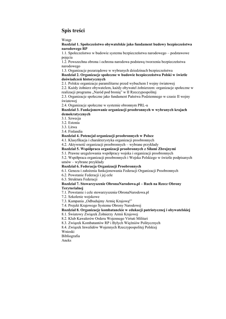 Spis treści Wstęp Rozdział 1. Społeczeństwo obywatelskie jako fundament budowy bezpieczeństwa narodowego RP 1.1. Społeczeństwo w budowie systemu bezpieczeństwa narodowego – podstawowe pojęcia 1.2. Powszechna obrona i ochrona narodowa podstawą tworzenia bezpieczeństwa narodowego 1.3. Organizacje pozarządowe w wybranych dziedzinach bezpieczeństwa Rozdział 2. Organizacje społeczne w budowie bezpieczeństwa Polski w świetle doświadczeń historycznych 2.1. Polskie organizacje paramilitarne przed wybuchem I wojny światowej 2.2. Każdy żołnierz obywatelem, każdy obywatel żołnierzem: organizacje społeczne w realizacji programu „Naród pod bronią” w II Rzeczypospolitej 2.3. Organizacje społeczne jako fundament Państwa Podziemnego w czasie II wojny światowej 2.4. Organizacje społeczne w systemie obronnym PRL-u Rozdział 3. Funkcjonowanie organizacji proobronnych w wybranych krajach demokratycznych 3.1. Szwecja 3.2. Estonia 3.3. Litwa 3.4. Finlandia Rozdział 4. Potencjał organizacji proobronnych w Polsce 4.1. Klasyfikacja i charakterystyka organizacji proobronnych 4.2. Aktywność organizacji proobronnych – wybrane przykłady Rozdział 5. Współpraca organizacji proobronnych z Siłami Zbrojnymi 5.1. Prawne uregulowania współpracy wojska i organizacji proobronnych 5.2. Współpraca organizacji proobronnych i Wojska Polskiego w świetle podpisanych umów – wybrane przykłady Rozdział 6. Federacja Organizacji Proobronnych 6.1. Geneza i założenia funkcjonowania Federacji Organizacji Proobronnych 6.2. Powstanie Federacji i jej cele 6.3. Struktura Federacji Rozdział 7. Stowarzyszenie ObronaNarodowa.pl – Ruch na Rzecz Obrony Terytorialnej 7.1. Powstanie i cele stowarzyszenia ObronaNarodowa.pl 7.2. Szkolenie wojskowe 7.3. Kampania „Odbudujmy Armię Krajową!” 7.4. Projekt Krajowego Systemu Obrony Narodowej Rozdział 8. Organizacje kombatanckie w edukacji patriotycznej i obywatelskiej 8.1. Światowy Związek Żołnierzy Armii Krajowej 8.2. Klub Kawalerów Orderu Wojennego Virtuti Militari 8.3. Związek Kombatantów RP i Byłych Więźniów Politycznych 8.4. Związek Inwalidów Wojennych Rzeczypospolitej Polskiej Wnioski Bibliografia Aneks