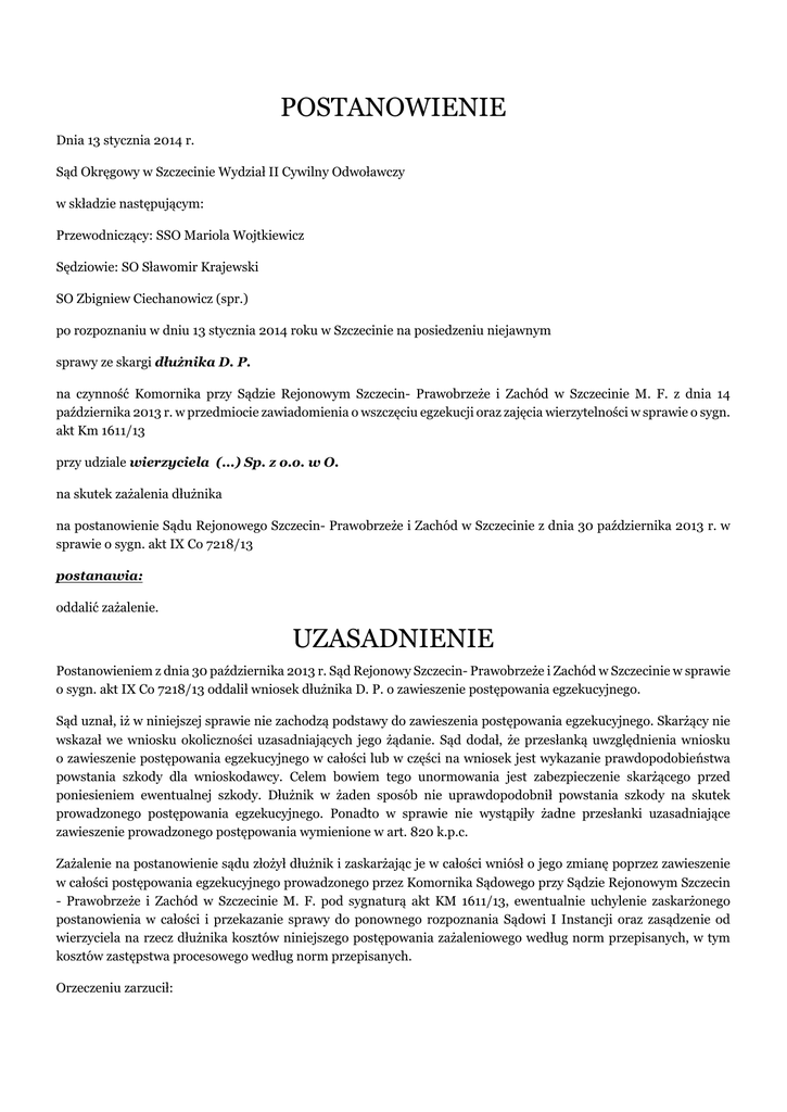 POSTANOWIENIE UZASADNIENIE - Sąd Okręgowy w Szczecinie