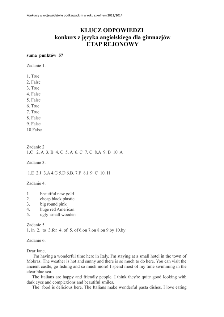 Konkursy w województwie podkarpackim w roku szkolnym 2013/2014 KLUCZ ODPOWIEDZI konkurs z języka angielskiego dla gimnazjów ETAP REJONOWY suma punktów 57 Zadanie 1. 1. True 2. False 3. True 4. False 5. False 6. True 7. True 8. False 9. False 10.False Zadanie 2 1.C 2. A 3. B 4. C 5. A 6. C 7. C 8.A 9. B 10. A Zadanie 3. 1.E 2.J 3.A 4.G 5.D 6.B. 7.F 8.i 9. C 10. H Zadanie 4. 1. 2. 3. 4. 5. beautiful new gold cheap black plastic big round pink huge red American ugly small wooden Zadanie 5. 1. in 2. to 3.for 4. of 5. of 6.on 7.on 8.on 9.by 10.by Zadanie 6. Dear Jane, I'm having a wonderful time here in Italy. I'm staying at a small hotel in the town of Mobras. The weather is hot and sunny and there is so much to do here. You can visit the ancient castle, go fishing and so much more! I spend most of my time swimming in the clear blue sea. The Italians are happy and friendly people. I think they're quite good looking with dark eyes and complexions and beautiful smiles. The food is delicious here. The Italians make wonderful pasta dishes. I love eating Konkursy w województwie podkarpackim w roku szkolnym 2013/2014 the tasty pizzas. Next Tuesday I'm going to Rome. I can't wait to visit the amazing museums there! My flight is leaving from Rome next Sunday, so I hope you'll get this before I see you! This part of Italy is a marvellous place for a holiday. Best wishes, Thomas 12- punktów -wszystkie elementy notatki są zawarte. Brak błędów. Komunikacja przekazana poprawnie 11-punktów -wszystkie elementy notatki są zawarte. Brak błędów gramatycznych. Błędy nieliczne, nie zakłócające komunikacji 9-10-punktów -wszystkie elementy są zawarte, ale nie ma informacji na temat spotkania. Nieliczne błędy -1 błąd gramatyczny dopuszczalny, informacja przekazana pomyślnie. 5-8-punktów -wszystkie elementy treści podjęte ale ilość błędów uniemożliwia zrozumienie informacji przez czytelnika 0-4-punkty- informacja o spotkaniu zawarta, ale brak pozostałych informacji. Liczne błędy gramatyczne oraz stylistyczne. Każda inna poprawna odpowiedź, która nie jest ujęta w kluczu będzie brana pod uwagę.