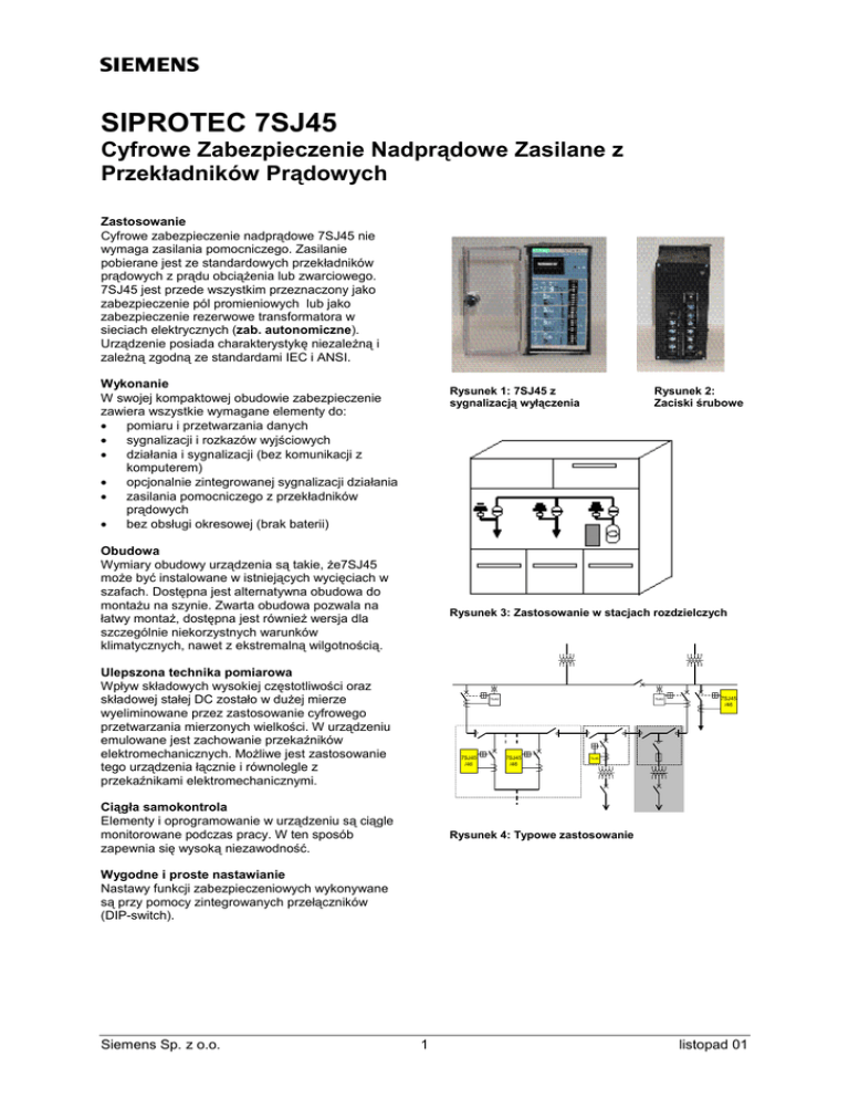 s SIPROTEC 7SJ45 Cyfrowe Zabezpieczenie Nadprądowe Zasilane z Przekładników Prądowych Zastosowanie Cyfrowe zabezpieczenie nadprądowe 7SJ45 nie wymaga zasilania pomocniczego. Zasilanie pobierane jest ze standardowych przekładników prądowych z prądu obciążenia lub zwarciowego. 7SJ45 jest przede wszystkim przeznaczony jako zabezpieczenie pól promieniowych lub jako zabezpieczenie rezerwowe transformatora w sieciach elektrycznych (zab. autonomiczne). Urządzenie posiada charakterystykę niezależną i zależną zgodną ze standardami IEC i ANSI. Wykonanie W swojej kompaktowej obudowie zabezpieczenie zawiera wszystkie wymagane elementy do: · pomiaru i przetwarzania danych · sygnalizacji i rozkazów wyjściowych · działania i sygnalizacji (bez komunikacji z komputerem) · opcjonalnie zintegrowanej sygnalizacji działania · zasilania pomocniczego z przekładników prądowych · bez obsługi okresowej (brak baterii) Rysunek 1: 7SJ45 z sygnalizacją wyłączenia Obudowa Wymiary obudowy urządzenia są takie, że7SJ45 może być instalowane w istniejących wycięciach w szafach. Dostępna jest alternatywna obudowa do montażu na szynie. Zwarta obudowa pozwala na łatwy montaż, dostępna jest również wersja dla szczególnie niekorzystnych warunków klimatycznych, nawet z ekstremalną wilgotnością. Rysunek 2: Zaciski śrubowe Rysunek 3: Zastosowanie w stacjach rozdzielczych Ulepszona technika pomiarowa Wpływ składowych wysokiej częstotliwości oraz składowej stałej DC zostało w dużej mierze wyeliminowane przez zastosowanie cyfrowego przetwarzania mierzonych wielkości. W urządzeniu emulowane jest zachowanie przekaźników elektromechanicznych. Możliwe jest zastosowanie tego urządzenia łącznie i równolegle z przekaźnikami elektromechanicznymi. 7SJ62 7SJ45 /46 Ciągła samokontrola Elementy i oprogramowanie w urządzeniu są ciągle monitorowane podczas pracy. W ten sposób zapewnia się wysoką niezawodność. 7SJ62 7SJ45 /46 7SJ45 /46 7SJ45 Rysunek 4: Typowe zastosowanie Wygodne i proste nastawianie Nastawy funkcji zabezpieczeniowych wykonywane są przy pomocy zintegrowanych przełączników (DIP-switch). Siemens Sp. z o.o. 1 listopad 01 s Opcjonalnie dostępne są wyjścia impulsowe lub przekaźnikowe. Wyjście impulsowe: Urządzenia te wymagają zastosowania w wyłączniku cewek wyłączających o niskim poborze mocy (24V DC / 0,1 Ws) i są przeznaczone do nowoczesnych rozdzielni. W przypadku uszkodzenia wyłącznika inicjowane jest powtórzenie sygnału wyłączającego. 7SJ45XX-0 7SJ45XX-0 X2_2 L1 X2_1 X2_4 + L2 L3 + - X2_3 X2_6 X2_5 X1_4 X1_3 TRIP 24 V DC; 0,1 Ws Rysunek 5: 3-fazowe podłączenie przekładników prądowych z wyjściem impulsowym. Rysunek 6: Schemat podłączeń 7SJ45 z wyjściem impulsowym Wyjście przekaźnikowe: Urządzenia te mogą być stosowane we wszystkich konwencjonalnych rozdzielnicach. Transformator który dostarcza energię do obwodu wyłączania musi być włączony w obwód przekładnika prądowego. 4AM5070-8AB 4AM5065-2CB 7SJ45XX-1 7SJ45XX-1 X2_2 L1 X1_4 X2_1 X2_4 L2 L3 X2_3 X1_2 TRIP X2_6 X1_3 X2_5 3AX1102-2A or 3AX1102-2B Rysunek 7: 3-fazowe podłączenie przekładników prądowych z wyzwalaczem transformatorowych i wyjściem przekaźnikowym. Rysunek 8: Schemat podłączeń 7SJ45 z wyjściem przekaźnikowym 7SJ46 7SJ45 Akcesoria: Dla przekaźnika z wyjściem impulsowym Cewka o niskim poborze mocy 3AX1104-2B Rysunek 9:Rysunki wymiarowe Dla przekaźnika z wyjściem przekaźnikowym Przekładnik prądowy do obwodu wyłączania: 4AM5065-2CB (1A) lub 4AM5070-8AB (5A) cewki wyłączające: 3AXC1102-2A (prąd znamionowy 0,5A) lub 3AXC1102-2B (prąd znamionowy 1A) Siemens Sp. z o.o. 2 listopad 01 s Dane Techniczne: Testy EMC Testy EMC – odporność (testy typu) Ogólne dane urządzenia Wejście analogowe Częstotliwość fn Standardy 50Hz lub 60Hz (nastawial.) Wejścia przekładników prądowych Prąd znamionowy Pobór mocy - na fazę przy In=1A/5A Dopuszczalne przeciążenie - cieplne (rms) - dynamiczne (szczyt) Zalecane przekładniki prądowe Test w.cz. IEC60255-22-1, klasa III 1 A lub 5A ok. 1,4 VA przy In Wyładowanie elektrostatyczne IEC60255-22-2, klasa III EN 61000-4-2, klasa III Pole elektromagnetyczne częstotliwości radiowej, modulacja amplitudy IEC60255-22-3 oraz IEC61000-4-3 klasa III Pole elektromagnetyczne częstotliwości radiowej, modulacja impulsowa IEC61000-4-3/ENV50204 klasa III Przebiegi szybkozmienne IEC60255-22-4 oraz IEC61000-4-4, klasa IV 50 In dla 1s 15 In dla 10s 2 In ciągle 100 In dla półcyklu 10P10 2,5VA 10P10 5VA lub zgodnie z wymaganiami parametrów obwodu wyłączania. Przekaźniki wyjściowe Wyjście impulsowe (7SJ45XX-0*) Liczba 1 wyjście impulsowe 24 V DC / 0,1Ws Wyjście przekaźnikowe (7SJ45XX-1*) Liczba Parametry styków Znam. napięcie styku Dop. prąd styku 1 styk przełączalny ZAŁ 1000W/VA WYŁ 30W rezyst. 40W dla L/R ≤50ms 25VA ≤250 VDC lub ≤380 VAC 5 A ciągły 30 A przy 0,5s (prąd załącz) Napięcie wyładowania o dużej energii IEC61000-4-5, klasa instalacji III, wejścia pomiarowe, wyjścia binarne Przewodzone napięcia zakłóceniowe HF, modulowane amplitudowo, IEC60255-22-6 i IEC610004-6, klasa III Pole magnetyczne częstotliwości sieciowej IEC61000-4-8, klasa IV IEC60255-6 Tłumione oscylacje IEC60694, IEC61000-4-12 Kl. III Testy elektryczne Specyfikacje Standardy IEC60255 (stand. produkt) ANSI C37.90.0/.1/.2 UL508 patrz również standardy poszczególnych testów Testy izolacji Standardy Test napięciowy (test rutynowy) Wszystkie obwody (oprócz impulsowego) Test napięciowy (test typu) na otwartych stykach wykonawczych Test napięciem impulsowym (test typu) Wszystkie obwody, klasa III Siemens Sp. z o.o. IEC60255-5 2,5kV (skut), 50Hz, 1 min Promieniowane zakłócenia elektromagnetyczne ANSI/IEEE C37.90.2 1,5kV (skut), 50Hz, 1 min 5 kV (szczyt); 1,2/50us; 0,5J; 3 dodatnie i 3 ujemne próby w przedziale 5s IEC60255-6; IEC60255-22 EN 50263 EN50082-2 IEC61000-4 2,5kV (szczyt