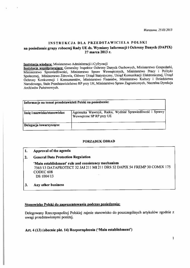 JJws:uwa. 25.03.1013 INSTRUKCJA DLA PRZEDSTAWICIELA POLSKI na posiedzenie grupy roboczej Rady UE ds. Wymiany Informacji i Ochrony Danych (DAPIX) 27 marea 2013 r. Instytucja wiod3ca: Ministerstwj Administracji i Cyfrxiacji Instytucje wspólpracuj3ce: Generalny Inspektor ()chrony Danych Osobowych. Ministerstwo Gospodarki. Ministerstwo Sprawiedliwości. Minisierstyo Spraw Wewnętrznych Ministerstwo Prac\ i Polit\ki Spolecinei Ministerstwo Zdrowia. Glów ny Urząd Satysr\ Cm). Urząd Komunikacji Elektronicznej. Urząd Ochrom Konkurencji i Konsumentów. Ministerstwo Finansów. Minisierstwo Kuhur\ i Dziedzictwa Narodowego. Siale Przedstawicielstwo RP prz LI:. Ministerstwo Spraw Zagraniczinch. \aczelna Dyrekcja Archiwów Państwow\ ch. „ Informacje na temat przedstawicieli Polski na posiedzenie: HImię i nazwisko/stanowisko: Agnieszka \\„awrzyk. Radca. Wxdzial Sprawiedliwość i SprawY \kewnętrrne SP RP przy UE Delegacja towarzysząca: PORZĄDEK OBRAD Approyal of the agenda 2. Ceneral Data Protection Regulation „Main establishment” rule and consistency meehanism 7565/13 DATAPROTECT 32Ml fl MI 2l DRS 52 DAPIX 54 FREMP 30 COMIX 175 CODEC 608 DS 100413 L 3. Any otker business Stanowisko Polski do zaprezentowania podczas posiedzenia: Delegowany Rzeczpospolitej Polskiej ząjmie stanowisko do poszczególnych artykułów zgodnie z uwagi przedslawionyrni poniżej. Art. 4 (13) (obecnie pkt. 14) Rozporządzenia (bMain establishment”) 1 • The culTent definition is oyerly complex and creatcs possibilities for companies that operale in seyeral Member States to choose the Memher State in which main establishmenr will be siluoted. i.e. c/e facto 10 choose superyisory authority (probably the weakest one or with linie enforcement). Such a solution may resuk in Jorurn shopping. • Under the current definition. the main establishment doesnt haye to be located in the Member State where processing takes place this is anothcr faetor which rnay stimulate forum shopping. — • Ihe „main establishment” eriteria allow only for detcrmination of the superyisory auihoritics that will be inyolyed. Please now that there is laek of criterion to address national applicahle law (i.e. sectoral banking or healW rcgulations). Poland suggests inseiting an appropriate dause to remoye uncertainty. Lob. opinia EDPS z dnia 7 marea 2013 r. flis not alwurs clear what nom 11w Regulalion leayes for naliono! law. For instance, to iś”hat exlent arc 11w proyisions oj Chaplers II aud III exhanstiye aud to who! aten! arc proi”isions for specf/k sectors aUowed? Pic EDPS rrcommends Mat t/z/s issue be exwnined more carefżd/y, in order to dec/c/e whether there is a need for a furt/zer prrn”ision spec/ti/ng the exten! to ub/c/z specific nwiona/ /cflYS arc a/ioued. u/rhout prejudice to rhe Regzi/ation cis uzentioned ahore. Dalej: Tiże EDPS ue/es furthennorc hiat Anicie 3 of r/ze Proposal on/v pror/des Jor dciermination of rhe application o/ELI łan. The Proposal does tzolforesee any cd/edo for naliono! applicable law issues. hi priuwipie, a regu/ation wozi/d make a proiisio;i on national appłicable łait” useless. Howeyer. as highlig/zted in part 1J2.a. (iL ilember Star es keep Uze possibiUfl” to adopl specfjic legislation on data prolection, in 11w field oj emplormem or health for inslance. It is not c/car if auzd on what hasis a tiar/wiał czmi secroral c/ata pmtection law or anoiher uzational lcnt” re/eyant hi t/żal conrext cotiłcł be appl/cabłe beyond r/że borders oj/bat Mem ber State. . • H is possihle for un entity to act as both a data controller and a data processor. Jn such cases PL proposes to suhject such eiuity to ihe same rules as the processor as regards the deflnition of main establishmen(. • In liht ofthe aboye adoyting a sjpęr and uniform definition for both the controller aud processor may be a beiter solution (for example the country wherc a giyen entiry is reaistered) W św/er/e prnyi±s:eo, może zaproponować detin/cię siedziby w srandardoitnn znaczeniu (zup, po prostu „locatioui of t/ze European headguaz”rers „7 Art. 51 Rozporządzenia (bCompetence) • There is lack of criterion to address national applicable law. In situation where controller or processor operates in more than one Member State, the superyisory authority may haye to apply sectoral law of a Mcmber Staw other han (he law of the Member Staw ihe supenisory authority is locawd in. (zob. uwagi do art. 4 (13) powyżej). 1 Art. 55 Rozporządzenia (MntuaI assistance”) • Role of thc lead authority should be scen as an exclusiye competence. Moreoyer. a lead authority shall be supported by other superyisory authorities and shall haye measures to elTectiyely dernand such support. Art 73 Rozporządzenia (Right to lodge a complaint with a superyisory authority”) • Article 73(2) allows data subjects to haye a judicial remedy in the country where they reside. indepcndently of the competent supeiwisory authority. This solution rnight lead to situations inyolying a coun i”rom one Member State, and a superyisory authority ofanother Member State. This problem may be especially seyerc in areas coyercd by sectoral rules. Poland feels this mechanism need further clarification in order to ayoid costiy proceedings and disputes. It should be a rule that DPAs cooperate under Chapter VII Section I. • Anicie 73(3) should be dclcted as it grants the right to lodge a complaint to body. organisation or association which does not haye to proye any legal interest in the compiaint procecdings. This proyision may be abused by yexatious organisations. set up specilically to pursue such actions. possibly for gainful purposes.. Art. 74 Rozporządzenia (Right to a judicial remedy against a superyisory authorifl”) • Anicie 74(4) is incoherent and runs against the proyisions of Chapter VII of the draft regulation. On the one hand the drafl regulation places an obligation on superyisory authorities to cooperate and, on the other hand, 