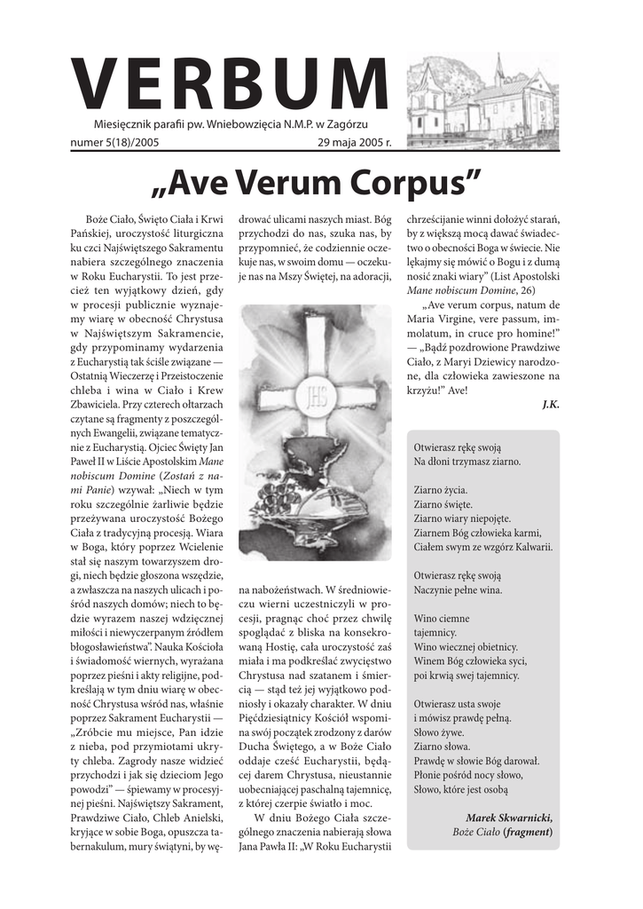 VERBUM Miesięcznik parafii pw. Wniebowzięcia N.M.P. w Zagórzu numer 5(18)/2005 29 maja 2005 r. „Ave Verum Corpus” Boże Ciało, Święto Ciała i Krwi Pańskiej, uroczystość liturgiczna ku czci Najświętszego Sakramentu nabiera szczególnego znaczenia w Roku Eucharystii. To jest przecież ten wyjątkowy dzień, gdy w procesji publicznie wyznajemy wiarę w obecność Chrystusa w Najświętszym Sakramencie, gdy przypominamy wydarzenia z Eucharystią tak ściśle związane — Ostatnią Wieczerzę i Przeistoczenie chleba i wina w Ciało i Krew Zbawiciela. Przy czterech ołtarzach czytane są fragmenty z poszczególnych Ewangelii, związane tematycznie z Eucharystią. Ojciec Święty Jan Paweł II w Liście Apostolskim Mane nobiscum Domine (Zostań z nami Panie) wzywał: „Niech w tym roku szczególnie żarliwie będzie przeżywana uroczystość Bożego Ciała z tradycyjną procesją. Wiara w Boga, który poprzez Wcielenie stał się naszym towarzyszem drogi, niech będzie głoszona wszędzie, a zwłaszcza na naszych ulicach i pośród naszych domów; niech to będzie wyrazem naszej wdzięcznej miłości i niewyczerpanym źródłem błogosławieństwa”. Nauka Kościoła i świadomość wiernych, wyrażana poprzez pieśni i akty religijne, podkreślają w tym dniu wiarę w obecność Chrystusa wśród nas, właśnie poprzez Sakrament Eucharystii — „Zróbcie mu miejsce, Pan idzie z nieba, pod przymiotami ukryty chleba. Zagrody nasze widzieć przychodzi i jak się dzieciom Jego powodzi” — śpiewamy w procesyjnej pieśni. Najświętszy Sakrament, Prawdziwe Ciało, Chleb Anielski, kryjące w sobie Boga, opuszcza tabernakulum, mury świątyni, by wę- drować ulicami naszych miast. Bóg przychodzi do nas, szuka nas, by przypomnieć, że codziennie oczekuje nas, w swoim domu — oczekuje nas na Mszy Świętej, na adoracji, chrześcijanie winni dołożyć starań, by z większą mocą dawać świadectwo o obecności Boga w świecie. Nie lękajmy się mówić o Bogu i z dumą nosić znaki wiary” (List Apostolski Mane nobiscum Domine, 26) „Ave verum corpus, natum de Maria Virgine, vere passum, immolatum, in cruce pro homine!” — „Bądź pozdrowione Prawdziwe Ciało, z Maryi Dziewicy narodzone, dla człowieka zawieszone na krzyżu!” Ave! J.K. Otwierasz rękę swoją Na dłoni trzymasz ziarno. Ziarno życia. Ziarno święte. Ziarno wiary niepojęte. Ziarnem Bóg człowieka karmi, Ciałem swym ze wzgórz Kalwarii. na nabożeństwach. W średniowieczu wierni uczestniczyli w procesji, pragnąc choć przez chwilę spoglądać z bliska na konsekrowaną Hostię, cała uroczystość zaś miała i ma podkreślać zwycięstwo Chrystusa nad szatanem i śmiercią — stąd też jej wyjątkowo podniosły i okazały charakter. W dniu Pięćdziesiątnicy Kościół wspomina swój początek zrodzony z darów Ducha Świętego, a w Boże Ciało oddaje cześć Eucharystii, będącej darem Chrystusa, nieustannie uobecniającej paschalną tajemnicę, z której czerpie światło i moc. W dniu Bożego Ciała szczególnego znaczenia nabierają słowa Jana Pawła II: „W Roku Eucharystii Otwierasz rękę swoją Naczynie pełne wina. Wino ciemne tajemnicy. Wino wiecznej obietnicy. Winem Bóg człowieka syci, poi krwią swej tajemnicy. Otwierasz usta swoje i mówisz prawdę pełną. Słowo żywe. Ziarno słowa. Prawdę w słowie Bóg darował. Płonie pośród nocy słowo, Słowo, które jest osobą Marek Skwarnicki, Boże Ciało (fragment) Kościół żyje przez Eucharystię Na kanwie nauczania Jana Pawła II — Wybrane myśli z pism przygotowanych na Rok Eucharystii Cz. 1 Ojciec Święty Jan Paweł II w dokumentach przygotowanych na Rok Eucharystii, zwłaszcza w Encyklice Ecclesia de Eucharistia oraz w Liście Apostolskim Mane nobiscum Domine, podkreślał, iż Kościół żyje dzięki Eucharystii, która stanowi centrum jego życia i ma niezwykłe wprost znaczenie dla wspólnoty ludu Bożego, pielgrzymującego do niebieskiej Ojczyzny. Właśnie w Eucharystii bowiem, w Sakramencie Ołtarza, Chrystus objawia w pełni ogrom swojej miłości. Eucharystia stale uobecnia paschalną tajemnicę, buduje tajemniczą równoczesność między Ofiarą Chrystusa a mijającymi wiekami. Gdy sprawowana jest Eucharystia, pamiątka śmierci i zmartwychwstania Jezusa, wydarzenie to autentycznie staje się obecne i wciąż dokonuje się dzieło Odkupienia. Eucharystia jednoczy niebo z ziemią, przenika całe stworzenie. Pojmowana jako zbawcza obecność Jezusa we wspólnocie wiernych i jako pokarm duchowy jest czymś najcenniejszym, co Kościół posiada. Zbawcza skuteczność ofiary Chrystusa urzeczywistnia się w pełni podczas Komunii Świętej, która jednoczy wiernych z Chrystusem i otwiera ich na przyjęcie Ducha Świętego. Zjednoczenie z Jezusem w Komunii jest przedsmakiem pełni, która oczeku- je na wiernych w Królestwie Bożym. Eucharystia zaś staje się też wyrazem zjednoczenia z Kościołem zbawionych w niebie. Sakrament Eucharystii jest tajemnicą wiary, chwała Chrystusa jest w nim jakby ukryta, dzięki temu jednak wierzący zostaje wprowadzony w głębię prawdy, a Chrystus staje się dla niego światłem. Eucharystia to źródło i szczyt całej ewangelizacji, ponieważ jej celem jest zjednoczenie ludzi z Chrystusem, a w nim z Ojcem i Duchem Świętym. Dlatego też Eucharystia jest wyrazem jedności Kościoła, wszystkich jego członków. Sakrament Eucharystii daje też siłę do pełnienia misji chrześcijanina — zaangażowania w szerzenie Ewangelii i ożywianie świata duchem chrześcijańskim. „Eucharystia jest bowiem sposobem bycia, który chrześcijanin przejmuje od Jezusa, a przez jego świadectwo ma promieniować na społeczeństwo i kulturę. Aby do tego doszło, każdy wierny musi przyswoić sobie w medytacji osobistej i wspólnotowej wartości, jakie wyraża Eucharystia, postawy, jakie podpowiada, życiowe zamiary, jakie wzbudza” (List Apostolski Mane nobiscum Domine, 25). J.K.