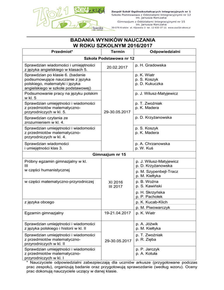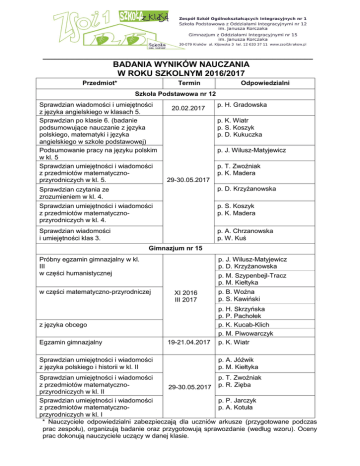 ___________________________________________________________________ BADANIA WYNIKÓW NAUCZANIA W ROKU SZKOLNYM 2016/2017 Przedmiot* Termin Odpowiedzialni Szkoła Podstawowa nr 12 Sprawdzian wiadomości i umiejętności z języka angielskiego w klasach 5. Sprawdzian po klasie 6. (badanie podsumowujące nauczanie z języka polskiego, matematyki i języka angielskiego w szkole podstawowej) Podsumowanie pracy na języku polskim w kl. 5 Sprawdzian umiejętności i wiadomości z przedmiotów matematycznoprzyrodniczych w kl. 5. 20.02.2017 p. H. Gradowska p. K. Wiatr p. S. Koszyk p. D. Kukuczka p. J. Wilusz-Matyjewicz p. T. Zwoźniak p. K. Madera 29-30.05.2017 Sprawdzian czytania ze zrozumieniem w kl. 4. p. D. Krzyżanowska Sprawdzian umiejętności i wiadomości z przedmiotów matematycznoprzyrodniczych w kl. 4. p. S. Koszyk p. K. Madera Sprawdzian wiadomości i umiejętności klas 3. p. A. Chrzanowska p. W. Kuś Gimnazjum nr 15 Próbny egzamin gimnazjalny w kl. III w części humanistycznej w części matematyczno-przyrodniczej p. J. Wilusz-Matyjewicz p. D. Krzyżanowska p. M. Szypenbejl-Tracz p. M. Kiełtyka XI 2016 III 2017 z języka obcego Egzamin gimnazjalny Sprawdzian umiejętności i wiadomości z języka polskiego i historii w kl. II 19-21.04.2017 p. B. Woźna p. S. Kawiński p. H. Skrzyńska p. P. Pachołek p. K. Kucab-Klich p. M. Piwowarczyk p. K. Wiatr p. A. Jóźwik p. M. Kiełtyka Sprawdzian umiejętności i wiadomości p. T. Zwoźniak z przedmiotów matematyczno29-30.05.2017 p. R. Zięba przyrodniczych w kl. II Sprawdzian umiejętności i wiadomości p. P. Jarczyk z przedmiotów matematycznop. A. Kotuła przyrodniczych w kl. I * Nauczyciele odpowiedzialni zabezpieczają dla uczniów arkusze (przygotowane podczas prac zespołu), organizują badanie oraz przygotowują sprawozdanie (według wzoru). Oceny prac dokonują nauczyciele uczący w danej klasie.