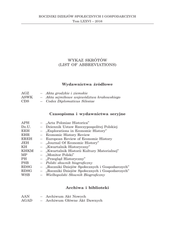 ROCZNIKI DZIEJÓW SPOŁECZNYCH I GOSPODARCZYCH Tom LXXVI – 2016 WYKAZ SKRÓTÓW (LIST OF ABBREVIATIONS) Wydawnictwa źródłowe AGZ ASWK CDS – Akta grodzkie i ziemskie – Akta sejmikowe województwa krakowskiego – Codex Diplomaticus Silesiae Czasopisma i wydawnictwa seryjne APH Dz.U. EEH EHR EREH JEH KH KHKM MP PH PSB RDSG RDSG WSB – – – – – – – – – – – – – – „Acta Poloniae Historica” Dziennik Ustaw Rzeczypospolitej Polskiej „Explorations in Economic History” Economic History Review European Review of Economic History „Journal Of Economic History” „Kwartalnik Historyczny” „Kwartalnik Historii Kultury Materialnej” „Monitor Polski” „Przegląd Historyczny” Polski słownik biograficzny „Roczniki Dziejów Społecznych i Gospodarczych” „Roczniki Dziejów Społecznych i Gospodarczych” Wielkopolski Słownik Biograficzny Archiwa i biblioteki AAN AGAD – Archiwum Akt Nowych – Archiwum Główne Akt Dawnych 560 ANK AP AP Gd. APS B.Czart. BJ BK BN BUW GStA PK Wykaz skrótów – – – – – – – – – – Archiwum Narodowe w Krakowie Archiwum Państwowe Archiwum Państwowe w Gdańsku Archiwum Państwowe w Szczecinie Biblioteka Książąt Czartoryskich w Krakowie Biblioteka Jagiellońska Biblioteka Kórnicka Polskiej Akademii Nauk Biblioteka Narodowa Biblioteka Uniwersytecka w Warszawie Geheimes Staatsarchive Preußischer Kulturbesitz w Berlin-Dahlem