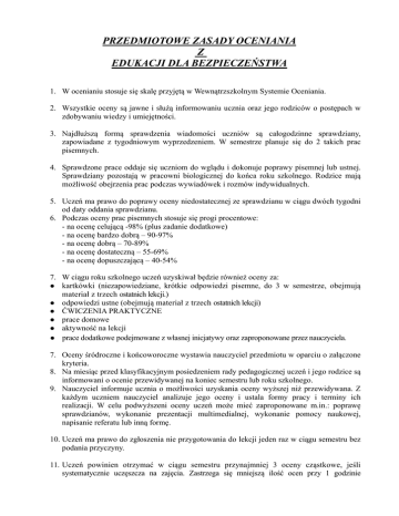 PRZEDMIOTOWE ZASADY OCENIANIA Z EDUKACJI DLA BEZPIECZEŃSTWA 1. W ocenianiu stosuje się skalę przyjętą w Wewnątrzszkolnym Systemie Oceniania. 2. Wszystkie oceny są jawne i służą informowaniu ucznia oraz jego rodziców o postępach w zdobywaniu wiedzy i umiejętności. 3. Najdłuższą formą sprawdzenia wiadomości uczniów są całogodzinne sprawdziany, zapowiadane z tygodniowym wyprzedzeniem. W semestrze planuje się do 2 takich prac pisemnych. 4. Sprawdzone prace oddaje się uczniom do wglądu i dokonuje poprawy pisemnej lub ustnej. Sprawdziany pozostają w pracowni biologicznej do końca roku szkolnego. Rodzice mają możliwość obejrzenia prac podczas wywiadówek i rozmów indywidualnych. 5. Uczeń ma prawo do poprawy oceny niedostatecznej ze sprawdzianu w ciągu dwóch tygodni od daty oddania sprawdzianu. 6. Podczas oceny prac pisemnych stosuje się progi procentowe: - na ocenę celującą -98% (plus zadanie dodatkowe) - na ocenę bardzo dobrą – 90-97% - na ocenę dobrą – 70-89% - na ocenę dostateczną – 55-69% - na ocenę dopuszczającą – 40-54% 7. W ciągu roku szkolnego uczeń uzyskiwał będzie również oceny za: kartkówki (niezapowiedziane, krótkie odpowiedzi pisemne, do 3 w semestrze, obejmują materiał z trzech ostatnich lekcji.) odpowiedzi ustne (obejmują materiał z trzech ostatnich lekcji) ĆWICZENIA PRAKTYCZNE prace domowe aktywność na lekcji prace dodatkowe podejmowane z własnej inicjatywy oraz zaproponowane przez nauczyciela. 7. Oceny śródroczne i końcoworoczne wystawia nauczyciel przedmiotu w oparciu o załączone kryteria. 8. Na miesiąc przed klasyfikacyjnym posiedzeniem rady pedagogicznej uczeń i jego rodzice są informowani o ocenie przewidywanej na koniec semestru lub roku szkolnego. 9. Nauczyciel informuje ucznia o możliwości uzyskania oceny wyższej niż przewidywana. Z każdym uczniem nauczyciel analizuje jego oceny i ustala formy pracy i terminy ich realizacji. W celu podwyższeni oceny uczeń może mieć zaproponowane m.in.: poprawę sprawdzianów, wykonanie prezentacji multimedialnej, wykonanie pomocy naukowej, napisanie referatu lub inną formę. 10. Uczeń ma prawo do zgłoszenia nie przygotowania do lekcji jeden raz w ciągu semestru bez podania przyczyny. 11. Uczeń powinien otrzymać w ciągu semestru przynajmniej 3 oceny cząstkowe, jeśli systematycznie uczęszcza na zajęcia. Zastrzega się mniejszą ilość ocen przy 1 godzinie tygodniowo lub gdy uczeń jest często nieobecny. 12. Uczeń, który opuścił zajęcia ma obowiązek uzupełnić braki spowodowane nieobecnością. Jeśli uczeń opuścił pracę pisemną ma obowiązek ją zaliczyć w terminie uzgodnionym z nauczycielem. Ma przy tym prawo zwrócić się o pomoc do nauczyciela. 13. Uczeń może poprawić oceny cząstkowe z dłuższych prac pisemnych po uwzględnieniu przyczyn i uzgodnieniu z nauczycielem terminu i formy sprawdzenia wiadomości. W przypadku pozostałych ocen może poprawiać tylko oceny niedostateczne. 14. Brak pracy domowej oznacza się minusem. Trzy minusy są równoważne z niedostateczną. 15. Dłuższe prace domowe będą oceniane zgodnie z istniejącym systemem ocenienie. oceną 16. Uczeń aktywnie pracujący na lekcji wyróżniany jest pochwałą ustną i plusem, przy czym trzy plusy oznaczają ocenę bardzo dobrą. 17. Uczniowie, w stosunku do których podjęto decyzję o dostosowaniu wymagań edukacyjnych są traktowani według odrębnych kryteriów uwzględniających ich specyficzne trudności w uczeniu się i zalecenia Poradni Psychologiczno -Pedagogicznej. Uczniom przysługuje: - wydłużenie czasu pracy podczas sprawdzianów - możliwość zamiany odpowiedzi ustnej na pisemną i odwrotnie - dostosowanie prac domowych Dla uczniów posiadających orzeczenie o potrzebie kształcenia specjalnego zastosowane zostaną dodatkowo obniżone progi procentowe podczas prac pisemnych: - na ocenę bardzo dobrą – 86-100% - na ocenę dobrą – 70-85% - na ocenę dostateczną – 50-69% - na ocenę dopuszczającą – 30-49%. W stosunku do wszystkich uczniów z dysfunkcjami zastosowane zostaną zasady wzmacniania poczucia własnej wartości, bezpieczeństwa, motywowania do pracy. 18. Rodzice są informowani o postępach dziecka w nauce poprzez zapisy w dzienniczku ucznia, konsultacje indywidualne i zebrania wywiadówkowe. Henryk Śnieżek Program nauczania EDUKACJI DLA BEZPIECZEŃSTWA w gimnazjum Wydawnictwo Edukacyjne Zofii Dobkowskiej Spis treści Charakterystyka programu . . . . . . . . . . . . . . . . . . . . . . . . . . . . . . . . . . 3 Podstawa programowa kształcenia ogólnego dla gimnazjów i szkół ponadgimnazjalnych . . . . . . . . . . . . . . . . . . . . . . . . . . . . . . . . . 5 Treść podręcznika . . . . . . . . . . . . . . . . . . . . . . . . . . . . . . . . . . . . . . . . . 8 Przewidywane osiągnięcia, ich kontrola i ocena . . . . . . . . . . . . . . . . . 12 Uwagi o realizacji programu nauczania . . . . . . . . . . . . . . . . . . . . . . . . 19 Wykaz podstawowych pomocy i środków dydaktycznych niezbędnych do realizacji treści programowych . . . . . . . . . . . . . . . . . 23 2 Charakterystyka programu Ustawa o powszechnym obowiązku obrony Rzeczypospolitej Polskiej stanowi, że młodzież uczęszczająca do szkół ogólnokształcących i zawodowych podlega obowiązkowi odbywania edukacji dla bezpieczeństwa. Jest ona obowiązkowym przedmiotem nauczania w gimnazjach i szkołach ponadgimnazjalnych. Edukacja dla bezpieczeństwa w gimnazjum ma na celu: zapoznanie uczniów z problematyką powszechnej samoobrony i obrony cywilnej, przygotowanie ich do działania ratowniczego oraz ukształtowanie umiejętności udzielania pierwszej pomocy w nagłych wypadkach. Niniejszy program została opracowany na podstawie następujących dokumentów normatywnych: 1. Rozporządzenie Ministra Edukacji Narodowej z dnia 28 grudnia 2008 r. w sprawie podstawy programowej wychowania przedszkolnego, kształcenia ogólnego w poszczególny