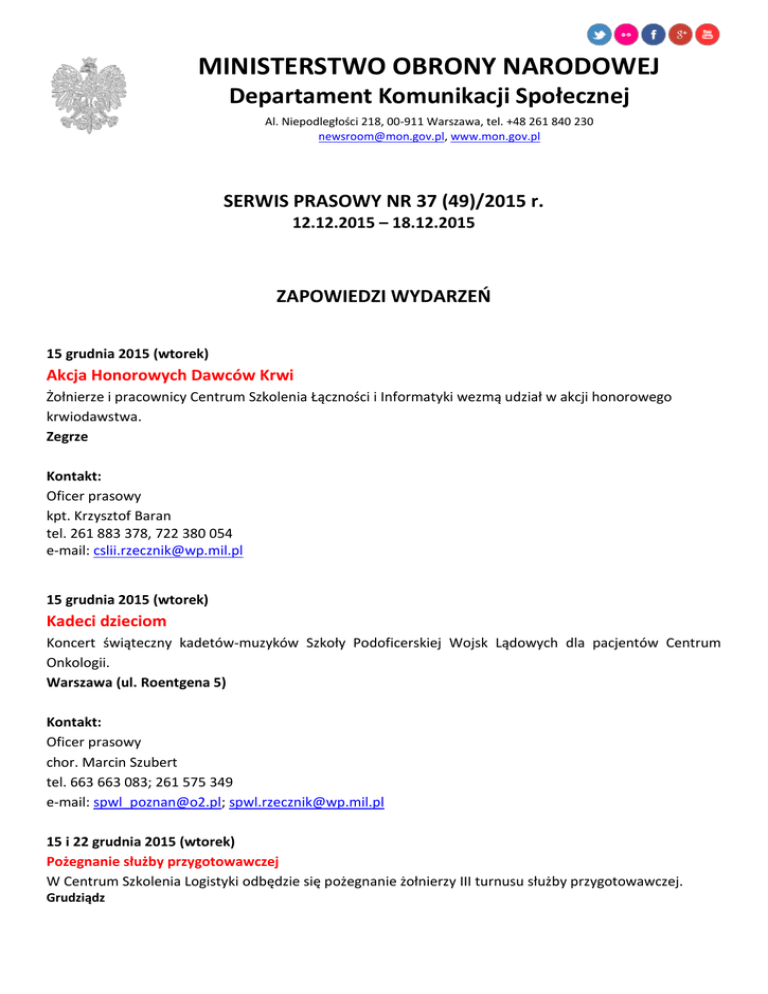 MINISTERSTWO OBRONY NARODOWEJ Departament Komunikacji Społecznej Al. Niepodległości 218, 00-911 Warszawa, tel. +48 261 840 230 [email protected], www.mon.gov.pl SERWIS PRASOWY NR 37 (49)/2015 r. 12.12.2015 – 18.12.2015 ZAPOWIEDZI WYDARZEŃ 15 grudnia 2015 (wtorek) Akcja Honorowych Dawców Krwi Żołnierze i pracownicy Centrum Szkolenia Łączności i Informatyki wezmą udział w akcji honorowego krwiodawstwa. Zegrze Kontakt: Oficer prasowy kpt. Krzysztof Baran tel. 261 883 378, 722 380 054 e-mail: [email protected] 15 grudnia 2015 (wtorek) Kadeci dzieciom Koncert świąteczny kadetów-muzyków Szkoły Podoficerskiej Wojsk Lądowych dla pacjentów Centrum Onkologii. Warszawa (ul. Roentgena 5) Kontakt: Oficer prasowy chor. Marcin Szubert tel. 663 663 083; 261 575 349 e-mail: [email protected]; [email protected] 15 i 22 grudnia 2015 (wtorek) Pożegnanie służby przygotowawczej W Centrum Szkolenia Logistyki odbędzie się pożegnanie żołnierzy III turnusu służby przygotowawczej. Grudziądz Kontakt: Szef Sekcji Wychowawczej mjr Przemysław Grzybowski tel. 261 482 735, 261 482 748 e-mail: [email protected] 17 grudnia 2015 (czwartek) Maple Detachment-15 Żołnierze 25 Brygady Kawalerii Powietrznej wezmą udział w szkoleniu snajperów w ramach polsko – kanadyjskiego szkolenia Maple Detachment-15. Drawsko Pomorskie Kontakt: Oficer prasowy kpt. Tomasz Pierzak tel. 601 066 829 e-mail: [email protected] KRONIKA 4 grudnia 2015 (piątek) Wizyta ministra Macierewicza we Wrocławiu - Przysięgę składają ochotnicy. Ci, którzy z własnej woli, z własnej determinacji, z własnego przekonania o konieczności poświęcenia życia Ojczyźnie raz jeszcze decydują się na to, by oddać narodowi, oddać Polsce to co najcenniejsze - powiedział minister Antoni Macierewicz podczas uroczystej przysięgi wojskowej we Wrocławiu. Więcej… 6 grudnia 2015 (niedziela) Polsko-kanadyjskie szkolenie spadochronowe Na poligonie w Nowej Dębie polscy i kanadyjscy żołnierze - w ramach ćwiczenia MAPLE DETACHMENT '15 wykonywali skoki spadochronowe z pokładu śmigłowca W-3W Sokół. Więcej… 8 grudnia 2015 (wtorek) Wnioski RM do prezydenta o przedłużeniu misji Podczas dzisiejszego posiedzenia rząd skierował wnioski do prezydenta Rzeczypospolitej Polskiej o przedłużenie okresu użycia Polskich Kontyngentów Wojskowych. Więcej… 9 grudnia 2015 (środa) Wizyta podsekretarza stanu w WIM - Chcemy, żeby nasza współpraca w zakresie szkolenia była rozwijana. Aby była to współpraca na miarę potrzeb strony ukraińskiej i na miarę możliwości Wojskowego Instytutu Medycznego – powiedział podczas spotkania z przedstawicielami armii ukraińskiej podsekretarz stanu w MON prof. dr hab. Wojciech Fałkowski. Więcej… 9 grudnia 2015 (środa) Spotkanie z wojskowym korpusem dyplomatycznym W środę podsekretarz stanu w MON Tomasz Szatkowski spotkał się z wojskowym korpusem dyplomatycznym akredytowanym w Polsce. Więcej… 9 grudnia 2015 (środa) Zmiany w Polskiej Grupie Zbrojeniowej We wtorek 8 grudnia 2015 r. walne zgromadzenie wspólników Polskiej Grupy Zbrojeniowej SA wybrało nową radę nadzorczą. Więcej… 10 grudnia 2015 (czwartek) Asysta honorowa na uroczystościach smoleńskich Zgodnie z decyzją ministra obrony narodowej Antoniego Macierewicza, począwszy od 10 grudnia 2015 roku, w organizowanych w Warszawie comiesięcznych uroczystościach upamiętniających ofiary katastrofy smoleńskiej uczestniczyć będzie wojskowa asysta honorowa. Więcej…