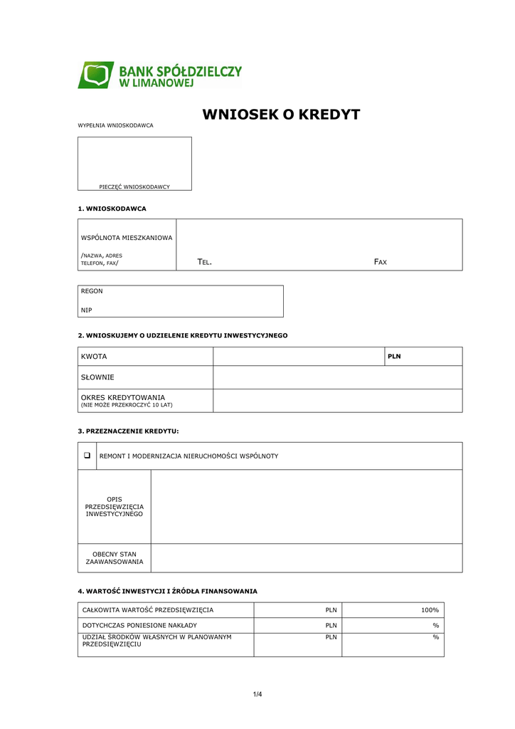 WNIOSEK O KREDYT WYPEŁNIA WNIOSKODAWCA PIECZĘĆ WNIOSKODAWCY 1. WNIOSKODAWCA WSPÓLNOTA MIESZKANIOWA /NAZWA, ADRES TELEFON, FAX/ TEL. FAX REGON NIP 2. WNIOSKUJEMY O UDZIELENIE KREDYTU INWESTYCYJNEGO KWOTA PLN SŁOWNIE OKRES KREDYTOWANIA (NIE MOŻE PRZEKROCZYĆ 10 LAT) 3. PRZEZNACZENIE KREDYTU: REMONT I MODERNIZACJA NIERUCHOMOŚCI WSPÓLNOTY OPIS PRZEDSIĘWZIĘCIA INWESTYCYJNEGO OBECNY STAN ZAAWANSOWANIA 4. WARTOŚĆ INWESTYCJI I ŹRÓDŁA FINANSOWANIA CAŁKOWITA WARTOŚĆ PRZEDSIĘWZIĘCIA PLN 100% DOTYCHCZAS PONIESIONE NAKŁADY PLN % UDZIAŁ ŚRODKÓW WŁASNYCH W PLANOWANYM PRZEDSIĘWZIĘCIU PLN % 1/4 FINANSOWANIE ZEWNĘTRZNE- KREDYTY BANKOWE PLN % INNE PLN % 5. OKRES REALIZACJI PRZEDSIĘWZIĘCIA: TERMIN ROZPOCZĘCIA INWESTYCJI (MIESIĄC/ROK) TERMIN ZAKOŃCZENIA INWESTYCJI (MIESIĄC/ROK) 6. PROSZĘ PODAĆ NAZWĘ FIRMY BĘDĄCEJ GŁÓWNYM WYKONAWCĄ PRZEDSIĘWZIĘCIA INWESTYCYJNEGO (JEŻELI DOTYCZY): NAZWA WYKONAWCY 7. PROSZĘ WSKAZAĆ DLACZEGO GŁÓWNEGO WYKONAWCĘ OCENIACIE PAŃSTWO JAKO WIARYGODNEGO:* GŁÓWNY WYKONAWCA PRZEDSTAWIŁ REFERENCJE DOTYCZĄCE REALIZACJI INWESTYCJI O PODOBNEJ SKALI GŁÓWNY WYKONAWCA PRZEDSTAWIŁ GWARANCJĘ NALEŻYTEGO WYKONANIA UMOWY ZAWARTO UMOWĘ Z GŁÓWNYM WYKONAWCĄ INNE (JEŚLI DOTYCZY, PROSZĘ OKREŚLIĆ INNE PRZYCZYNY) 8. WNIOSKOWANY TERMIN URUCHOMIENIA KREDYTU:* JEDNORAZOWO W DNIU (DZIEŃ/MIESIĄC/ROK) W TRANSZACH /gdy inwestycja realizowana powyżej 6 m-cy/ W DNIU (DZIEŃ/MIESIĄC/ROK) W DNIU (DZIEŃ/MIESIĄC/ROK) W DNIU (DZIEŃ/MIESIĄC/ROK) W DNIU (DZIEŃ/MIESIĄC/ROK) DO WYSOKOŚCI DO WYSOKOŚCI DO WYSOKOŚCI DO WYSOKOŚCI BEZ OKREŚLANIA TERMINU - termin określony zostanie w terminie późniejszym (W PRZYPADKU WIĘKSZEJ ILOŚCI TRANSZ, NALEŻY PRZEDSTAWIĆ W FORMIE ZAŁĄCZNIKA) 9. FORMA SPŁATY KREDYTU:* W NASTĘPUJĄCYCH WSTĘPNIE USTALONYCH TERMINACH I KWOTACH KAPITAŁU (W PRZYPADKU WIĘKSZEJ ILOŚCI RAT NALEŻY PRZEDSTAWIĆ W FORMIE ZAŁĄCZNIKA) W DNIU W WYSOKOŚCI (DZIEŃ/MIESIĄC/ROK) W DNIU W WYSOKOŚCI (DZIEŃ/MIESIĄC/ROK) W DNIU W WYSOKOŚCI (DZIEŃ/MIESIĄC/ROK) W DNIU W WYSOKOŚCI (DZIEŃ/MIESIĄC/ROK) PRZY SPŁACIE ODSETEK:* MIESIĘCZNIE W DNIU MIESIĄCA KWARTALNIE W DNIU OSTATNIEGO MIESIĄCA KWARTAŁU 2/4 10. KARENCJA W SPŁACIE KAPITAŁU PROSIMY O ZASTOSOWANIE KARENCJI W SPŁACIE KAPITAŁU PRZEZ OKRES: (nie dłuższy niż 3 m-ce po wypłacie ostatniej transzy) 11. KREDYT WRAZ Z ODSETKAMI PROPONUJEMY SPŁACAĆ W FORMIE OBCIĄŻENIA NASZEGO RACHUNKU:* BIEŻĄCEGO POMOCNICZEGO NUMER RACHUNKU W ODDZIALE: 12. PROPONOWANE ZABEZPIECZENIE: KRÓTKI OPIS ZABEZPIECZENIA RODZAJ ZABEZPIECZENIA WARTOŚĆ ZABEZPIECZENIA W PLN WARTOŚĆ ZABEZPIECZENIA ZOSTAŁA OKREŚLONA NA PODSTAWIE: PEŁNOMOCNICTWO do dysponowania rachunkiem CESJA wierzytelności z tytułu wpłat członków wspólnoty na fundusz remontowy Cesja praw z polisy ubezpieczenia nieruchomości wspólnej od ognia i innych zdarzeń losowych INNE ŁĄCZNA WARTOŚĆ ZABEZPIECZENIA (PLN) 13. CZY VAT ZWIĄZANY Z TRANSAKCJĄ ZOSTANIE ODLICZONY? TAK NIE NIE DOTYCZY 14. DANE DOTYCZĄCE OSOBY DO KONTAKTU W SPRAWACH KSIĘGOWYCH: IMIĘ I NAZWISKO NUMER TELEFONU 15. DANE DOTYCZĄCE OSOBY DO KONTAKTU W SPRAWACH INNYCH NIŻ KSIĘGOWE: IMIĘ I NAZWISKO NUMER TELEFONU 1. OŚWIADCZAM, ŻE ZOSTAŁEM POINFORMOWANY PRZEZ BANK SPÓŁDZIELCZY W LIMANOWEJ O: 1) FAKCIE PRZETWARZANIA MOICH DANYCH OSOBOWYCH I CELU ZBIERANIA DANYCH, TJ. O WYKONYWANIU WSZELKICH NIEZBĘDNYCH DO ZAWARCIA LUB WYKONANIA UMOWY KREDYTOWEJ, 2) MOŻLIWOŚCI PRZEKAZYWANIA MOICH DANYCH OSOBOWYCH PODMIOTOM WYMIENIONYM W ART. 105-106C USTAWY SIERPNIA 1997 R. PRAWO BANKOWE (TEKST JEDNOLITY DZ. U. Z 2002 R. NR 72, POZ. 665, Z PÓŹN. ZM.), 3/4 CZYNNOŚCI Z DNIA 29 3) UPRAWNIENIACH PRZYSŁUGUJĄCYCH MI NA PODSTAWIE ART. DZ. U. SWOICH DANYCH ORAZ ICH POPRAWIANIA, DANYCH OSOBOWYCH 4) (TEKST JEDNOLITY Z 24 UST. 1 PKT 3 USTAWY Z 2002R. NR 101 POZ. 926, Z PÓŹN. DNIA 29 SIERPNIA 1997R. O OCHRONIE ZM.), TJ. O PRAWIE DOSTĘPU DO TREŚCI PODSTAWIE PRAWNEJ ZBIERANIA DANYCH OSOBOWYCH, TJ. USTAWIE Z DNIA 29 SIERPNIA 1997 R. PRAWO BANKOWE (TEKST DZ. U. Z 2002 R. NR 72, POZ. 665, Z PÓŹN. ZM.). ** NA PODSTAWIE ART.15 UST. 1 I ART. 47 UST. 2 USTAWY Z DNIA 14 LUTEGO 2003 R. O UDOSTĘPNIANIU INFORMACJI GOSPODARCZYCH (DZ. U. NR 50, POZ. 424) UPOWAŻNIAM BANK SPÓŁDZIELCZY W LIMANOWEJ DO WYSTĄPIENIA ZA POŚREDNICTWEM BIURA INFORMACJI KREDYTOWEJ S.A. Z SIEDZIBĄ W WARSZAWIE - BIURO OBSŁUGI KLIENTA PRZY UL. PRUSZKOWSKIEJ 17, 02-119 WARSZAWA, DO BIUR INFORMACJI GOSPODARCZEJ O UJAWNIENIE INFORMACJI GOSPODARCZYCH DOTYCZĄCYCH MOICH ZOBOWIĄZAŃ. WYRAŻAM ZGODĘ NA GROMADZENIE, PRZetwarzanie i udostępnianie przez BANK SPÓŁDZIELCZY W LIMANOWEJ z siedzibą w Limanowej, RYNEK 7 ORAZ BIURO INFORMACJI KREDYTOWEJ S.A. Z SIEDZIBĄ W WARSZAWIE – BIURO OBSŁUGI KLIENTA PRZY UL. PRUSZKOWSKIEJ 17, 02-119 WARSZAWA PRZEKAZANYCH PRZEZ BANK, A DOTYCZĄCYCH MNIE INFORMACJI ORAZ ZAPYTAŃ BANKÓW, STANOWIĄCYCH TAJEMNICĘ BANKOWĄ, POWSTAŁYCH W ZWIĄZKU ZE ZŁOŻENIEM PRZEZE MNIE WNIOSKU SKUTKUJĄCEGO PODJĘCIEM PRZEZ BANK CZYNNOŚCI BANKOWYCH, PRZEZ OKRES NIE DŁUŻSZY, NIŻ 2 LATA OD DNIA OTRZYMANIA PRZEZ BIURO INFORMACJI KREDYTOWEJ S.A. TAKIEJ INFORMACJI LUB ZAPYTANIA I W ZAKRESIE PRZEWIDZIANYM PRZEPISAMI USTAWY Z DNIA 29 SIERPNIA 1997R. PRAWO BANKOWE ORAZ INNYCH USTAW. WYRAŻAM ZGODĘ NA PRZETWARZANIE DANYCH OSOBOWYCH, ZAWARTYCH W NINIEJSZYM WNIOSKU W CELU ZAWARCIA I REALIZACJI PRZEDMIOTOWEJ TRANSAKCJI ORAZ DZIAŁAŃ MARKETINGOWYCH PROWADZONYCH PRZEZ BANK SPÓŁDZIELCZY W LIMANOWEJ Oświadczam pod rygorem odpowiedzialności karnej przewidzianej w art. 297 § 1 Kodeksu karnego, że informacje podane w tym wniosku są zgodne ze stanem faktycznym. JEDNOLITY 2. 3. 4. 5. WYRAŻAMY ZGODĘ, ABY BANK POBRAŁ ZA ROZPATRZENIE WNIOSKU OPŁATĘ ZGODNIE Z TARYFĄ OPŁAT I PROWIZJI BANKU SPÓŁDZIELCZEGO W LIMANOWEJ MIEJSCOWOŚĆ, DATA PODPIS I PIECZĘĆ FIRMOWA WNIOSKODAWCY WYPEŁNIA PRACOWNIK BANKU ODDZIAŁ BANKU SPÓŁDZIELCZEGO W LIMANOWEJ DATA ZŁOŻENIA WNIOSKU WNIOSEK KO