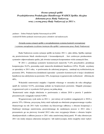 Ocena sytuacji spółki Przedsiębiorstwa Produkcyjno Handlowego WADEX Spółka Akcyjna dokonana przez Radę Nadzorczą wraz z oceną pracy Rady Nadzorczej za 2011 r. podstaw : Dobre Praktyki Spółek Notowanych na GPW rozdział III Dobre praktyki stosowane przez członków rad nadzorczych. Zwięzła ocena sytuacji spółki z uwzględnieniem systemu kontroli wewnętrznej i systemu zarządzania ryzykiem istotnym dla spółki i samoocena pracy Rady Nadzorczej Rada Nadzorcza ocenia sytuacje spółki na koniec 2011 r. jako dobrą. Spółka zajmuje się przetwórstwem blach nierdzewnych i kwasoodpornych . Jest czołowym producentem systemów odprowadzania spalin, jak również uznanym kooperantem wielu uznanych firm. W 2011 r. produkcja systemów kominowych stanowiła 71,8% przychodów; produkcja kooperacyjna 18,2%, pozostałą część stanowiła działalność handlowa (10%). Wynik uzyskany ze sprzedaży w 2011 roku, w porównaniu do założonej prognozy, zamknął się rozbieżnością na poziomie 20%. Podstawowa działalność (sprzedaż systemów kominowych w kraju i działalność handlowa) ma odchylenia na poziomie 10%, kooperacja wygenerowała rozbieżność zbliżoną do 40%. Wskaźniki rentowności majątku i kapitału własnego w stosunku do roku ubiegłego spadł do wartości 9,53%, pozostając jednak na bezpiecznym poziomie. Majątek pracujący wygenerował zysk w wysokości 0,65 groszy na jedną akcję Rentowność netto uległa obniżeniu w porównaniu z rokiem 2010 o prawie 5 punktów procentowych i osiągnęła wartość 9,98% Wygenerowany zysk netto za 2011 r. jest niższy od wyników osiągniętych w 2010 o prawie 35%. Główną przyczyną, który miał wpłynęła na obniżenie prognozowanego wyniku finansowego na rok 2011 było wycofanie się kluczowego odbiorcy z obszaru kooperacji z finalizacji istotnego zamówienia, przewidzianego do zamknięcia jeszcze w 2011 roku i przesuniecie go na pierwszy kwartał 2012 roku oraz rezygnacja klienta z obszaru krajów skandynawskich z odbioru jeszcze w 2011 roku zamówionej dużej partii. W roku obrotowym 2011 nie miały miejsca zdarzenia nietypowe lub nadzwyczajne, które mogłyby mieć wpływ na poziom generowanych wyników. Zwiększeniu uległ kapitał własny spółki, który w porównaniu z rokiem 2010 wzrósł o prawie 37%. Nie ma większych zagrożeń w rozwoju działalności Spółki w najbliższym okresie. Istotne czynniki ryzyka, na jakie narażona jest spółka to: uzależnienie są od sytuacji makroekonomicznej i tempa wzrostu gospodarczego na rynkach eksportowych, na których prowadzona jest działalność spółki ( tj Skandynawii, Niemczech, Litwie, Łotwie , Estonii, Czech i Austrii); poziom rozwoju budownictwa mieszkaniowego i przemysłowego w Polsce; pogorszenie się zdolności płatniczej odbiorców; udział kosztów zakupu materiałów w kosztach działalności operacyjnej; struktura odbiorców spółki i zmiany kursowe. Jednym z głównych założeń długoterminowych planów Zarządu jest osiągnięcie jak uniezależnienia od branży systemów odprowadzania spalin i systematyczne zwiększanie w strukturze przychodów segmentu kooperacji, który charakteryzuje się znacząco wyższymi marżami i jednocześnie jest znacznie mniej narażony na ryzyko zmian cen surowców (ryzyko przejmuje na siebie zlecający). Produkcja kooperacyjna w cenie zawiera zdecydowanie większą wartość dodaną wynikającą ze skomplikowania wyrobu lub złożoności usługi, konieczności opracowania, wdrożenia dokumentacji technologicznej i opracowania designu oraz nisko wolumenowego charakteru zleceń. Usługi kooperacyjne nabierają w ostatnim okresie coraz większego znaczenia na rynku krajowym jak i na rynkach krajów europejskich. Zarząd poszukując oszczędności kosztów starają się optymalizować swoją strukturę produkcji zlecając na zewnątrz wytwarzanie półwyrobów czy też wybranych wyrobów ze swojej oferty handlowej. Wiele przedsiębiorstw, przekształcając swoją strukturę produkcji i dostosowując się do realiów rynkowych staje się montowniami wyrobu finalnego bądź też dystrybutorami wyrobów, wykonywanych w całości przez podmioty zewnętrzne. Spółka współpracuje z wieloma firmami tak krajowymi jak i zagranicznymi, będącymi liderami w swojej branży a szukającymi kooperantów do produkcji małoseryjnych półwyrobów jak też wyrobów gotowych. Nawiązane już kontakty i opinia o szerokiej ofercie usługowej przedsiębiorstwa sprawiają, że ilość nowych zapytań ofertowych systematycznie rośnie. W ocenie Rady sprawozdanie Zarządu z działalności spółki za rok 2011 r. zawiera wszystkie informacje dotyczące funkcjonowania spółki w roku obrotowym. Rada Nadzorcza po zapoznaniu się z Opinią i Raportem Biegłego Rewidenta, nie zgłasza żadnych uwag do sprawozdania finansowego spółki za 2011 r. Praca Zarządu w całym 2011 r. widoczna była we wszystkich obszarach funkcjonowania spółki. Spółka posiada stabilne źródło przychodów, stabilną płynność finansową i korzystna strukturę bilansu. Na bieżąco przestrzegane są procedury Systemu Zarządzania Jakością i ryzykiem, które dla Zarządu stanowią ważne źródło w procesie zarządzania. Ten zakres funkcjonowania spółki podlega również kontroli Rady, stosownie do przepisów. Rada Nadzorcza monitorowała wywiązywanie się Zarządu z obowiązków informacyjnych spoczywających na spółkach notowanych na GPW w Warszawie. Zarząd wywiązywał się z bieżącego informowania akcjonariuszy o istotnych zdarzeniach, które miały wpływ na kondycję finansową spółki. Ponadto stosował się do zasad ładu korporacyjnego zgodnie z oświadczeniem Zarządu opublikowanym wraz z raportem rocznym za rok 2010r. Prawidłowo zwoływał Walne Zgromadzenia Akcjonariuszy i rzetelnie informował o postanowieniach Walnego Zgromadzenia. W 2011 r. Komitet Audytu komitet audytu wspomagał Radę Nadzorczą ( której jest częścią) w sp