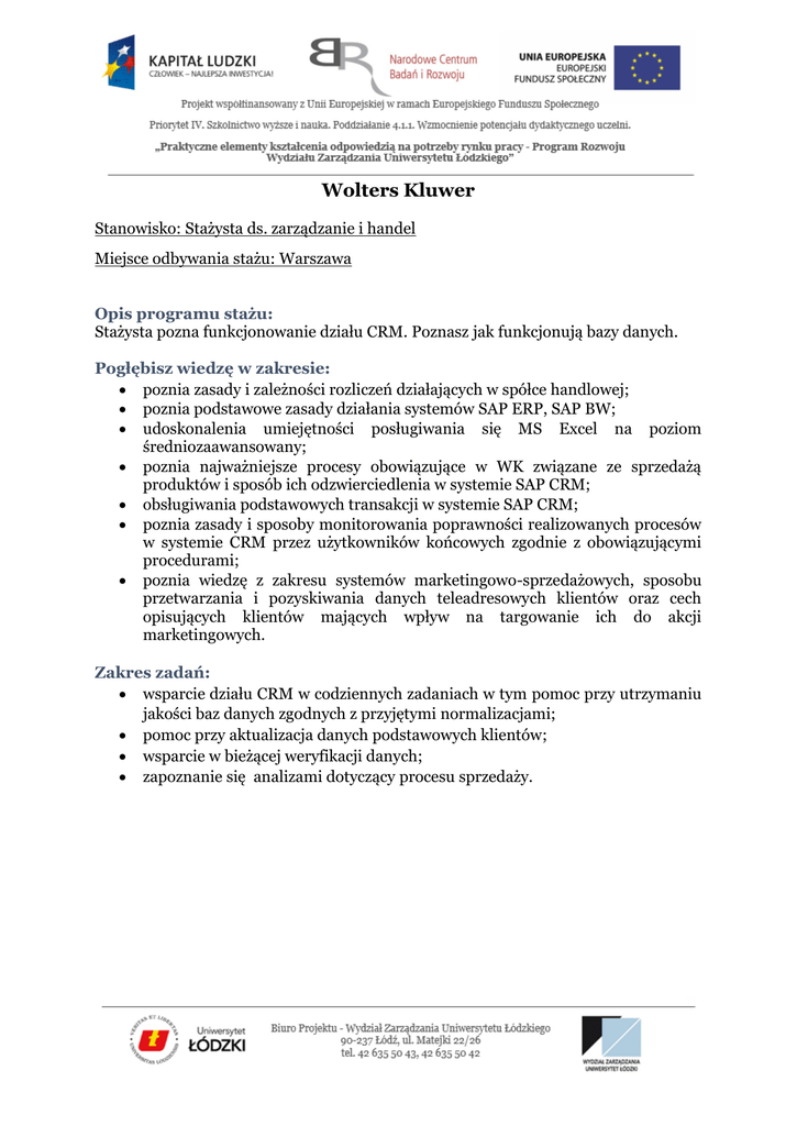 Wolters Kluwer Stanowisko: Stażysta ds. zarządzanie i handel Miejsce odbywania stażu: Warszawa Opis programu stażu: Stażysta pozna funkcjonowanie działu CRM. Poznasz jak funkcjonują bazy danych. Pogłębisz wiedzę w zakresie: poznia zasady i zależności rozliczeń działających w spółce handlowej; poznia podstawowe zasady działania systemów SAP ERP, SAP BW; udoskonalenia umiejętności posługiwania się MS Excel na poziom średniozaawansowany; poznia najważniejsze procesy obowiązujące w WK związane ze sprzedażą produktów i sposób ich odzwierciedlenia w systemie SAP CRM; obsługiwania podstawowych transakcji w systemie SAP CRM; poznia zasady i sposoby monitorowania poprawności realizowanych procesów w systemie CRM przez użytkowników końcowych zgodnie z obowiązującymi procedurami; poznia wiedzę z zakresu systemów marketingowo-sprzedażowych, sposobu przetwarzania i pozyskiwania danych teleadresowych klientów oraz cech opisujących klientów mających wpływ na targowanie ich do akcji marketingowych. Zakres zadań: wsparcie działu CRM w codziennych zadaniach w tym pomoc przy utrzymaniu jakości baz danych zgodnych z przyjętymi normalizacjami; pomoc przy aktualizacja danych podstawowych klientów; wsparcie w bieżącej weryfikacji danych; zapoznanie się analizami dotyczący procesu sprzedaży.