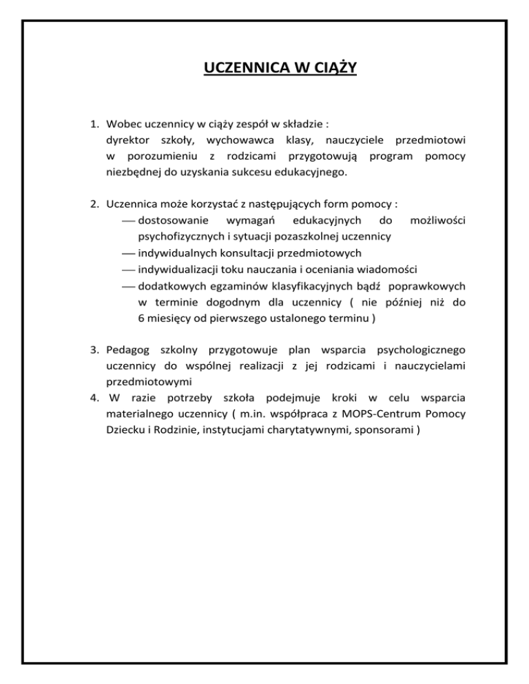 UCZENNICA W CIĄŻY 1. Wobec uczennicy w ciąży zespół w składzie : dyrektor szkoły, wychowawca klasy, nauczyciele przedmiotowi w porozumieniu z rodzicami przygotowują program pomocy niezbędnej do uzyskania sukcesu edukacyjnego. 2. Uczennica może korzystad z następujących form pomocy : dostosowanie wymagao edukacyjnych do możliwości psychofizycznych i sytuacji pozaszkolnej uczennicy indywidualnych konsultacji przedmiotowych indywidualizacji toku nauczania i oceniania wiadomości dodatkowych egzaminów klasyfikacyjnych bądź poprawkowych w terminie dogodnym dla uczennicy ( nie później niż do 6 miesięcy od pierwszego ustalonego terminu ) 3. Pedagog szkolny przygotowuje plan wsparcia psychologicznego uczennicy do wspólnej realizacji z jej rodzicami i nauczycielami przedmiotowymi 4. W razie potrzeby szkoła podejmuje kroki w celu wsparcia materialnego uczennicy ( m.in. współpraca z MOPS-Centrum Pomocy Dziecku i Rodzinie, instytucjami charytatywnymi, sponsorami )