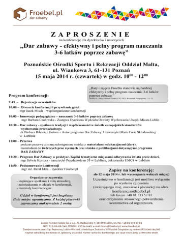 ZAPROSZENIE na konferencję dla dyrektorów i nauczycieli „Dar zabawy - efektywny i pełny program nauczania 3-6 latków poprzez zabawę” Poznańskie Ośrodki Sportu i Rekreacji Oddział Malta, ul. Wiankowa 3, 61-131 Poznań 15 maja 2014 r. (czwartek) w godz. 1000 - 1200 Program konferencji: „Dary i zajęcia Froebla stanowią najbardziej efektywny i pełny program nauczania 3-6 latków poprzez zabawę.” Heiland H. (2000), Friedrich Fröebel (1782-1852), Kwartalnik Pedagogiczny, ½ s. 33. 9:45 – Rejestracja uczestników 10:00 – Otwarcie konferencji i przywitanie gości mgr Jacek Misch – współorganizator konferencji 10:05 – Innowacje pedagogiczne – nauczanie 3-6 latków poprzez zabawę mgr Barbara Czołowska - Zastępca Dyrektora Wydziału Oświaty Wychowania Urzędu Miasta Lublin 10:30 – Dar zabawy - spotkanie tradycji i współczesności w świetle europejskich standardów wychowania przedszkolnego dr Barbara Bilewicz Kuźnia – Autor programu Dar Zabawy, Uniwersytet Marii Curie Skłodowskiej w Lublinie 11:00 – Przerwa podczas przerwy zostaną udostępnione stoiska z materiałami edukacyjnymi (dary), materiałami do twórczych prac ręcznych oraz stoisko z publikacjami dotyczącymi programu DAR ZABAWY 11:20 – Program Dar Zabawy w praktyce. Kąciki tematyczne miejscami odkrywania świata przez dzieci. mgr Sylwia Kustosz - nauczyciel Przedszkola nr 33 w Lublinie, doktorantka UMCS w Lublinie 11:50 – Podsumowanie konferencji mgr inż. Rafał Iskra – dyrektor Froebel.pl Zapisy na konferencję: (do Organizator zapewnia: - inspirujące spotkanie i miłą atmosferę, - zaświadczenia o udziale w konferencji, - materiały konferencyjne. Udział w konferencji jest bezpłatny Ilość miejsc ograniczona. Z każdej placówki zapraszamy maksymalnie 2 osoby. 12 maja 2014 r. lub wyczerpania wolnych miejsc) Uczestnictwo w konferencji jest możliwe wyłącznie po wysłaniu zgłoszenia (zwierającego imię, nazwisko i placówkę) na adres: [email protected] lub faxem +48 81 533 57 81 oraz otrzymaniu stosownego potwierdzenia uczestnictwa od organizatora.