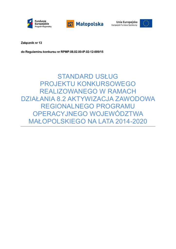 Załącznik nr 13 do Regulaminu konkursu nr RPMP.08.02.00-IP.02-12-009/15 STANDARD USŁUG PROJEKTU KONKURSOWEGO REALIZOWANEGO W RAMACH DZIAŁANIA 8.2 AKTYWIZACJA ZAWODOWA REGIONALNEGO PROGRAMU OPERACYJNEGO WOJEWÓDZTWA MAŁOPOLSKIEGO NA LATA 2014-2020 Zawartość 1. IDENTYFIKACJA INDYWIDUALNYCH POTRZEB – INDYWIDUALNY PLAN DZIAŁANIA (IPD) .................................................................................................................................. 3 2. PORADNICTWO ZAWODOWE INDYWIDUALNE ................................................................. 5 3. PORADNICTWO ZAWODOWE GRUPOWE ........................................................................... 6 4. WSPARCIE MOTYWACYJNE (PSYCHOLOGICZNE)........................................................... 7 5. PRACA METODĄ TRENERA ZATRUDNIENIA WSPIERANEGO (TZW) ........................... 7 6. POŚREDNICTWO PRACY ......................................................................................................... 8 7. SZKOLENIA .................................................................................................................................. 9 8. STAŻE, PRAKTYKI ZAWODOWE, WOLONTARIAT ........................................................... 17 9. DOTACJE NA DOPOSAŻENIE I WYPOSAŻENIE STANOWISKA U PRACODAWCY . 20 10. SUBSYDIOWANE ZATRUDNIENIE ........................................................................................ 20 11. ZATRUDNIENIE WSPOMAGANE ........................................................................................... 21 12. WSPARCIE ADAPTACYJNE DLA PRACOWNIKA, KTÓRY UZYSKAŁ ZATRUDNIENIE W RAMACH PROJEKTÓW, W TYM SZKOLENIA I DORADZTWO .......................................... 22 13. INICJATYWY NA RZECZ PODNOSZENIA ZDOLNOŚCI DO MOBILNOŚCI GEOGRAFICZNEJ ............................................................................................................................. 22 14. WSPARCIE TOWARZYSZĄCE ............................................................................................... 24 1 Wskazany katalog nie obejmuje wszystkich możliwych do zastosowania form wsparcia w ramach konkursu nr RPMP.08.02.00-IP.02-12-009/15. Standard usług stanowi minimum wymagań, które należy uwzględnić podczas stosowania opisanych w nim form wsparcia. Wnioskodawca przygotowując wniosek o dofinansowanie może przewidzieć inne instrumenty i usługi mające pozytywny wpływ na aktywizację zawodową osób pozostających bez pracy. W takim wypadku wszystkie inne formy powinny być przez projektodawcę opisane we wniosku o dofinansowanie wraz ze sposobem ich dokumentowania analogicznie jak w przypadku form wsparcia opisanych w niniejszym Standardzie. 2 1. IDENTYFIKACJA INDYWIDUALNYCH INDYWIDUALNY PLAN DZIAŁANIA (IPD) – POTRZEB 1. Indywidualny Plan Działania jest opracowywany przez doradcę klienta we współpracy z uczestnikiem projektu. IPD ma na celu zdiagnozowanie potrzeb uczestnika projektu i jest dokumentem, który zawiera: a) charakterystykę pomocy świadczonej podejmowanie konkretnych uczestnikowi przedsięwzięć w projektu, celu ułatwiającej rozwiązania problemu zawodowego uczestnika projektu b) zaplanowaną aktywność uczestnika projektu w kierunku zmiany umożliwiającej uzyskanie zatrudnienia, c) efekt ustaleń wyrażony w formie pisemnej, zawierający cele i alternatywy zawodowe, działania i terminy ich realizacji po ustaleniu w trakcie pracy z uczestnikiem projektu. 2. Cele szczegółowe, które przyświecają realizacji IPD są konsekwentnie realizowane w trakcie całego procesu wsparcia uczestnika projektu. Dotyczyć one mogą np.: a) rozwiązania określonego problemu zawodowego, b) podniesienia kompetencji/ uzyskania kwalifikacji. 3. Realizacja Indywidualnego Planu Działania powinna uwzględniać możliwe i starannie zaplanowane formy wsparcia. Są to m.in.: poradnictwo zawodowe (indywidualne i grupowe), wsparcie motywacyjne (psychologiczne), praca metodą trenera zatrudnienia wspieranego, pośrednictwo pracy, usługi szkoleniowe – szkolenia, staże i praktyki zawodowe, subsydiowanie zatrudnienia, dodatek relokacyjny. 4. IPD może być prowadzony w formie Karty zawierającej co najmniej następujące informacje: a) dane osobowe uczestnika projektu, b) oświadczenie uczestnika, że przystępuje do IPD i został poinformowany o założeniach IPD, swoich prawach i obowiązkach z tego wynikających, c) działania możliwe do zastosowania w ramach projektu wobec każdego uczestnika, d) działania planowane do samodzielnej realizacji przez uczestnika projektu w celu poszukiwania pracy, e) planowane terminy realizacji poszczególnych działań, jeśli takie zostaną ustalone w trakcie pracy z uczestnikiem, f) propozycje dodatkowego wsparcia specjalistycznego, dostosowanego do potrzeb uczestnika projektu, g) terminy i warunki zakończenia realizacji indywidualnego planu działania. Doradca klienta kontaktuje się z uczestnikiem projektu poprzez: pisemną korespondencję, indywidualne (bezpośrednie lub telefoniczne) rozmowy, spotkania grupowe oraz kontakty on-line. 3 5. IPD podlega stałej weryfikacji, tzn. może ulegać zmianie w trakcie pracy z klientem. Weryfikacja IPD wskazana jest szczególnie w przypadku gdy stosowane formy wsparcia nie przynoszą rezultatów. Należy wówczas uwzględnić modyfikację IPD pod kątem dodatkowych czynników, które pojawiły się w trakcie pracy z uczestnikiem projektu. Uczestnik projektu ma prawo do konsultacji z pracownikiem projektu prowadzącym IPD wątpliwości co do realizacji IPD, weryfikacji lub modyfikacji IPD. 6. IPD wymaga uwzględnienia kilku etapów: 1) Diagnoza. Określenie obecnej sytuacji uczestnika projektu. 2) Wizja/cel. Określenie wizji przyszłej aktywności zawodowej uczestnika projektu. Jaki chce osiągnąć cel? 3) Diagnoza zasobów oraz deficytów. Jak potencjał uczestnika projektu bądź jego deficyty wpłyną na realizację założonych celów? 4) Strategia/Plany. O