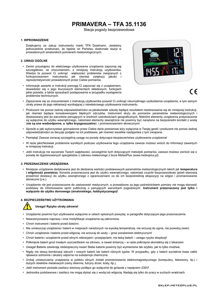 PRIMAVERA – TFA 35.1136 Stacja pogody bezprzewodowa 1. WPROWADZENIE Dziękujemy za zakup instrumentu marki TFA Dostmann. Jesteśmy jednocześnie przekonani, że będzie on Państwu doskonale służył w prowadzonych amatorskich pomiarach meteorologicznych. 2. UWAGI OGÓLNE • Zanim przystąpisz do właściwego użytkowania urządzenia zapoznaj się szczegółowo, ze zrozumieniem, z niniejszą instrukcją użytkownika. Wiedza ta pozwoli Ci uniknąć większości problemów związanych z funkcjonowaniem instrumentu jak również zwiększy jakość i reprezentatywność prowadzonych przez Ciebie pomiarów. • Informacje zawarte w instrukcji pomogą Ci zapoznać się z urządzeniem, dowiedzieć się o jego kluczowych elementach składowych, funkcjach jakie posiada, a także sposobach postępowania w przypadku wystąpienia problemów technicznych. • Zapoznanie się ze zrozumieniem z instrukcją użytkownika pozwoli Ci uniknąć nieumyślnego uszkodzenia urządzenia, a tym samym utraty prawa do jego reklamacji wynikającej z niewłaściwego użytkowania instrumentu. • Producent nie ponosi żadnej odpowiedzialności za jakiekolwiek szkody będące rezultatem niestosowania się do niniejszej instrukcji, jak również będące konsekwencjami błędnych odczytów. Instrument służy do pomiarów parametrów meteorologicznych i dostosowany jest do warunków panujących w średnich szerokościach geograficznych. Niektóre elementy urządzenia przeznaczone są wyłącznie do użytku wewnętrznego, natomiast elementy zewnętrzne nie powinny być narażone na bezpośredni kontakt z wodą (nie są one wodoodporne, a tylko bryzgoszczelne) i promieniowaniem słonecznymi. • Sposób w jaki wykorzystasz gromadzone przez Ciebie dane pomiarowe leży wyłącznie w Twojej gestii i producent nie ponosi żadnej odpowiedzialności za decyzje podjęte na ich podstawie, jak również wszelkie następstwa z tym związane. • Pamiętaj! Zawsze zwracaj szczególną uwagę na porady dotyczące bezpieczeństwa użytkowania urządzenia! • W razie jakichkolwiek problemów wynikłych podczas użytkowania tego urządzenia zawsze możesz wrócić do informacji zawartych w niniejszej instrukcji. • Jeśli instrukcja nie wyczerpie Twoich wątpliwości, szczególnie tych dotyczących metodyki pomiarów, zawsze możesz zwrócić się o poradę do dyplomowanych specjalistów z zakresu meteorologii z biura MeteoPlus (www.meteoplus.pl). 3. PRZEZNACZENIE URZĄDZENIA • Niniejsze urządzenie dedykowane jest do śledzenia wartości podstawowych parametrów meteorologicznych takich jak temperatura i wilgotność powietrza. Konsola przeznaczona jest do użytku wewnętrznego, natomiast czujniki bezprzewodowe (jeżeli stanowią przedmiot dostawy) do użytku zewnętrznego z ograniczeniami co do ich bezpośredniej ekspozycji na wilgoć i promieniowanie słoneczne (j.w.). • Urządzenie nie jest przeznaczone do zastosowań medycznych, a prowadzone za jego pośrednictwem pomiary nie mogą stanowić podstawy do informowania opinii publicznej o panujących warunkach pogodowych. Instrument przeznaczony jest tylko i wyłącznie do użytku domowego (amatorskiego, hobbystycznego)! 4. BEZPIECZEŃSTWO UŻYTKOWANIA Uwaga! Ryzyko utraty zdrowia! • Urządzenie powinno być użytkowane wyłącznie w celach opisanych powyżej, w paragrafie dotyczącym jego przeznaczenia. • Nieautoryzowane naprawy i inne modyfikacje urządzenia są zabronione. • Chroń instrument i baterie przed dziećmi. • Nie umieszczaj urządzenia i baterii w miejscach narażonych na wysoką temperaturę, nie wrzucaj do ognia, nie powoduj zwarć. • Chroń urządzenie i baterie przed wilgocią, nie wrzucaj do wody – grozi porażeniem elektrycznym! • Chroń baterie i urządzenie przed silnymi wibracjami i przepięciami, nie ładuj baterii – uwaga ryzyko eksplozji! • Połknięcie baterii grozi trwałym uszczerbkiem na zdrowiu, a nawet śmiercią – w razie połknięcia skontaktuj się z lekarzem. • Uwaga! Baterie zawierają niebezpieczny kwas! Słabe baterie powinny być wymienione tak szybko, jak to tylko możliwe. • Nigdy nie stosuj kombinacji starych i nowych baterii lub baterii różnych typów. W przypadku, gdy z baterii wycieknie kwas załóż rękawice ochronne i okulary odporne na substancje chemiczne. • Unikaj umieszczania urządzenia w pobliżu silnych źródeł promieniowania elektromagnetycznego (komputery, telewizory, itp.) i dużych obiektów metalowych (ramy okienne, futryny drzwi, kraty, itp.). • Jeśli instrument posiada zasilacz sieciowy podłącz go wyłącznie do gniazda z napięciem 230V! • Jednostka podstawowa i zasilacz nie mogą stykać się z wodą lub wilgocią. Nadają się tylko do pracy w suchych wnętrzach. sklep.meteoplus.pl 5. ZAKRES DOSTAWY • • • • Jednostka podstawowa - konsola Zasilacz AC / DC Nadajnik (czujnik) zewnętrzny (nr kat: 30.3215.01) Instrukcja obsługi 6. PODSTAWOWA CHARAKTERYSTYKA • • • • • • • • Zewnętrzna temperatura i wilgotność transmitowane bezprzewodowo do konsoli (433MHz) nawet do 60 m Pomiar temperatury i wilgotności wewnętrznej Wskaźniki tendencji, wartości maksymalne i minimalne, alarm temperatury Animowane symbole prognozy pogody i tendencji ciśnienia atmosferycznego Temperatura punktu rosy Zegar sterowany radiem z funkcją budzika Kalendarz Kolorowe podświetlenie 7. ELEMENTY SKŁADOWE 7.1. Konsola - jednostka podstawowa: A: Wyświetlacz (Fig. 1) • A 1: Wskaźniki prognozy pogody • A 2: Temperatura i wilgotność zewnętrzna • A 3: Symbol zewnętrznego odbiornika wraz z numerem kanału • A 4: Czas, dzień tygodnia i data • A 5: Wskaźnik alarmu • A 6: Symbole parametrów zewnętrznych • A 7: Temperatura oraz wilgotność wewnętrzna B: Przyciski (Fig. 1+2): • B 1: przycisk SNOOZE/LIGHT (drzemka) • B 2: przycisk SET • B 3: przycisk MAXIMUM • B 4: przycisk ALARM • B 5: przycisk HEAT/DEW • B 6: przycisk+IRCC • B 7: przycisk CH • B