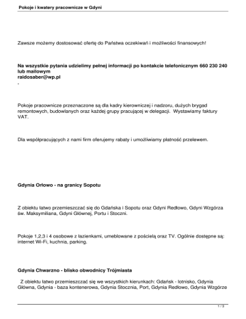 Pokoje i kwatery pracownicze w Gdyni Zawsze możemy dostosować ofertę do Państwa oczekiwań i możliwości finansowych! Na wszystkie pytania udzielimy pełnej informacji po kontakcie telefonicznym 660 230 240 lub mailowym [email protected] . Pokoje pracownicze przeznaczone są dla kadry kierowniczej i nadzoru, dużych brygad remontowych, budowlanych oraz każdej grupy pracującej w delegacji. Wystawiamy faktury VAT. Dla współpracujących z nami firm oferujemy rabaty i umożliwiamy płatność przelewem. Gdynia Orłowo - na granicy Sopotu Z obiektu łatwo przemieszczać się do Gdańska i Sopotu oraz Gdyni Redłowo, Gdyni Wzgórza św. Maksymiliana, Gdyni Głównej, Portu i Stoczni. Pokoje 1,2,3 i 4 osobowe z łazienkami, umeblowane z pościelą oraz TV. Ogólnie dostępne są: internet Wi-Fi, kuchnia, parking. Gdynia Chwarzno - blisko obwodnicy Trójmiasta Z obiektu łatwo przemieszczać się we wszystkich kierunkach: Gdańsk - lotnisko, Gdynia Główna, Gdynia - baza kontenerowa, Gdynia Stocznia, Port, Gdynia Redłowo, Gdynia Wzgórze 1/3 Pokoje i kwatery pracownicze w Gdyni św. Maksymiliana, Rumia, Reda, Wejherowo. Pokoje 1, 2, 3 i 4 osobowe. Pokoje są z łazienkami oraz z dostępem do wspólnych łazienek. W każdym pokoju jest TV. Ogólnodostępne są: internet Wi-Fi, kuchnia, łazienki, parking. CENNIK I WARUNKI REZERWACJI - DLA FIRM I GRUP ZORGANIZOWANYCH Ceny kwater pracowniczych ustalane są w zależności od długości pobytu i ilości osób - od 30 zł do 45 zł brutto. Podstawą rezerwacji jest zamówienie z podaniem szczegółowych danych płatnika wraz z numerem NIP oraz uzgodnienie formy płatności. Wystawiamy faktury VAT. Zobacz galerię kwater pracowniczych >> Idealna lokalizacja i zaciszna okolica naszych obiektów sprzyja zapracowanym gościom W WYPOCZYNKU. 2/3 Pokoje i kwatery pracownicze w Gdyni 3/3