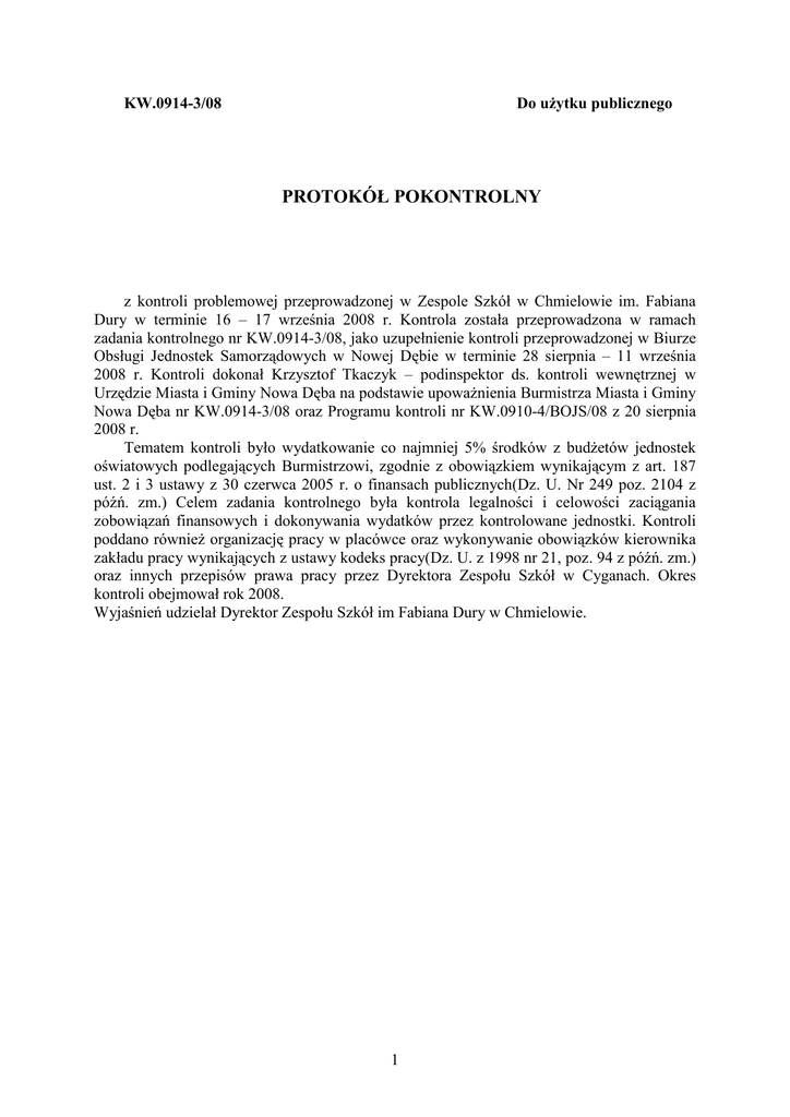 KW.0914-3/08 Do uŜytku publicznego PROTOKÓŁ POKONTROLNY z kontroli problemowej przeprowadzonej w Zespole Szkół w Chmielowie im. Fabiana Dury w terminie 16 – 17 września 2008 r. Kontrola została przeprowadzona w ramach zadania kontrolnego nr KW.0914-3/08, jako uzupełnienie kontroli przeprowadzonej w Biurze Obsługi Jednostek Samorządowych w Nowej Dębie w terminie 28 sierpnia – 11 września 2008 r. Kontroli dokonał Krzysztof Tkaczyk – podinspektor ds. kontroli wewnętrznej w Urzędzie Miasta i Gminy Nowa Dęba na podstawie upowaŜnienia Burmistrza Miasta i Gminy Nowa Dęba nr KW.0914-3/08 oraz Programu kontroli nr KW.0910-4/BOJS/08 z 20 sierpnia 2008 r. Tematem kontroli było wydatkowanie co najmniej 5% środków z budŜetów jednostek oświatowych podlegających Burmistrzowi, zgodnie z obowiązkiem wynikającym z art. 187 ust. 2 i 3 ustawy z 30 czerwca 2005 r. o finansach publicznych(Dz. U. Nr 249 poz. 2104 z późń. zm.) Celem zadania kontrolnego była kontrola legalności i celowości zaciągania zobowiązań finansowych i dokonywania wydatków przez kontrolowane jednostki. Kontroli poddano równieŜ organizację pracy w placówce oraz wykonywanie obowiązków kierownika zakładu pracy wynikających z ustawy kodeks pracy(Dz. U. z 1998 nr 21, poz. 94 z późń. zm.) oraz innych przepisów prawa pracy przez Dyrektora Zespołu Szkół w Cyganach. Okres kontroli obejmował rok 2008. Wyjaśnień udzielał Dyrektor Zespołu Szkół im Fabiana Dury w Chmielowie. 1 I. Prowadzenie Ksiąg Inwentarzowych W ramach czynności kontrolnych sprawdzono księgę inwentarzową Zespołu Szkół w Chmielowie, nazywanego dalej Zespołem Szkół, i inwentarz przyjęty na stan w 2008 r. Księgi inwentarzowe, zgodnie z przepisami zarządzenia Nr 1 Dyrektora Biura Obsługi Jednostek Samorządowych z dnia 20 września 2006 r. w sprawie zasad prowadzenia rachunkowości i ustalania planu kont, są księgami pomocniczymi do ksiąg rachunkowych i zapisuje się w nich środki trwałe długotrwałego uŜytku o wartości nabycia od 150 – 3 500 zł. W Zespole Szkół funkcjonują dwie księgi inwentarzowe. Do jednej wpisuje się wyposaŜenie szkoły podstawowej do drugiej gimnazjum. jedna dla szkoły podstawowej druga dla gimnazjum. KaŜdy nowo nabyty środek trwały zapisuje się pod kolejnym numerem w księdze, podaje się równieŜ cenę jednostkową środka trwałego, ilość sztuk, łączny przychód i datę przychodu, dowody źródłowe oraz miejsce w którym się znajduje. Sprawdzono inwentarz wpisany do księgi inwentarzowej szkoły podstawowej w 2008 r. Wpisano je pod pozycjami 89 - 95. Ich łączna wartość wynosi 2 419 zł. Pod kolejnymi pozycjami znajdują się: 1) drabina rozstawna 1 sztuka, wartość 230 zł, data przychodu 23 stycznia 2008 r. data przychodu 8 stycznia 2008 r., dowód źródłowy f-ra 20/08/5 z 8 stycznia 2008 r. 2) Drukarka HPD1460, wartość 140 zł, data przychodu19 luty 2008 r., dowód źródłowy f-ra F/000934/08, miejsce: gabinet dyrektora. 3) Radiomagnetofon Sony CFD-635CP 1 sztuka, wartość 349 zł, data przychodu 29 maja 2008 r., dowód źródłowy f-ra 478/08/F, miejsce: sala nr 7. 4) Krzesło obrotowe 1 sztuka, wartość 160 zł, data przychodu 27 sierpnia 2008 r., dowód źródłowy f-ra 117/2008, miejsce: sala nr 4. 5) Krzesło styl N 12 sztuk, cena jedn. 79 zł, wartość 947,94 zł, data przychodu 27 sierpnia 2008 r., dowód źródłowy f-ra 117/2008, miejsce: pokój nauczycielski. 6) Biurko pod komputer 1 sztuka, wartość 242,07 zł, data przychodu 27 sierpnia 2008 r., dowód źródłowy f-ra 117/2008, miejsce: sala nr 4. 7) Biurko Marco 1 sztuka, wartość 349,99 zł, data przychodu 27 sierpnia 2008 r., dowód źródłowy f-ra 117/2008, miejsce: sala nr 4. Sprawdzono równieŜ inwentarz wpisany do księgi inwentarzowej gimnazjum w 2008 r. Jego łączna wartość wynosi 5 987 zł. Pod wartością tą kryje się następujące wyposaŜenie: 8) Tablica biała pojedyncza 2 sztuki, cena jedn. 249 zł, wartość 498 zł, data przychodu 13 czerwca 2008 r., dowód źródłowy f-ra 118/06/2008, miejsce: sala nr 4 i 5. 9) Tablica zielona pojedyncza 1 sztuka, wartość 219 zł, data przychodu 13 czerwca 2008 r., dowód źródłowy f-ra 118/06/2008, miejsce: sala nr 4. 10) Stolik SK-4 komputerowy 2-osobowy 10 sztuk, cena jedn. 250 zł, wartość 2 500 zł, data przychodu 18 lipca 2008 r., dowód źródłowy f-ra 114/07/2008, miejsce: sala nr 4. 11) Stolik S21-4 dwuosobowy 4 sztuki, cena jedn. 103 zł, wartość 412 zł, data przychodu 18 lipca 2008 r., dowód źródłowy f-ra 114/07/2008, miejsce: sala nr 4. 12) Krzesło K03 rozm 5 20 sztuk, cena jedn. 58 zł, wartość 1160 zł, data przychodu 18 lipca 2008 r., dowód źródłowy f-ra 114/07/2008, miejsce: sala nr 4. 13) Krzesło K03 rozm 4 10 sztuk, cena jedn. 58 zł, wartość 580 zł, data przychodu 18 lipca 2008 r., dowód źródłowy f-ra 114/07/2008, miejsce: sala nr 4. 14) Stolik S21-5 dwuosobowy 6 sztuk, cena jedn. 103 zł, wartość 618 zł, data przychodu 18 lipca 2008 r., dowód źródłowy f-ra 114/07/2008, miejsce: sala nr 4. 2 Sprawdzono fizyczną obecność wymienionych wyŜej środków trwałych oraz poprawność ich oznakowania – nie stwierdzono nieprawidłowości. Wszystkie faktury na zakup w/w sprzętu były prawidłowo przekazywane do Biura Obsługi Jednostek Samorządowych gdzie prowadzona jest księgowość Zespołu Szkół. Dyrektor Zespołu Szkół przechowuje kopie dowodów źródłowych w odrębnym segregatorze dla celów bezpieczeństwa i kontroli, co stanowi przykład dobrej praktyki. W 2008 r. Zespół Szkół otrzymał ze środków Ministerstwa Edukacji Narodowej i Sportu oraz Europejskiego Funduszu Społecznego pracownie komputerową o łącznej wartości 40 774 zł. Pracownia ta nie został wpisana do księgi inwentarzowej. II. Zakładowy Fundusz Świadczeń Socjalnych Dyrektor Zespołu Szkół zgodnie z obowiązkiem nałoŜonym art. 3 ust. 2 ustawy z 4 marca 1994 r. o zakładowy