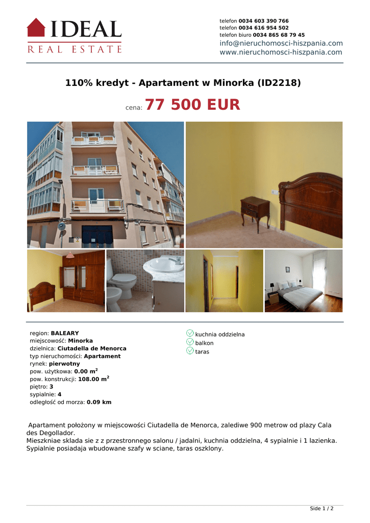 telefon 0034 603 390 766 telefon 0034 616 954 502 telefon biuro 0034 865 68 79 45 [email protected] www.nieruchomosci-hiszpania.com 110% kredyt - Apartament w Minorka (ID2218) cena: region: BALEARY miejscowość: Minorka dzielnica: Ciutadella de Menorca typ nieruchomości: Apartament rynek: pierwotny pow. użytkowa: 0.00 m2 pow. konstrukcji: 108.00 m2 piętro: 3 sypialnie: 4 odległość od morza: 0.09 km 77 500 EUR kuchnia oddzielna balkon taras Apartament położony w miejscowości Ciutadella de Menorca, zalediwe 900 metrow od plazy Cala des Degollador. Mieszkniae sklada sie z z przestronnego salonu / jadalni, kuchnia oddzielna, 4 sypialnie i 1 lazienka. Sypialnie posiadaja wbudowane szafy w sciane, taras oszklony. Side 1 / 2 Finansowanie 110% Zapytaj o dostepne oferty!!! Oprocentowanie euribor + 0,90% www.nieruchomosci-hiszpania.com Side 2 / 2 Powered by TCPDF (www.tcpdf.org)