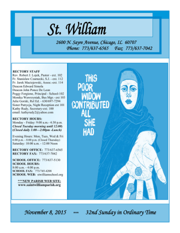St. William 2600 N. Sayre Avenue, Chicago, IL 60707 Phone: 773/637-6565 Fax: 773/637-7042 RECTORY STAFF Rev. Robert J. Lojek, Pastor - ext. 102 Fr. Stanislaw Czarnecki, S.J. - ext. 112 Fr. Jarek Maciejewski, Assoc.-ext. 114 Deacon Edward Simola Deacon John Ponce De Leon Peggy Forgione, Principal - School-102 Monika Wawrzyniak, Bus Mgr.- ext 103 Julie Gorski, Rel Ed. - 630/697-7294 Sister Patrycja, Night Reception ext 101 Kathy Rudy, Secretary-ext. 100 email: [email protected] \ RECTORY HOURS: Monday - Friday: 9:00 a.m.- 4:30 p.m. Closed Tuesday morning until 12:00) (Closed daily 1:00—2:00pm -Lunch) Evening Hours: Mon, Tues, Wed & Fri 6:00 p.m. - 8:00 p.m. (Closed Thursday) Saturday: 10:00 a.m. - 12:00 Noon RECTORY OFFICE: 773/637-6565 RECTORY FAX: 773/637-7042 SCHOOL OFFICE: 773/637-5130 SCHOOL HOURS: 8:00 a.m. - 4:00 p.m. SCHOOL FAX: 773/745-4208 SCHOOL WEB: stwilliamschool.org *** EW PARISH WEB SITE: www.saintwilliamparish.org November 8, 2015 *** 32nd Sunday in Ordinary Time St. William ovember 8, 2015 MASS INTENTIONS SUNDAY, NOVEMBER 8 –STEWARDSHIP SUNDAY 7:30am Frances Penda Forlano Isabel & Dick Thomas Steven Joseph Nowacki Emily & Joseph Pietrzak Mark Oliver Stanley Frank Nowacki 9:00am Florence Wajda Lillian Piekarski –Death Anniv. Anabell Max 10:30am Jerzy Opalinski –8th Month Death Anniv. Apolonia & Franciszek Skarzynski Emilia & Jan Daneccy Jozef & Anna Konieczny Edward Boksa Julian Spychalski –21st Death Anniv. Stanislaw Krepa & Edward Antonina Molo Jozef & Ewa Nowak & Family Nikodem –Happy 1st Birthday! Julia –Happy Birthday! Magda –Happy Birthday! Emilka Szara –Happy Birthday! Krystyna -Happy Birthday! 12:00pm Josephine Esker Deceased of Legion of Mary 2:00pm Jozef Koszut & Zofia Modla Franciszek & Maria Lojek & Parents Seweryn Waksmanski MONDAY, NOVEMBER 9 –Dedication of Lateran Basilica 8:15am Suzanne Corcoran Mr. & Mrs. Greger TUESDAY, NOVEMBER 10 –St. Leo the Great 8:15am Joseph Kozial WEDNESDAY, NOVEMBER 11 –St. Martin of Tours 8:15am Attilio Ricchio Casey Pietrzyk All Living and Deceased Veterans Keating Family 7:00pm Polish Julian Spychalski Anna & Bogdan Bielinski Bozena Niewiadomska Anna Lojek –Happy Birthday! Marcin Matoniak –Happy Birthday! THURSDAY, NOVEMBER 12 –St. Josaphat 8:15am Ryan Freeman 12:00pm Poor Souls in Purgatory FRIDAY, NOVEMBER 13 –St. Frances Xavier Cabrini 8:15am Helen Pocztowski –Death Anniv. John & Bernadine Janicek Family 7:00pm Polish Jozef Koszut & Zofia Modla Continued LITURGICAL CELEBRATION EUCHARISTIC LITURGY: Saturday: 8:15 a.m. & 4:30 p.m. Sunday: 7:30am, 9:00am, 12:00pm & Polish at 10:30am & 2:00pm Monday - Saturday: 8:15 a.m. Mass with rosary starting at 7:30 a.m. Novena to Our Lady of Perpetual Help on Wednesday after English & Polish Mass Polish Mass: Wednesday & Friday 7:00 p.m. SACRAMENTAL LIFE BAPTISM: One Preparation Class is required. The Class will meet on the first Wednesday of the month at 7:30 p.m. in the Rectory Hall. Baptism is celebrated on the second and fourth Sunday of the month, attend Noon Mass then Baptism immediately following. MARRIAGES: An appointment should be made with one of the priests or deacons at least six months prior to the wedding. This should be done before a date or banquet hall is reserved. SACRAMENT OF RECONCILIATION: Saturday: 3:30—4:15 p.m. You may also call the rectory for an appointment. SACRAMENT OF THE SICK: Call the Rectory for a priest. Please do not wait until the person is unconscious or near death. COMMUNION CALLS: If you would like to receive Communion, call the rectory to make arrangements. 773/637-6565 RECTORY HOURS: Daytime: Monday, Wednesday, Thursday, Friday 9:00am—4:30pm. Rectory Closed EVERY TUESDAY MOR I G Tuesday open from oon-1:00 & 2:00-4:30pm Mon.—Fri. closed from 1:00—2:00pm for lunch Evening Hours: Mon, Tues, Wed, & Fri. from 6—8pm, and Saturday 10am—12 (Noon). SATURDAY, NOVEMBER 14 8:15am Josephine Esker John & Bernadine Janicek Family 4:30pm Art & Emma Ricchio Vito Terenzio Louis Nava St. William Page Three WEEK AT A GLANCE NEW amount needed weekly to cover our budgeted expenses is: $7,000 Budget for Weekly Collection ……….....………...$7,000 Weekend Collection……...……………………......$6,781 Under $ ( -219) Please Remember your Parish in your Will! NEXT BIBLE STUDY - NOVEMBER 12th! Our next Bible Study will be on Thursday, November 12th from 7:00 to 8:30 p.m in the Rectory Hall. We will study the upcoming Sunday readings. Sunday, November 8 9:30 am –1:30pm Rel Ed School 302,303,310,312, Lobby Monday, November 9 7:00—9:00pm Parish Pastoral Council –Rectory Hall Tuesday, November 10 7:00—8:30pm RCIA Class –School Library Wednesday, November 11 7:00—8:30pm Confirmation Prep –School Library Thursday, November 12 Noon—5:30 Noon Mass/Eucharistic Adoration –Church 3:00pm Divine Mercy Chaplet/ Polish –Church 5:15pm Divine Mercy Chaplet/ English –Church 7:00—8:30pm Bible Study –Rectory Hall 7:00—8:30pm Girl Scouts –Room 315 & 316 7:30—9:00 Boy Scout Troop 49 –Liebrich Hall Friday, November 13 7:30—9:00pm Polish Bible Study –Rectory Hall 7:00—8:30pm Parent Meeting –Teacher’s Lnge Saturday, November 14 PPP/Manna Gift Cards Sold after all Masses-Church 10:00am—2:00pm Polish School –Rm 300, 302, 303, 310 & 312 10:30am –12:00pm Tiger Scouts –School Rm 315 10:30am—12:00pm Webelos Scouts –Rm 316 6:00—9:00pm Scouts-Pancake Breakfast set up–Liebrich Stop by the rectory to fill out a Facility Scheduling Form to reserve a room or a Cancellation Form. CAREGIVER POSITION WANTED Experienced woman caregiver/housekeeper looking for a come & go position. Long time experience and very good references. Call Janina at 224/875-9077. PLEASE PRAY FOR OUR SICK atalina Kass Elzbieta Mital Mary Targosz Maria Hinojosa Dana Oades John Pugliani orma Bode Jinger Rush Sue Coston Donna Ricchio Joel Rivera Joe Cernack Amanda Bert Leila Bandy Dolores Piccoli Lizette Del Valle Michelle P