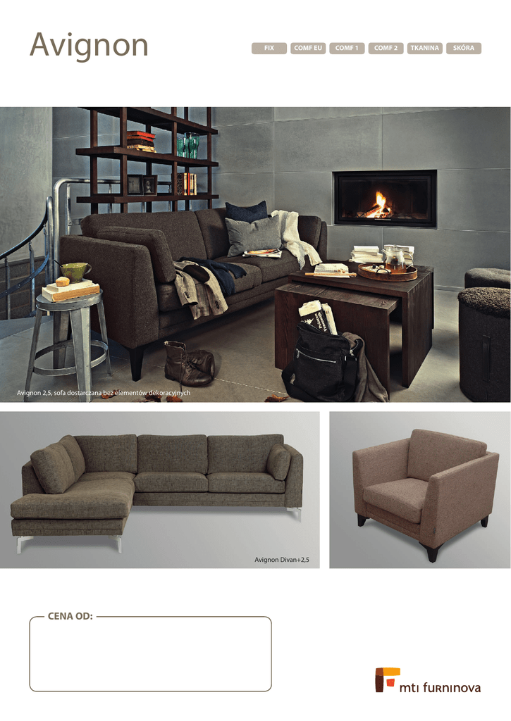 Avignon FIX COMF EU Avignon 2,5, sofa dostarczana bez elementów dekoracyjnych Avignon 2,5, sofa dostarczana bez elementów dekoracyjnych Avignon Divan+2,5 CENA OD: COMF 1 COMF 2 TKANINA SKÓRA Avignon Wymiary* Szerokość • Głębokość • Wysokość** w cm 1 2/2,5 80x83x78 162/183x90x78 3 2C2 3C2 237x237x78 2,5DIV 283x237x78 2,5C2/2,5C2,5 258x203x78 208x90x78 128/149 46 Głębokość siedziska 61 • Wysokość siedziska 43 258x237/258x78 174 3C2,5/3C3 283x258/283x78 PUF 2014 76x60x43 * Wymiary mogą się różnić +/- 3%, w zależności od wyboru tapicerki i konfiguracji. Piktogramy nie odzwierciedlają proporcji i kształtu mebla. Comfort C1 Poduszka siedziska C1 Wkład poduszki siedziska składa się z wysokoelastycznej pianki pokrytej włókniną. Comfort C2 C2 Poduszka siedziska Wkład poduszki siedziska składa się z wysokoelastycznej pianki z topem pierzowym. Poduszka oparciowa włóknina 15 cm pianki wysokoelastycznej pianka wysokoelastyczna pokryta włókniną Poduszka oparciowa top pierzowy 10 cm pianki HR 40 70% pierze 30% włókna silikonowe Poduszka oparciowa Comfort EU EU Poduszka siedziska Wkład poduszki siedziska składa się z wysokoelastycznej pianki pokrytej włókniną. włóknina 15 cm pianki wysokoelastycznej włókna silikonowe Poduszki oparciowe w tkaninie są odwracalne. dostępne nóżki: drewniana AVIGNON 16 cm chromowana MANDALAY 16 cm Kanapa Avignon niejednego zachwyci i uwiedzie swoją niezwykłą prostotą, połączoną z perfekcyjnym wykonaniem na bazie najwyższej klasy materiałów. Projektant odwołał się do podstawowych figur i brył. Kwadrat, prostokąt, prostopadłościan - to wystarczyło, aby powstał model ponadczasowy, trwały i inspirujący do szukania dodatkowych akcesoriów w postaci poduch, narzut, które wyrażą osobowość użytkownika, jego gust i styl życia. Kolekcja Avignon jest bardzo bogata; znajdują się w niej zarówno kanapy, narożniki w różnych rozmiarach, jak i fotel z podnóżkiem. MTI-Furninova Polska Sp. z o.o., ul. Bolesława Chrobrego 3, 11-400 Kętrzyn tel. 89 751 32 65, fax 89 751 51 57, e-mail: [email protected]