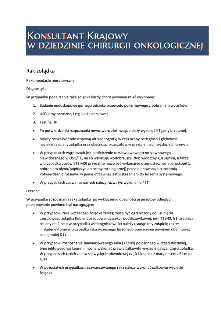 Rak żołądka Rekomendacje merytoryczne Diagnostyka W przypadku podejrzenia raka żołądka każdy chory powinien mieć wykonane: 1. Badanie endoskopowe górnego odcinka przewodu pokarmowego z pobraniem wycinków 2. USG jamy brzusznej i rtg klatki piersiowej 3. Test na HP  Po potwierdzeniu rozpoznania nowotworu złośliwego należy wykonać KT jamy brzusznej.  Należy rozważyć endoskopową ultrasonografię w celu oceny rozległości i głębokości naciekania ściany żołądka oraz obecności przerzutów w przyściennych węzłach chłonnych.  W przypadkach wątpliwych (np. podejrzenie rozsiewu wewnątrzotrzewnowego niewidocznego w USG/TK, na co wskazuje wodobrzusze i/lub widoczny guz jajnika, a także w przypadku guzów ≥T2 M0) przydatne może być wykonanie diagnostycznej laparoskopii (z pobraniem płynu/popłuczyn do oceny cytologicznej) przed planowaną laparotomią. Potwierdzenie rozsiewu w jamie otrzewnej jest wskazaniem do leczenia systemowego.  W przypadkach zaawansowanych należy rozważyć wykonanie PET. Leczenie W przypadku rozpoznania raka żołądka po wykluczeniu obecności przerzutów odległych postępowanie powinno być następujące:  W przypadku raka wczesnego żołądka zabieg może być ograniczony do usunięcia częściowego żołądka (lub endoskopowej dyssekcji podśluzówkowej, jeśli T1aN0, G1, średnica zmiany do 2 cm); w przypadku wieloogniskowości należy usunąć cały żołądek; zakres limfadenektomii w przypadku raka wczesnego leczonego operacyjnie powinien obejmować co najmniej D1+.  W przypadku rozpoznania zaawansowanego raka (≤T2N0) położonego w części dystalnej, typu jelitowego wg Lauren, można wykonać prawie całkowite wycięcie dalszej części żołądka. W przypadkach takich zaleca się wycięcie obwodowej części żołądka z marginesem ≥5 cm od guza.  W pozostałych przypadkach zaawansowanego raka należy wykonać całkowite wycięcie żołądka.  W przypadku rozpoznania zaawansowanego raka żołądka T3-4 N0-3 zaleca się rozważenie okołooperacyjnej chemioterapii (przed i po operacji)  We wszystkich operacjach o charakterze radykalnym (R0) obowiązuje wykonanie limfadenektomii co najmniej D2. Ponadto:  Nie zaleca się rutynowego usuwania śledziony z wyjątkiem przypadków przechodzenia pierwotnego lub węzłowego nacieku na ten narząd.  W przypadku zaawansowanego raka żołądka, gdy drożność przewodu pokarmowego jest zaburzona (nawet gdy stwierdzono rozsiew w jamie otrzewnej), należy rozważyć wykonanie operacji paliatywnej przywracającej pasaż przez przewód pokarmowy.  W nieresekcyjnych przypadkach, przy znacznym zwężeniu światła narządu i objawach podniedrożności lub niedrożności, zwłaszcza w okolicy odźwiernika zaleca się wykonanie zabiegu omijającego albo założenie odżywczej jejunostomii. U każdego chorego z zaawansowanym rakiem żołądka należy rozważyć zastosowanie okołooperacyjnej chemioterapii lub adjuwantowej radiochemioterapii.