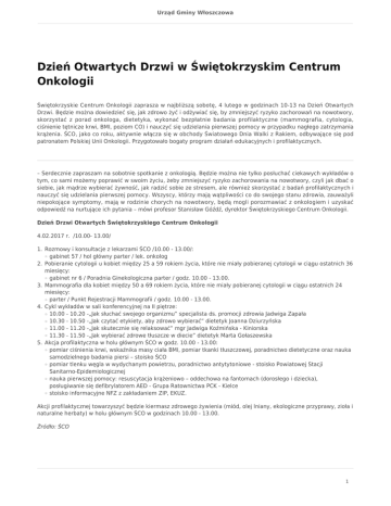 Urząd Gminy Włoszczowa Dzień Otwartych Drzwi w Świętokrzyskim Centrum Onkologii Świętokrzyskie Centrum Onkologii zaprasza w najbliższą sobotę, 4 lutego w godzinach 10-13 na Dzień Otwartych Drzwi. Będzie można dowiedzieć się, jak zdrowo żyć i odżywiać się, by zmniejszyć ryzyko zachorowań na nowotwory, skorzystać z porad onkologa, dietetyka, wykonać bezpłatnie badania profilaktyczne (mammografia, cytologia, ciśnienie tętnicze krwi, BMI, poziom CO) i nauczyć się udzielania pierwszej pomocy w przypadku nagłego zatrzymania krążenia. ŚCO, jako co roku, aktywnie włącza się w obchody Światowego Dnia Walki z Rakiem, odbywające się pod patronatem Polskiej Unii Onkologii. Przygotowało bogaty program działań edukacyjnych i profilaktycznych. – Serdecznie zapraszam na sobotnie spotkanie z onkologią. Będzie można nie tylko posłuchać ciekawych wykładów o tym, co sami możemy poprawić w swoim życiu, żeby zmniejszyć ryzyko zachorowania na nowotwory, czyli jak dbać o siebie, jak mądrze wybierać żywność, jak radzić sobie ze stresem, ale również skorzystać z badań profilaktycznych i nauczyć się udzielania pierwszej pomocy. Wszyscy, którzy mają wątpliwości co do swojego stanu zdrowia, zauważyli niepokojące symptomy, mają w rodzinie chorych na nowotwory, będą mogli porozmawiać z onkologiem i uzyskać odpowiedź na nurtujące ich pytania – mówi profesor Stanisław Góźdź, dyrektor Świętokrzyskiego Centrum Onkologii. Dzień Drzwi Otwartych Świętokrzyskiego Centrum Onkologii 4.02.2017 r. /10.00- 13.00/ 1. Rozmowy i konsultacje z lekarzami ŚCO /10.00 - 13.00/: gabinet 57 / hol główny parter / lek. onkolog 2. Pobieranie cytologii u kobiet między 25 a 59 rokiem życia, które nie miały pobieranej cytologii w ciągu ostatnich 36 miesięcy: gabinet nr 6 / Poradnia Ginekologiczna parter / godz. 10.00 - 13.00. 3. Mammografia dla kobiet między 50 a 69 rokiem życia, które nie miały pobieranej cytologii w ciągu ostatnich 24 miesięcy: parter / Punkt Rejestracji Mammografii / godz. 10.00 - 13.00. 4. Cykl wykładów w sali konferencyjnej na II piętrze: 10.00 - 10.20 -„Jak słuchać swojego organizmu” specjalista ds. promocji zdrowia Jadwiga Zapała 10.30 - 10.50 -„Jak czytać etykiety, aby zdrowo wybierać” dietetyk Joanna Dziurzyńska 11.00 - 11.20 -„Jak skutecznie się relaksować” mgr Jadwiga Koźmińska - Kiniorska 11.30 - 11.50 -„Jak wybierać zdrowe tłuszcze w diecie” dietetyk Marta Gołaszewska 5. Akcja profilaktyczna w holu głównym ŚCO w godz. 10.00 - 13.00: pomiar ciśnienia krwi, wskaźnika masy ciała BMI, pomiar tkanki tłuszczowej, poradnictwo dietetyczne oraz nauka samodzielnego badania piersi – stoisko ŚCO pomiar tlenku węgla w wydychanym powietrzu, poradnictwo antytytoniowe - stoisko Powiatowej Stacji Sanitarno-Epidemiologicznej nauka pierwszej pomocy: resuscytacja krążeniowo – oddechowa na fantomach (dorosłego i dziecka), posługiwanie się defibrylatorem AED - Grupa Ratownictwa PCK - Kielce stoisko informacyjne NFZ z zakładaniem ZIP, EKUZ. ❍ ❍ ❍ ❍ ❍ ❍ ❍ ❍ ❍ ❍ ❍ Akcji profilaktycznej towarzyszyć będzie kiermasz zdrowego żywienia (miód, olej lniany, ekologiczne przyprawy, zioła i naturalne herbaty) w holu głównym ŚCO w godzinach 10.00 - 13.00. Żródło: ŚCO 1