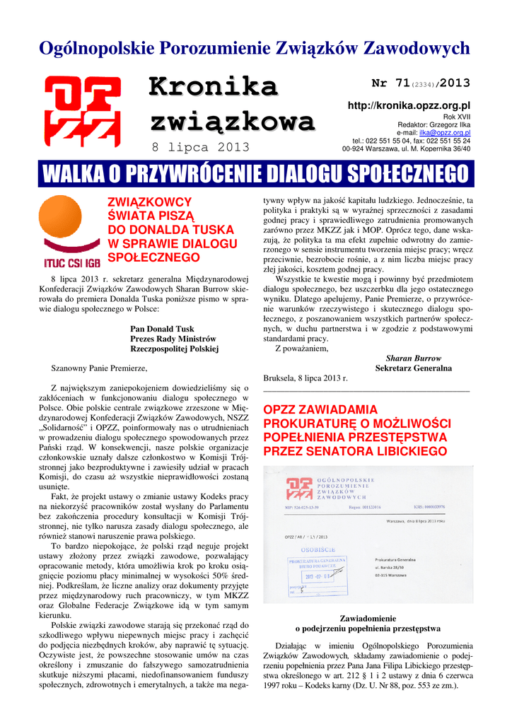 Ogólnopolskie Porozumienie Związków Zawodowych Kronika związkowa 8 lipca 2013 Nr 71(2334)/2013 http://kronika.opzz.org.pl Rok XVII Redaktor: Grzegorz Ilka e-mail: [email protected] tel.: 022 551 55 04, fax: 022 551 55 24 00-924 Warszawa, ul. M. Kopernika 36/40 WALKA O PRZYWRÓCENIE DIALOGU SPOŁECZNEGO ZWIĄZKOWCY ŚWIATA PISZĄ DO DONALDA TUSKA W SPRAWIE DIALOGU SPOŁECZNEGO 8 lipca 2013 r. sekretarz generalna Międzynarodowej Konfederacji Związków Zawodowych Sharan Burrow skierowała do premiera Donalda Tuska poniższe pismo w sprawie dialogu społecznego w Polsce: Pan Donald Tusk Prezes Rady Ministrów Rzeczpospolitej Polskiej Szanowny Panie Premierze, Z największym zaniepokojeniem dowiedzieliśmy się o zakłóceniach w funkcjonowaniu dialogu społecznego w Polsce. Obie polskie centrale związkowe zrzeszone w Międzynarodowej Konfederacji Związków Zawodowych, NSZZ „Solidarność” i OPZZ, poinformowały nas o utrudnieniach w prowadzeniu dialogu społecznego spowodowanych przez Pański rząd. W konsekwencji, nasze polskie organizacje członkowskie uznały dalsze członkostwo w Komisji Trójstronnej jako bezproduktywne i zawiesiły udział w pracach Komisji, do czasu aż wszystkie nieprawidłowości zostaną usunięte. Fakt, że projekt ustawy o zmianie ustawy Kodeks pracy na niekorzyść pracowników został wysłany do Parlamentu bez zakończenia procedury konsultacji w Komisji Trójstronnej, nie tylko narusza zasady dialogu społecznego, ale również stanowi naruszenie prawa polskiego. To bardzo niepokojące, że polski rząd neguje projekt ustawy złożony przez związki zawodowe, pozwalający opracowanie metody, która umożliwia krok po kroku osiągnięcie poziomu płacy minimalnej w wysokości 50% średniej. Podkreślam, że liczne analizy oraz dokumenty przyjęte przez międzynarodowy ruch pracowniczy, w tym MKZZ oraz Globalne Federacje Związkowe idą w tym samym kierunku. Polskie związki zawodowe starają się przekonać rząd do szkodliwego wpływu niepewnych miejsc pracy i zachęcić do podjęcia niezbędnych kroków, aby naprawić tę sytuację. Oczywiste jest, że powszechne stosowanie umów na czas określony i zmuszanie do fałszywego samozatrudnienia skutkuje niższymi płacami, niedofinansowaniem funduszy społecznych, zdrowotnych i emerytalnych, a także ma nega- tywny wpływ na jakość kapitału ludzkiego. Jednocześnie, ta polityka i praktyki są w wyraźnej sprzeczności z zasadami godnej pracy i sprawiedliwego zatrudnienia promowanych zarówno przez MKZZ jak i MOP. Oprócz tego, dane wskazują, że polityka ta ma efekt zupełnie odwrotny do zamierzonego w sensie instrumentu tworzenia miejsc pracy; wręcz przeciwnie, bezrobocie rośnie, a z nim liczba miejsc pracy złej jakości, kosztem godnej pracy. Wszystkie te kwestie mogą i powinny być przedmiotem dialogu społecznego, bez uszczerbku dla jego ostatecznego wyniku. Dlatego apelujemy, Panie Premierze, o przywrócenie warunków rzeczywistego i skutecznego dialogu społecznego, z poszanowaniem wszystkich partnerów społecznych, w duchu partnerstwa i w zgodzie z podstawowymi standardami pracy. Z poważaniem, Sharan Burrow Sekretarz Generalna Bruksela, 8 lipca 2013 r. ________________________________________________ OPZZ ZAWIADAMIA PROKURATURĘ O MOŻLIWOŚCI POPEŁNIENIA PRZESTĘPSTWA PRZEZ SENATORA LIBICKIEGO Zawiadomienie o podejrzeniu popełnienia przestępstwa Działając w imieniu Ogólnopolskiego Porozumienia Związków Zawodowych, składamy zawiadomienie o podejrzeniu popełnienia przez Pana Jana Filipa Libickiego przestępstwa określonego w art. 212 § 1 i 2 ustawy z dnia 6 czerwca 1997 roku – Kodeks karny (Dz. U. Nr 88, poz. 553 ze zm.). Kronika związkowa nr 71(2334)/2013 – strona 2 W związku z powyższym na podstawie art. 297 Kodeksu postępowania karnego wnosimy o wszczęcie postępowania przygotowawczego i podjęcie niezbędnych czynności procesowych. Uzasadnienie W dniu 28 czerwca 2013 roku na stronie internetowej: jflibicki.salon24.pl ukazał się artykuł Jana Filipa Libickiego zatytułowany „ Donald! Po partiach weź się za związkowców!”. W artykule Pan Libicki prezentuje swoje poglądy w kwestii działania organizacji związkowych w Polsce. W publikacji tej pojawiły się takie stwierdzenia jak: „rozprawmy się z ich przywilejami, gangsterskimi metodami i ukradzionymi firmom etatami.” Nie ulega wątpliwości, że przypisanie związkom zawodowych przez Pana Libickiego właściwości takich jak: „gangsterskie metody” czy też „ukradzione firmom etaty” stanowi ewidentne poniżenie ich w opinii publicznej i naruszenie dóbr osobistych. W innych swoich artykułach zamieszczonych na jflibicki.blog.onet.pl Pan Libicki wielokrotnie używa pejoratywnych określeń związków zawodowych i prowadzonej przez nie działalności, np.: „projekt antyzwiązkowej ustawy”, „najważniejsi bossowie związkowych gangów”, „związkowi awanturnicy”, „żeby się nie okazało, że pieniądze pracodawców idą np. na cygara, samochody lub garnitury związkowych bossów”, „kto przykręci śrubę związkowym awanturnikom”, „to co dziś działa w Polsce pod nazwą związków zawodowych, to nie są żadne związki – to są polityczne gangi”. Trudno oczekiwać, aby każdy zgadzał się z działalnością związkową czy też akceptował związki zawodowe. Można się spierać o efekty ich działalności, mieć negatywne lub pozytywne podejście, w sposób nawet dość bezpośredni formułować swoje opinie, ale należy to robić w sposób dozwolony prawnie, nie godzący w dobra osobiste i nie powodujący utraty zaufania potrzebnego do wykonywania działalności. Szczególnej kultury wypowiedzi w tym zakresie należałoby oczekiwać od parlamentarzysty zasiadającego w Senacie RP. Niestety, w wielu wypowiedziach Pan Libicki obraża związki zawodowe porównując je do gangsterskich organizacji i sugerując okradanie pracodawców. Są to działania naruszające 